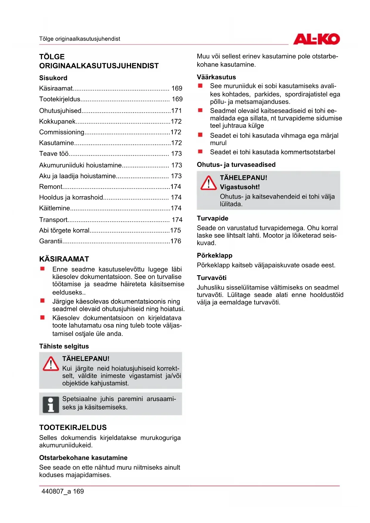 Téléchargez la notice de votre Muruniiduk au format PDF gratuitement ! Retrouvez votre notice Comfort 38.4 Li - AL-KO et reprennez votre appareil électronique en main. Sur cette page sont publiés tous les documents nécessaires à l'utilisation de votre appareil Comfort 38.4 Li de la marque AL-KO.