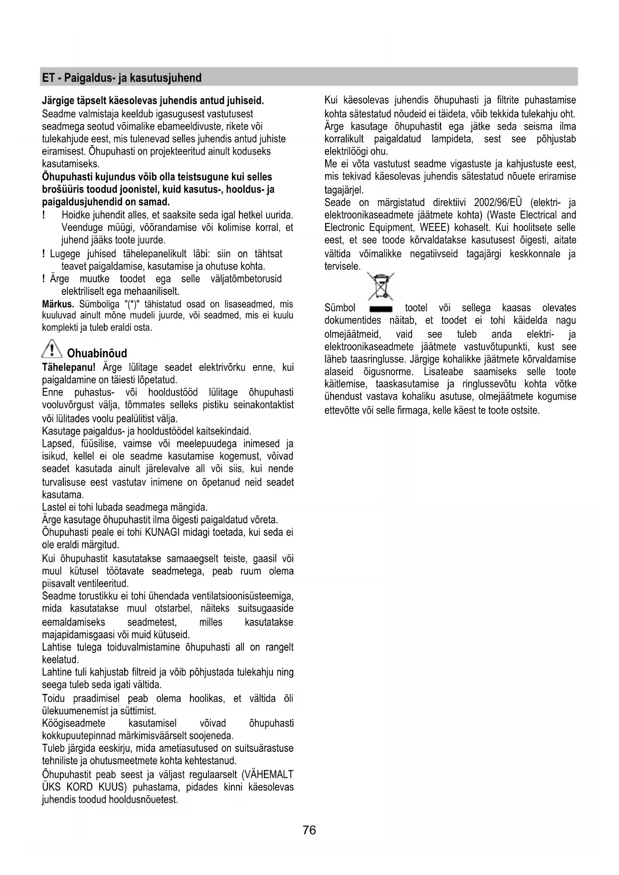 Kui kaesolevas juhendis ohpuhasti ja filtrite puhastamise kohta satestatud noueid ei taideta, vob tekkida talekahju oht. Arge kasutage ohpuhastit ega jatke seda seisma ilma korralikult paigaldatud lampideta, sest see pohjustab elektriloo gi ohu.