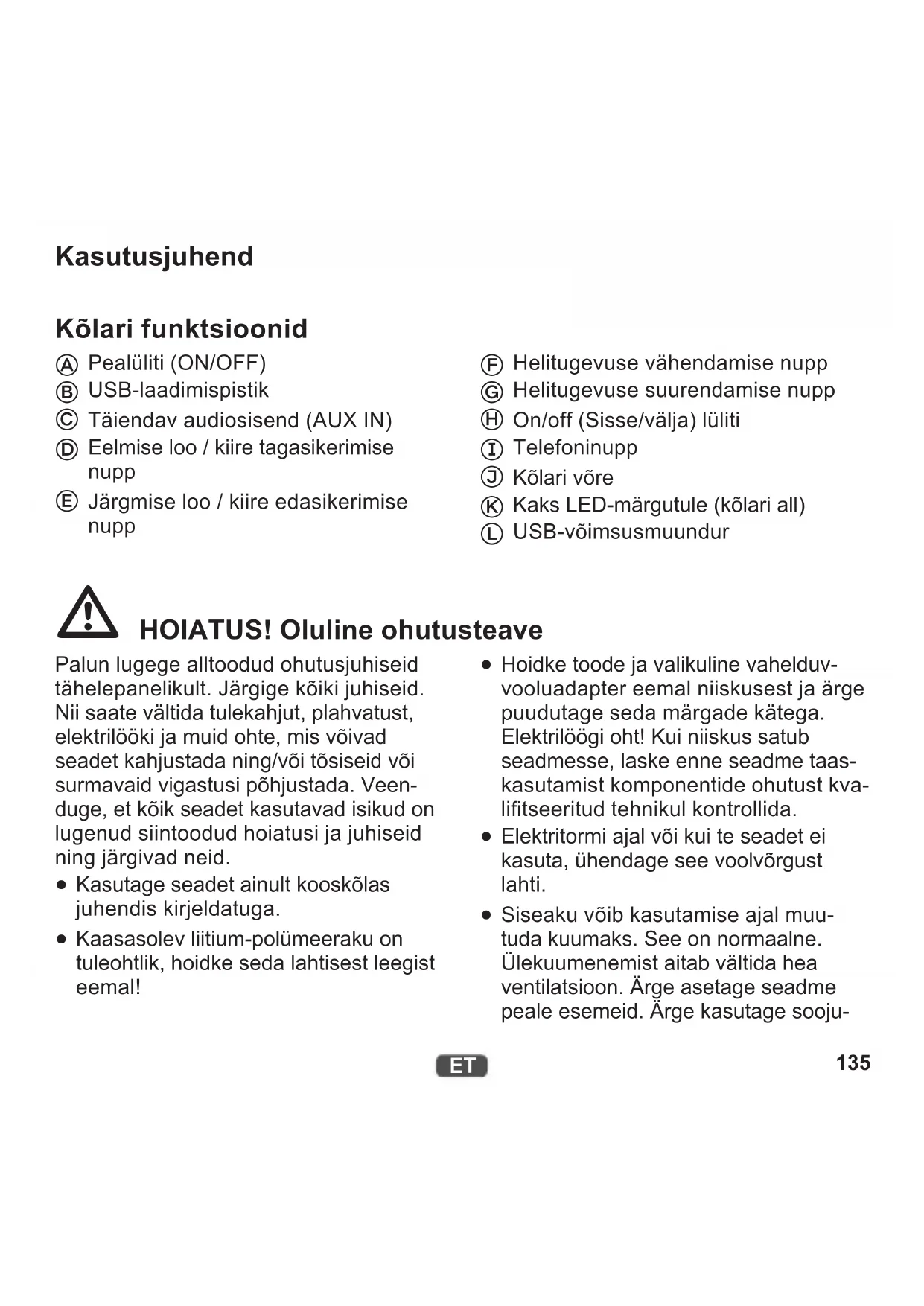susmuundur lähedalasuvasse pisti- kupessa. Aku laadimise ajal vilguvad kaks LED- märgutule siniselt. Laadimise lõppe- misel LED-märgutuli kustub. Kõlar lülitatakse välja. LED-märgutulede tähendus Värvus Olek Tähendus Sinine Põleb püsivalt Bluetooth-ühendus on loodud Vilgub Bluetooth-ühendus on katkenud või toodet laaditakse Punane Põleb püsivalt Bluetooth-ühendus on loodud, kuid aku on tühi Vilgub Bluetooth-ühendus on katkenud ja aku on tühi Sinine/ punane Vilgub Paarimisrežiim on aktiivne Sinine/ punane Väljas Kõlar on välja lülitatud138