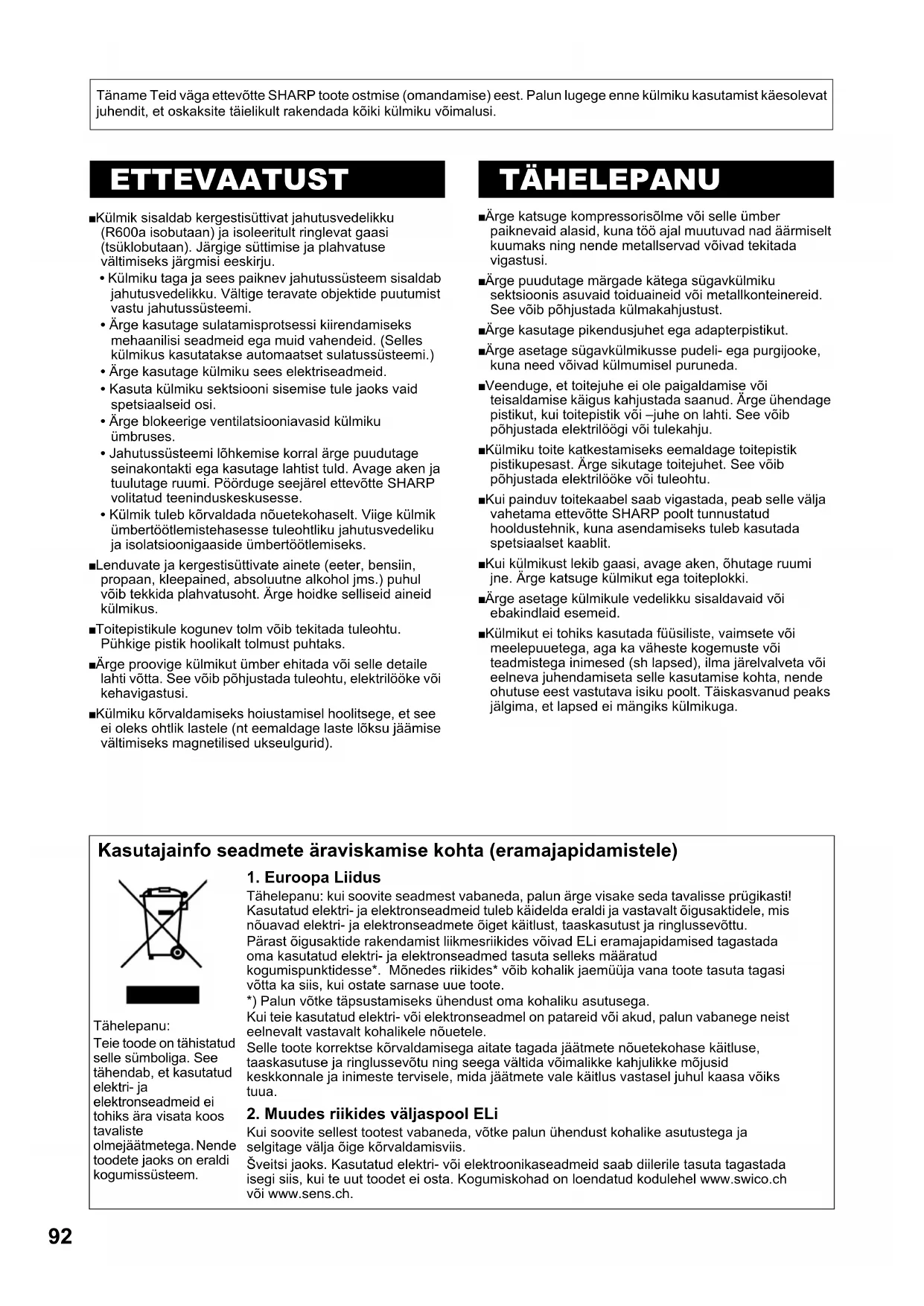 Täname Teid väga ettevõtte SHARP toote ostmise (omandamise) eest. Palun lugege enne külmiku kasutamist käesolevat
