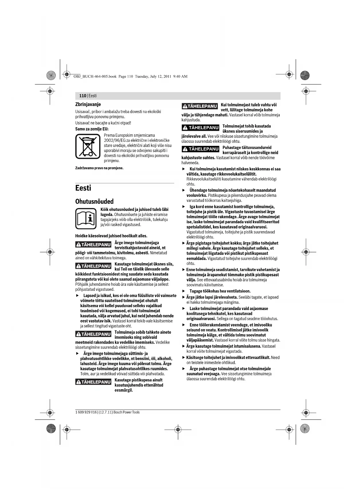 TÄHELEPANU TÄHELEPANU TÄHELEPANU TÄHELEPANU TÄHELEPANU TÄHELEPANU TÄHELEPANU OBJ_BUCH-464-005.book Page 110 Tuesday, July 12, 2011 9:40 AMEesti | 111 Bosch Power Tools 1 609 929 V16 | (12.7.11) Sümbolid