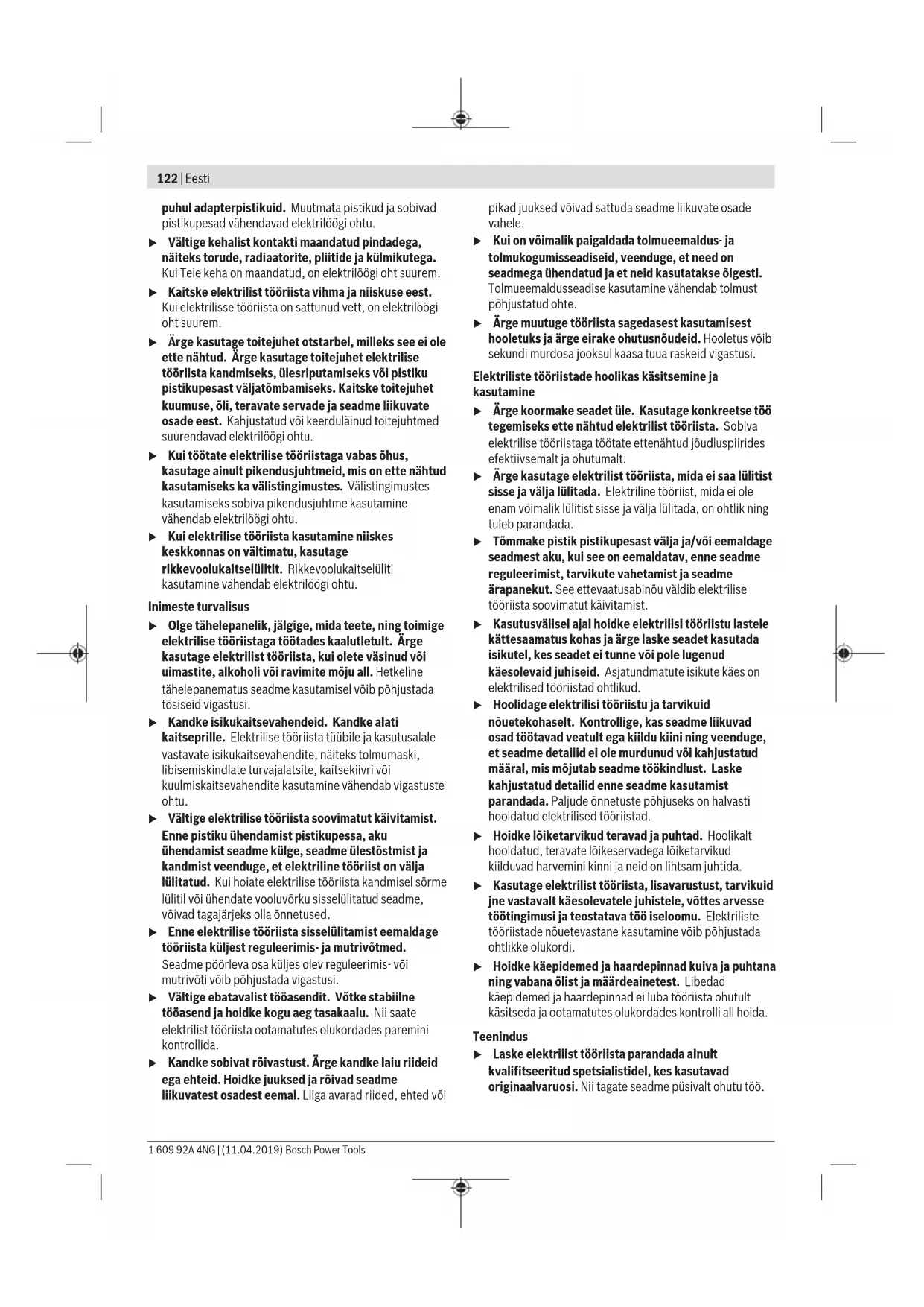 kasutage kaitsemaandusega elektriliste tööriistade Bosch Power Tools 1 609 92A 4NG | (11.04.2019)122 | Eesti