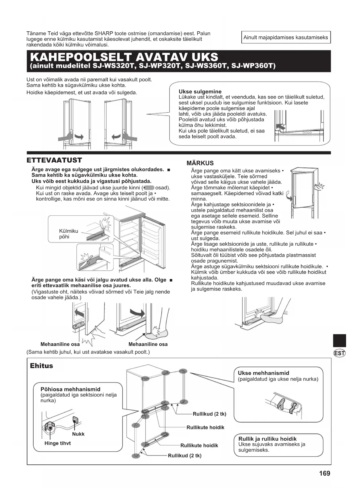 HOOLDUS JA PUHASTAMINE ENNE MEHAANIKU KUTSUMIST ETTEVAATUST Kõigepealt tõmmake välja külmiku toitepistik, et ■vältida elektrilööki.Ärge valage vett otse korpuse välis- või ■siseküljele. See võib põhjustada roostetamist või elektriisolatsiooni lagunemist. TÄHELEPANU Sisepindade ja plastikosade mõranemise vältimiseks järgige neid soovitusi.Pühkige ära kõik plastikosade külge sattunud toidurasvad.• Mõned majapidamises kasutatavad puhastusvahendid • võivad külmikut kahjustada, seepärast kasutage ainult lahjendatud pesuvedelikku (seebivett).Kui kasutatakse lahustamata pesuvahendit või kui • pesuvahendi jääke ei pühita korralikult maha, võivad plastikosadesse tekkida mõrad. 1 Eemaldage külmiku seest ja ukse küljest kogu lisavarustus, nt riiulid. Peske neid sooja veega, millele on lisatud veidi nõudepesuvahendit; loputage puhtas vees ja kuivatage. 2 Puhastage külmiku sisemust nõudepesuvahendit sisaldavas soojas vees niisutatud lapiga. Seejärel pühkige puhastusvahend külma vee abil maha. 3 Kasutage külmkapi välispinna puhastamiseks ainult pehmet lappi. 4 Magnetilise uksesulguri puhastamiseks kasutage hambaharja ja sooja vett, kuhu on lisatud veidi nõudepesuvahendit. 5 Pühkige juhtpaneeli kuiva lapiga. MÄRKUS Külmiku kahjustamise vältimiseks ärge kasutage • tugevatoimelisi puhasteid või lahusteid (lakk, värv, lihvpulber, keeva vett jne).Kui külmiku pistik on kontaktist välja tõmmatud, oodake enne • selle tagasipanekut vähemalt 5 minutit.Iga klaasriiul kaalub umbes 2 kg. Hoidke neist kindlalt kinni, • kui eemaldate nad külmikust või kannate teise kohta.Mahla või muu taolise juhtpaneeli ümbrusesse tilkumisel • pühkige see kohe ära. See võib põhjustada juhtpaneeli riket.Ärge visake esemeid külmiku põrandale ega asetage pudeleid • vm. hooletult vastu külmiku siseseina. Külmiku sisemus võib mõraneda. Sulatamine Tänu ainulaadsele energiasäästusüsteemile toimub külmiku sulatamine täisautomaatselt. Kui sisevalgustus läbi põleb Pöörduge sisevalgustuse vahetuslambi saamiseks lähima SHARPi poolt volitatud remonditeenuse pakkuja poole. Sisevalgustuse lamp tuleb eemaldada ainult kvalitseeritud teeninduspersonali poolt. Külmiku väljalülitamine Kui lahkute pikemaks ajaks kodust ja tahate külmiku välja lülitada, eemaldage sellest kõik toiduained ja puhastage hoolikalt selle sisemus. Tõmmake toitepistik kontaktist välja ja jätke kõik külmiku uksed lahti.Enne mehaaniku poole pöördumist vaadake üle järgmised punktid. Probleem Lahendus Külmiku väliskorpus on puudutamisel kuum. See on normaalne. Korpuses asub kuum toru, mille ülesanne on vältida kondensaadi ladestumist külmikule.Külmik teeb müra. Külmiku töötamisel on järgnevate helide kostumine täiesti normaalne.Kompressori poolt töö alustamisel tekitatav vali heli • --- mõne aja pärast jääb heli vaiksemaks.Kompressori poolt üks kord päevas tekitatav vali heli • --- kompressor tekitab seda heli pärast automaatset sulatamisprotseduuri.Voolava vedeliku helid (korisevad, kihisevad helid) • --- neid helisid tekitab torudes voolav jahutusvedelik (periooditi võivad need olla tavapärasest valjemad).Praksuvad või ragisevad helid, kriuksuvad helid • --- neid helisid tekitab külmiku sisedetailide paisumine ja kokkutõmbumine.Härmatis või kondensaadi ladestumine külmiku sees või väljas. See võib aset leida järgmistel juhtudel. Härmatise pühkimiseks kasutage märga ja kondensaadi pühkimiseks kuiva lappi.Väliskeskkonna kõrge niiskuse korral.• Ukse sageli avamisel ja sulgemisel.• Suure niiskusesisaldusega toiduainete hoidmisel. (Need tuleb sisse mähkida.)• Toiduained külmikusektsioonis jäätuvad.Kas külmik on töötanud pikka aega külmiku temp. regulaatoriga asendis 0°C?• Kas külmik on töötanud pikka aega sügavülmiku temp. regulaatoriga asendis -21°C?• Kui ümbritseva ruumi temperatuur on madal, võivad toiduained külmikus külmuda ka • siis, kui külmiku temp. reguleerimine on seatud väärtusele 6°C. Sektsioonis on tunda lõhna. Tugeva lõhnaga toiduained tuleb sisse mähkida.• Lõhnaeemaldussõlm ei suuda kogu lõhna kõrvaldada.• KUI TE SIISKI VAJATE MEHAANIKU ABI Pöörduge lähima SHARPi poolt volitatud remonditeenuse pakkuja poole. (B144)-East.indb 11 2011/01/31 15:32:40180