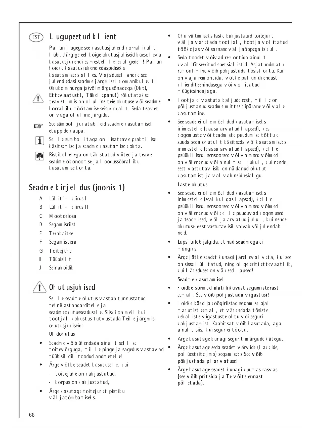- odredba o elek trom agnetni združljivosti 89 /336/EEC vk ljučno z m odifik acijam i 9 2/31/EEC in 9 3/68/EEC.66 Lugupeetud k lient Palun lugege see k asutusjuh end k orralik ult läbi. Järgige eelk õige oh utusjuh iseid k äesoleva k asutusjuh endi esim estel leh ek ülgedel! Palun h oidk e k asutusjuh end edaspidisek s k asutam isek s alles. Vajadusel andk e see juh end edasi seadm e järgm isele om anik ule. 1 Oh uk olm nurga ja/või m ärgusõnadega (Oh t!, Ettevaatust!, Täh elepanu!) rõh utatak se teavet, m is on oluline teie oh utuse või seadm e k orralik u töötam ise seisuk oh alt. Seda teavet on väga oluline järgida. See süm bol juh atab Teid seadm e k asutam isel etappide k aupa. Selle süm boli taga on lisateave prak tilise k äsitsem ise ja seadm e k asutam ise k oh ta. Ristik uleh ega on täh istatud viited ja teave seadm e ök onoom se ja loodussõbralik u k asutam ise k oh ta. Seadm e k irjeldus (joonis 1) A Lüliti – k iirus I B Lüliti – k iirus II C M ootoriosa D Segam isriist E Terak aitse F Segam istera G Toitejuh e H Tüübisilt J Seinah oidik Oh utusjuh ised Selle seadm e oh utus vastab tunnustatud teh nik astandarditele ja seadm eoh utusseadusele. Siisk i on m eil k ui tootjal k oh ustus tutvustada Teile järgm isi oh utusjuh iseid: Üldoh utus
