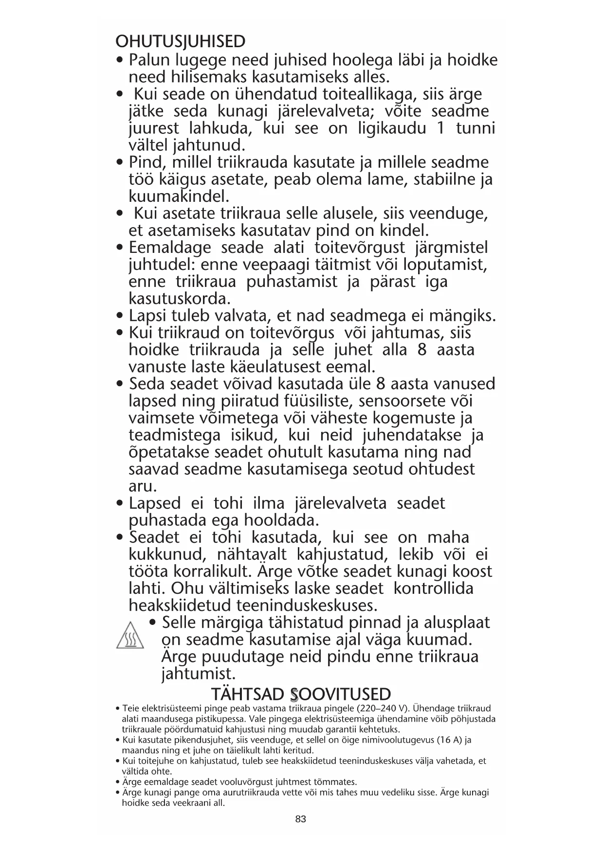 - Seda seadet võivad kasutada üle 8 aasta vanused lapsed ning piiratud füüsiliste, sensoorsete või vaimsete võimetega või väheste kogemuste ja teadmistega isikud, kui neid juhendatakse ja õpetatakse seadet ohutult kasutama ning nad saavad seadme kasutamisega seotud ohtudest aru.