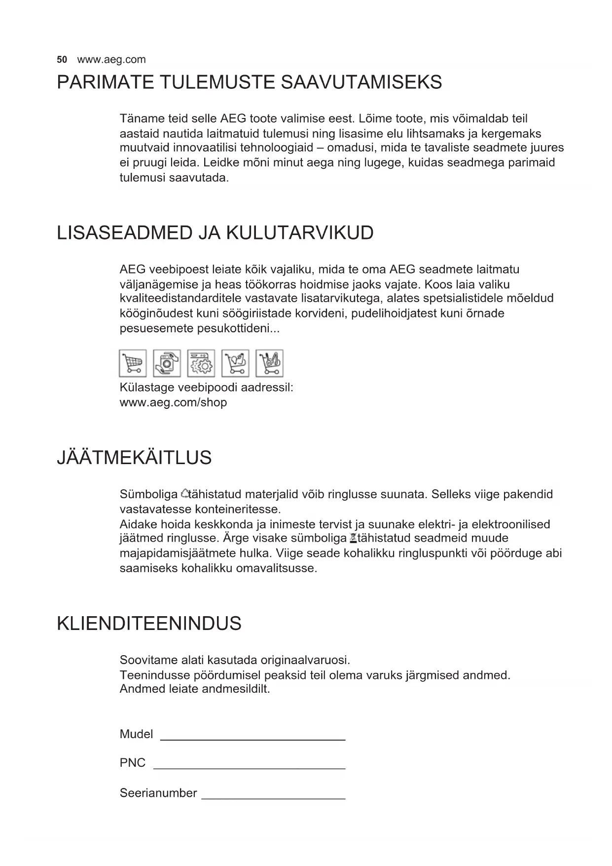 PARIMATE TULEMUSTE SAAVUTAMISEKS Täname teid selle AEG toote valimise eest. Lõime toote, mis võimaldab teil