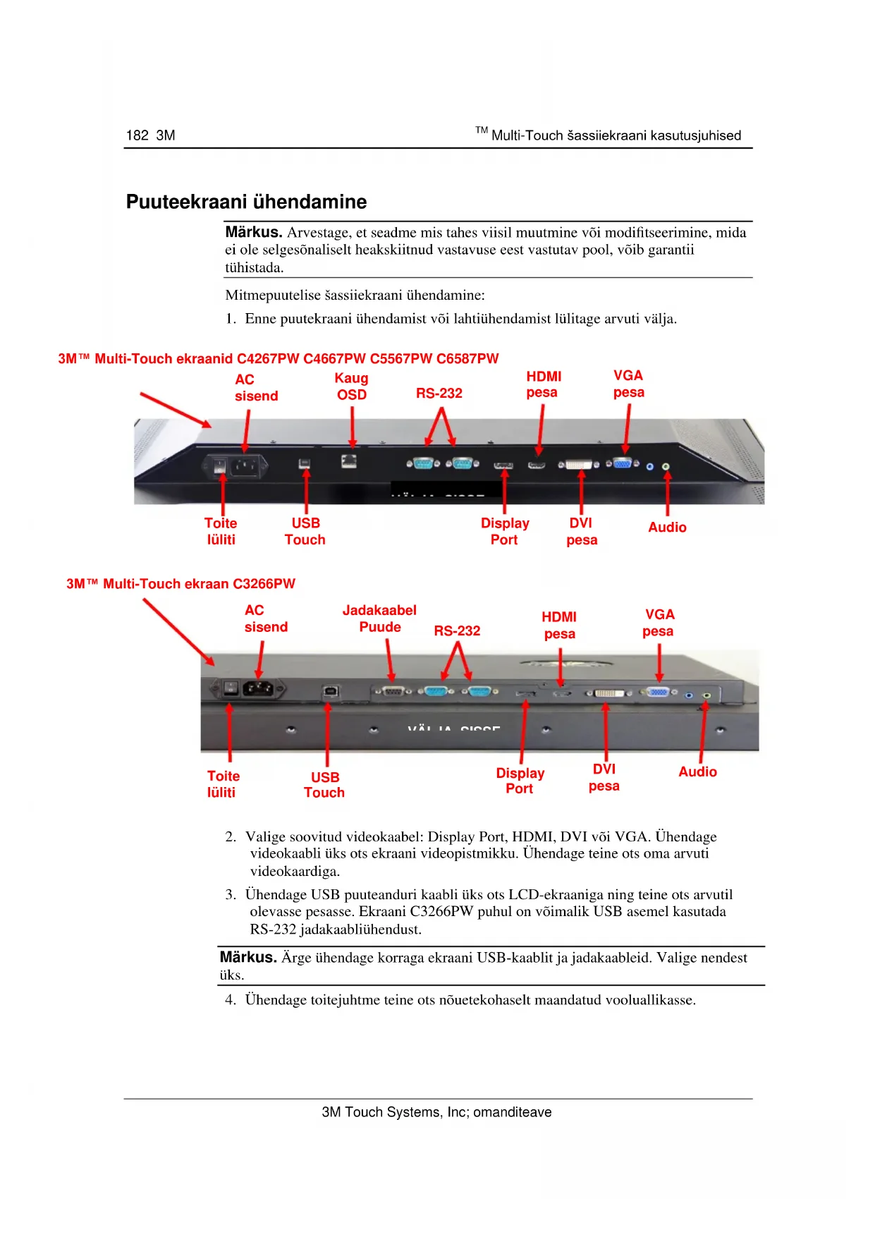 Multi-Touch šassiiekraani kasutusjuhised 3M Touch Systems, Inc; omanditeave Puuteekraani ühendamine Märkus. Arvestage, et seadme mis tahes viisil muutmine või modifitseerimine, mida ei ole selgesõnaliselt heakskiitnud vastavuse eest vastutav pool, võib garantii tühistada. Mitmepuutelise šassiiekraani ühendamine: