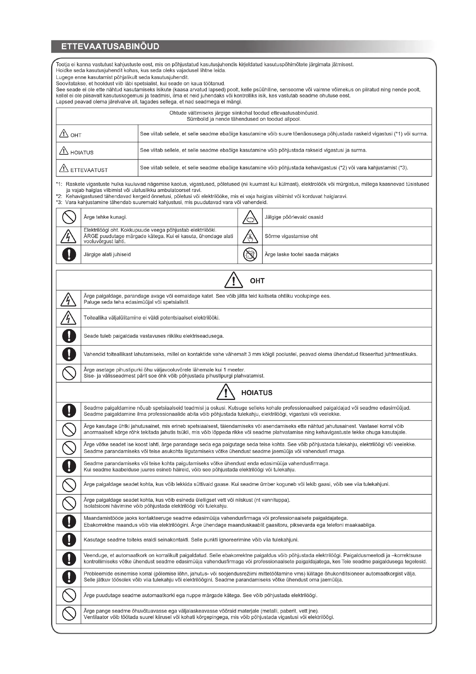 Този шум е нормален и идва от разширяването/свиването на пластмасата. Забележка: Позиции 2 до 6 за модела за отопление Условия на работа на климатика Темпер.Режим на работаВъншна температура Вътрешна температура Отопление –15°C ~ 24°C По-малко от 28°C Охлаждане –10°C ~ 46°C 21°C ~ 32°CИзсушаване –10°C ~ 46°C 17°C ~ 32°C BGETTEVAATUSABINÕUD Tootja ei kanna vastutust kahjustuste eest, mis on põhjustatud kasutusjuhendis kirjeldatud kasutuspõhimõtete järgimata jätmisest. Hoidke seda kasutusjuhendit kohas, kus seda oleks vajadusel lihtne leida.Lugege enne kasutamist põhjalikult seda kasutusjuhendit.Soovitatakse, et hooldust viib läbi spetsialist, kui seade on kaua töötanud. See seade ei ole ette nähtud kasutamiseks isikute (kaasa arvatud lapsed) poolt, kelle psüühiline, sensoorne või vaimne võimekus on piiratud ning nende poolt, kellel ei ole piisavalt kasutuskogemusi ja teadmisi, ilma et neid juhendaks või kontrolliks isik, kes vastutab seadme ohutuse eest. Lapsed peavad olema järelvalve all, tagades sellega, et nad seadmega ei mängi.Ohtude vältimiseks järgige siinkohal toodud ettevaatusabinõusid.Sümbolid ja nende tähendused on toodud allpool. 0 OHT See viitab sellele, et selle seadme ebaõige kasutamine võib suure tõenäosusega põhjustada raskeid vigastusi (*1) või surma. 0 HOIATUS See viitab sellele, et selle seadme ebaõige kasutamine võib põhjustada rakseid vigastusi ja surma. 0 ETTEVAATUST See viitab sellele, et selle seadme ebaõige kasutamine võib põhjustada kehavigastusi (*2) või vara kahjustamist (*3). *1: Raskete vigastuste hulka kuuluvad nägemise kaotus, vigastused, põletused (nii kuumast kui külmast), elektrolöök või mürgistus, millega kaasnevad tüsistused ja vajab haiglas viibimist või ulatuslikku ambulatoorset ravi. *2: Kehavigastused tähendavad kergeid õnnetusi, põletusi või elektrilööke, mis ei vaja haiglas viibimist või korduvat haiglaravi. *3: Vara kahjustamine tähendab suuremaid kahjustusi, mis puudutavad vara või vahendeid. Ärge tehke kunagi. Jälgige pöörlevaid osasid Elektrilöögi oht. Kokkupuude veega põhjustab elektrilööki.ÄRGE puudutage märgade kätega. Kui ei kasuta, ühendage alati vooluvõrgust lahti. Sõrme vigastamise oht Järgige alati juhiseid Ärge laske tootel saada märjaks