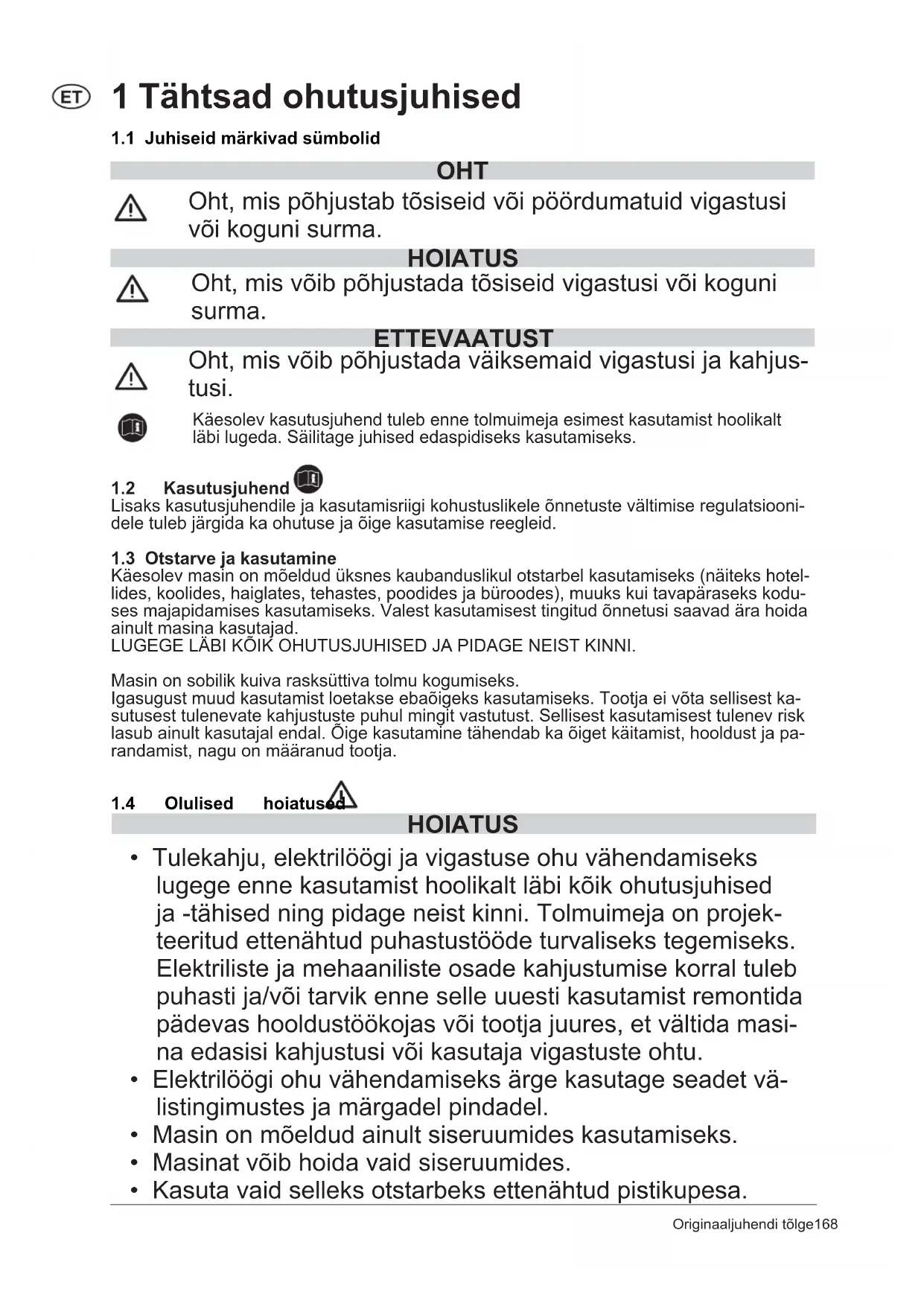 - Tulekahju, elektrilöögi ja vigastuse ohu vähendamiseks lugege enne kasutamist hoolikalt läbi kõik ohutusjuhised ja -tähised ning pidage neist kinni. Tolmuimeja on projek- teeritud ettenähtud puhastustööde turvaliseks tegemiseks. Elektriliste ja mehaaniliste osade kahjustumise korral tuleb puhasti ja/või tarvik enne selle uuesti kasutamist remontida pädevas hooldustöökojas või tootja juures, et vältida masi- na edasisi kahjustusi või kasutaja vigastuste ohtu.