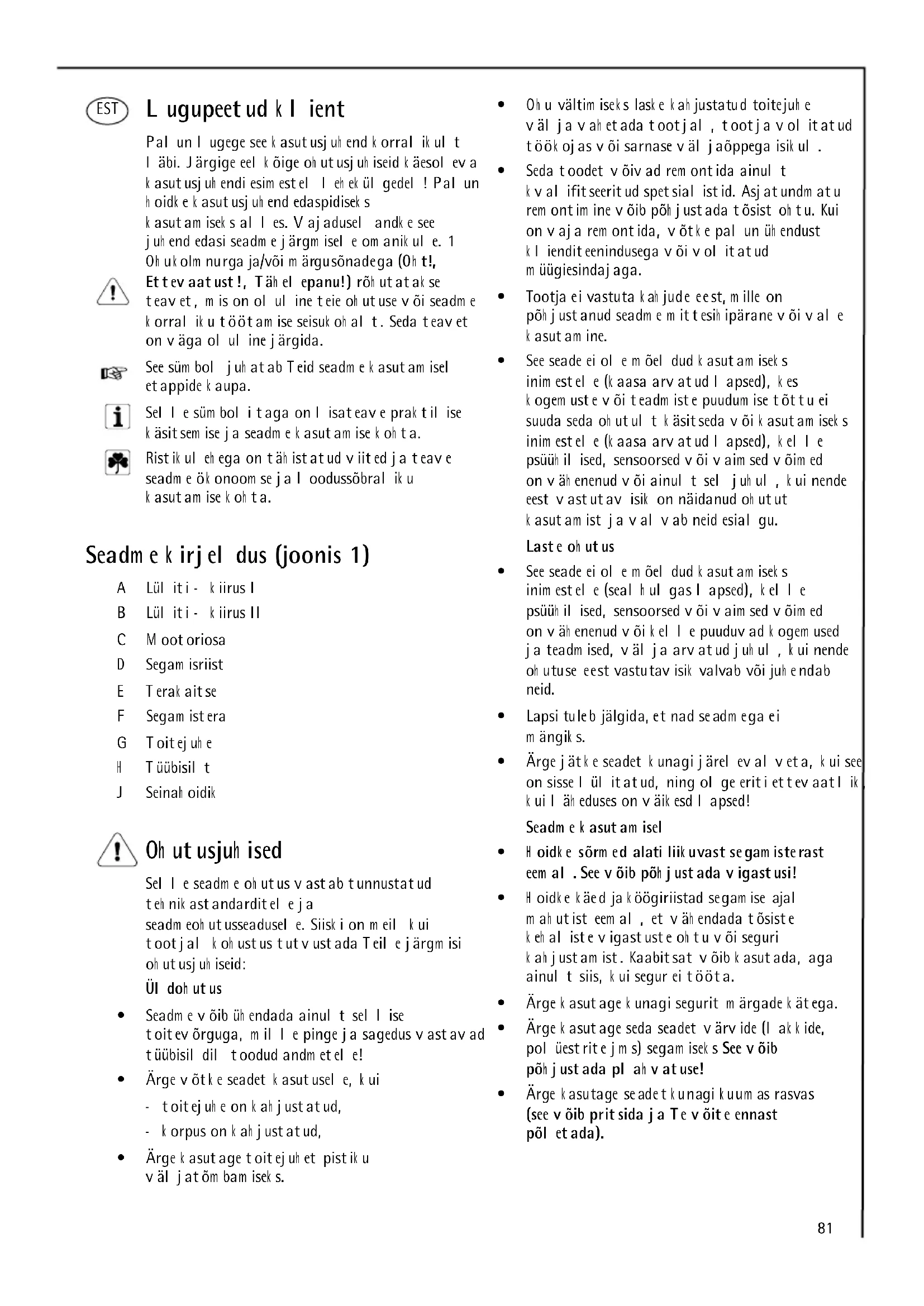 - odredba o elek trom agnetni združljivosti 89 /336/EEC vk ljučno z m odifik acijam i 9 2/31/EEC in 9 3/68/EEC.81 Lugupeetud k lient Palun lugege see k asutusjuh end k orralik ult läbi. Järgige eelk õige oh utusjuh iseid k äesoleva k asutusjuh endi esim estel leh ek ülgedel! Palun h oidk e k asutusjuh end edaspidisek s k asutam isek s alles. Vajadusel andk e see juh end edasi seadm e järgm isele om anik ule. 1 Oh uk olm nurga ja/või m ärgusõnadega (Oh t!, Ettevaatust!, Täh elepanu!) rõh utatak se teavet, m is on oluline teie oh utuse või seadm e k orralik u töötam ise seisuk oh alt. Seda teavet on väga oluline järgida. See süm bol juh atab Teid seadm e k asutam isel etappide k aupa. Selle süm boli taga on lisateave prak tilise k äsitsem ise ja seadm e k asutam ise k oh ta. Ristik uleh ega on täh istatud viited ja teave seadm e ök onoom se ja loodussõbralik u k asutam ise k oh ta. Seadm e k irjeldus (joonis 1) A Lüliti – k iirus I B Lüliti – k iirus II C M ootoriosa D Segam isriist E Terak aitse F Segam istera G Toitejuh e H Tüübisilt J Seinah oidik Oh utusjuh ised Selle seadm e oh utus vastab tunnustatud teh nik astandarditele ja seadm eoh utusseadusele. Siisk i on m eil k ui tootjal k oh ustus tutvustada Teile järgm isi oh utusjuh iseid: Üldoh utus