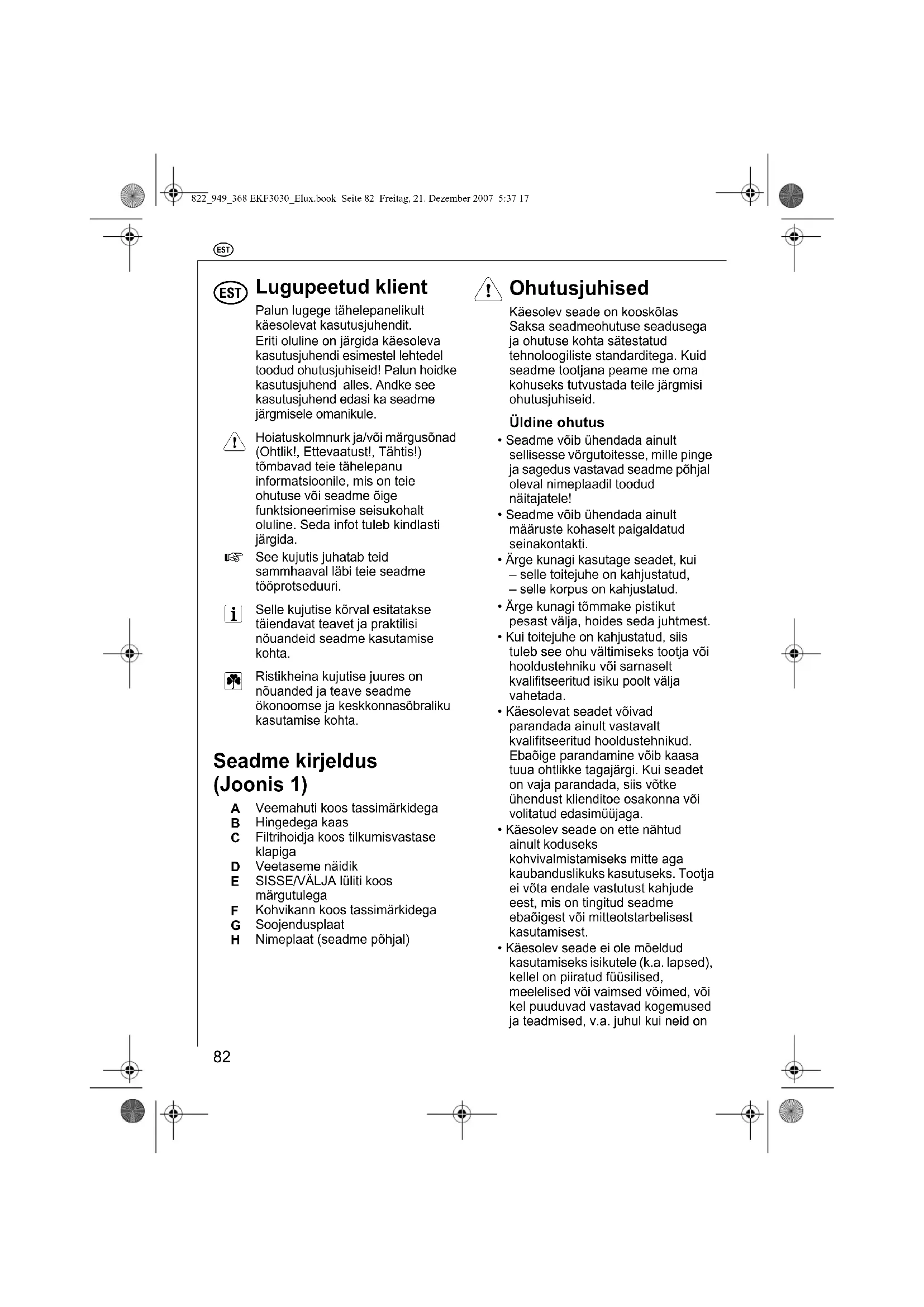 Ohutusjuhised Käesolev seade on kooskõlas Saksa seadmeohutuse seadusega ja ohutuse kohta sätestatud tehnoloogiliste standarditega. Kuid seadme tootjana peame me oma kohuseks tutvustada teile järgmisi ohutusjuhiseid.Üldine ohutus• Seadme võib ühendada ainult sellisesse võrgutoitesse, mille pinge ja sagedus vastavad seadme põhjal oleval nimeplaadil toodud näitajatele!• Seadme võib ühendada ainult määruste kohaselt paigaldatud seinakontakti.• Ärge kunagi kasutage seadet, kui– selle toitejuhe on kahjustatud,– selle korpus on kahjustatud.• Ärge kunagi tõmmake pistikut pesast välja, hoides seda juhtmest.• Kui toitejuhe on kahjustatud, siis tuleb see ohu vältimiseks tootja või hooldustehniku või sarnaselt kvalifitseeritud isiku poolt välja vahetada.• Käesolevat seadet võivad parandada ainult vastavalt kvalifitseeritud hooldustehnikud. Ebaõige parandamine võib kaasa tuua ohtlikke tagajärgi. Kui seadet on vaja parandada, siis võtke ühendust klienditoe osakonna või volitatud edasimüüjaga.• Käesolev seade on ette nähtud ainult koduseks kohvivalmistamiseks mitte aga kaubanduslikuks kasutuseks. Tootja ei võta endale vastutust kahjude eest, mis on tingitud seadme ebaõigest või mitteotstarbelisest kasutamisest.• Käesolev seade ei ole mõeldud kasutamiseks isikutele (k.a. lapsed), kellel on piiratud füüsilised, meelelised või vaimsed võimed, või kel puuduvad vastavad kogemused ja teadmised, v.a. juhul kui neid on 822_949_368 EKF3030_Elux.book Seite 82 Freitag, 21. Dezember 2007 5:37 17
