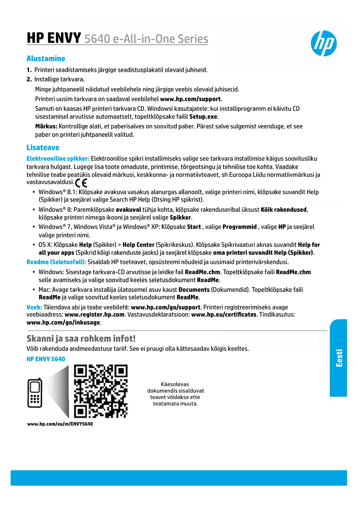 - Mac: Avage tarkvara installija ülatasemel asuv kaust Documents (Dokumendid). Topeltklõpsake faili ReadMe ja valige soovitud keeles seletusdokument ReadMe. Veeb: Täiendava abi ja teabe veebileht: www.hp.com/go/support. Printeri registreerimiseks avage veebiaadress: www.register.hp.com. Vastavusdeklaratsioon: www.hp.eu/certicates. Tindikasutus: www.hp.com/go/inkusage. Alustamine 1. Printeri seadistamiseks järgige seadistusplakatil olevaid juhiseid.2. Installige tarkvara.Minge juhtpaneelil näidatud veebilehele ning järgige veebis olevaid juhisecid.Printeri uusim tarkvara on saadaval veebilehel www.hp.com/support.Samuti on kaasas HP printeri tarkvara CD. Windowsi kasutajatele: kui installiprogramm ei käivitu CD sisestamisel arvutisse automaatselt, topeltklõpsake failil Setup.exe. Märkus: Kontrollige alati, et paberisalves on soovitud paber. Pärast salve sulgemist veenduge, et see paber on printeri juhtpaneelil valitud. HP ENVY 5640 e-All-in-One Series HP ENVY 5640www.hp.com/eu/m/ENVY5640 Eesti68 Ohutusteave Järgige printerit kasutades alati elementaarseid ohutusnõudeid, et vähendada vigastuste ohtu, mille võivad põhjustada tulekahju või elektrilöök.