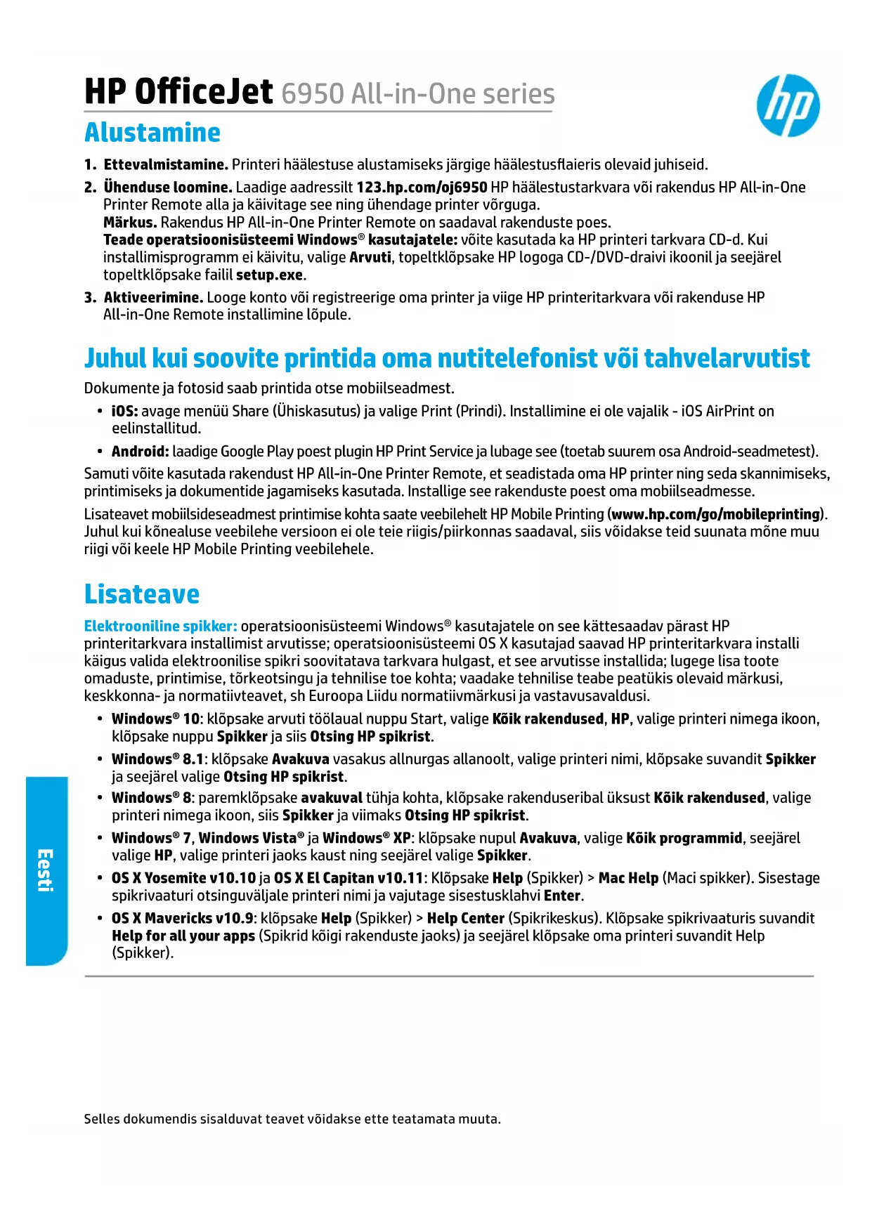 All-in-One Remote installimine lõpule. Lisateave Elektrooniline spikker: operatsioonisüsteemi Windows® kasutajatele on see kättesaadav pärast HP printeritarkvara installimist arvutisse; operatsioonisüsteemi OS X kasutajad saavad HP printeritarkvara installi käigus valida elektroonilise spikri soovitatava tarkvara hulgast, et see arvutisse installida; lugege lisa toote omaduste, printimise, tõrkeotsingu ja tehnilise toe kohta; vaadake tehnilise teabe peatükis olevaid märkusi, keskkonna- ja normatiivteavet, sh Euroopa Liidu normatiivmärkusi ja vastavusavaldusi.