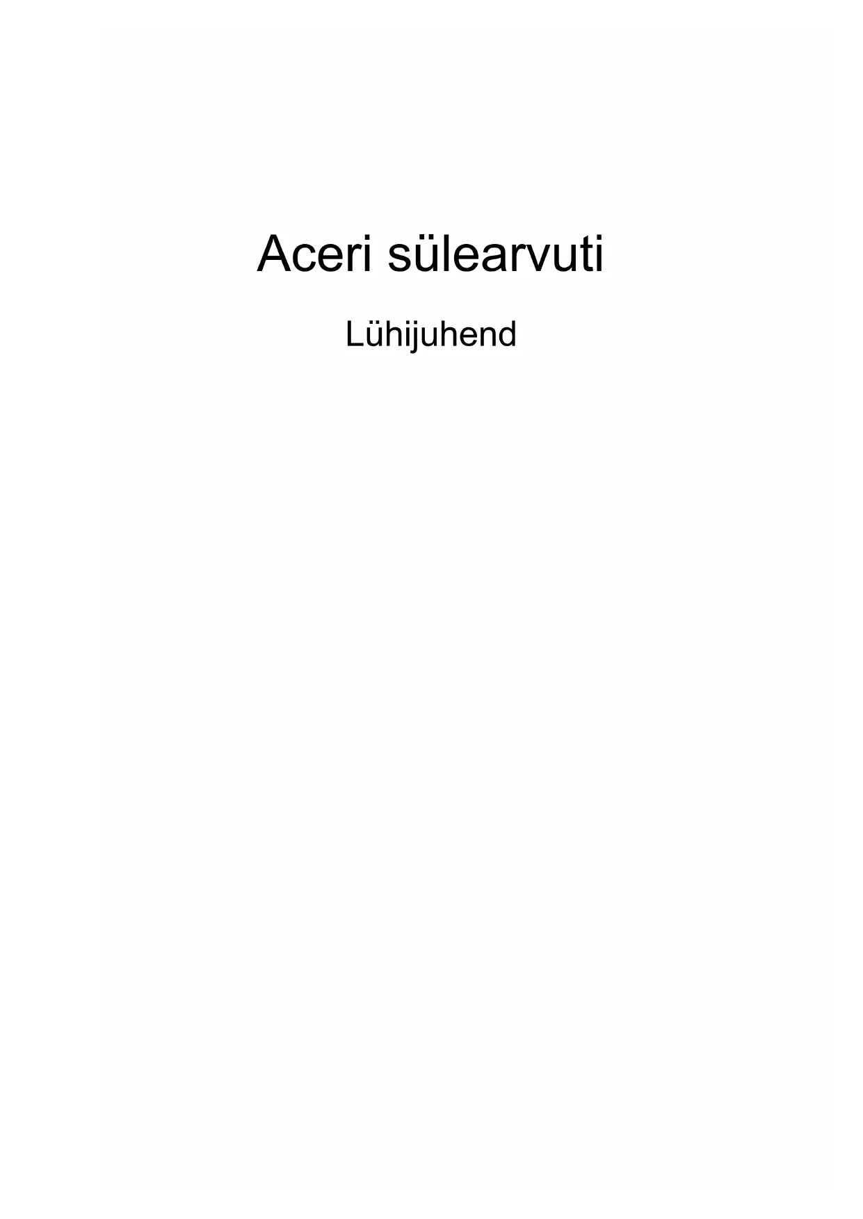 - За съхранение: От 20% до 80%Aceri sülearvuti LühijuhendMudeli number: ________________________________ Seerianumber: _________________________________ Ostukuupäev: _________________________________ Ostukoht: _____________________________________ © 2010 Kõik õigused kaitstud. Aceri sülearvuti lühijuhend Originaalväljaanne: 03/20103 Kõigepealt tähtsamad asjad Täname Teid selle eest, et valisite oma kaasaskantavaks arvutiks Acer'i sülearvuti. Teie teejuhid Et aidata Teil kasutada oma Acer'i sülearvutit, oleme loonud komplekti juhiseid: Kõigepealt aitab poster Alustuseks... Teil alustada oma arvuti häälestamist. Aspire seeria üldkasutusjuhend sisaldab kõigile Aspire tooteseeria mudelitele kohalduvat kasulikku teavet. See katab põhilisi teemasid nagu klaviatuuri kasutamine, heli jne. Palume mõista, et tulenevalt nende loomusest viitavad nii Üldkasutusjuhend kui ka allpool mainitud AcerSystemi kasutaja teatmik (AcerSystem User Guide) aeg-ajalt funktsioonidele või omadustele, mis on ainult teatud seeria mudelitel, kuid mitte tingimata teie ostetud mudelil. Sellised juhtumid on tekstis märgitud väljenditega nagu „ainult teatud mudelitel”. Lühijuhend tutvustab Teile uue arvuti põhilisi omadusi ja funktsioone. Kui soovite saada rohkem teada sellest, kuidas arvuti Teil aitab produktiivsem olla, vaadake AcerSystemi kasutaja teatmik (AcerSystem User Guide). Teatmik sisaldab täpsemat informatsiooni teemadel nagu süsteemiutiilidid, andmete taastamine, laiendusvõimalused ja probleemide lahendamine. Sellele lisaks sisaldab see garantiiinformatsiooni ning sülearvuti kohta kehtivaid üldiseid regulatsioone ja ohutuseeskirju. See on saadaval PDF-formaadis (Portable Document Format) ning on laetud Teie sülearvutisse. Juhised selle avamiseks: 1 Klõpsake ja avage Start > Kõik programmid > AcerSystem. 2 Klõpsake real AcerSystemi kasutaja teatmik (AcerSystem User Guide). Märkus: Faili vaatamiseks on vaja Adobe Reader'it. Kui Adobe Reader pole arvutisse installeeritud, käivitab AcerSystemi kasutaja teatmik (AcerSystem User Guide) 'ile kõigepealt Adobe Reader'i installeerimisprogrammi. Installeerimise lõpetamiseks järgige ekraanil olevaid juhiseid. Juhiseid Adobe Reader'i kasutamiseks leiate menüüst Spikker ja tugi.4 Eesti Teie Acer sülearvuti ülevaade Kui olete oma arvuti häälestanud postril Alustuseks... kujutatud viisil, lubage meil teile tutvustada teie uut Acer sülearvutit. Pealtvaade