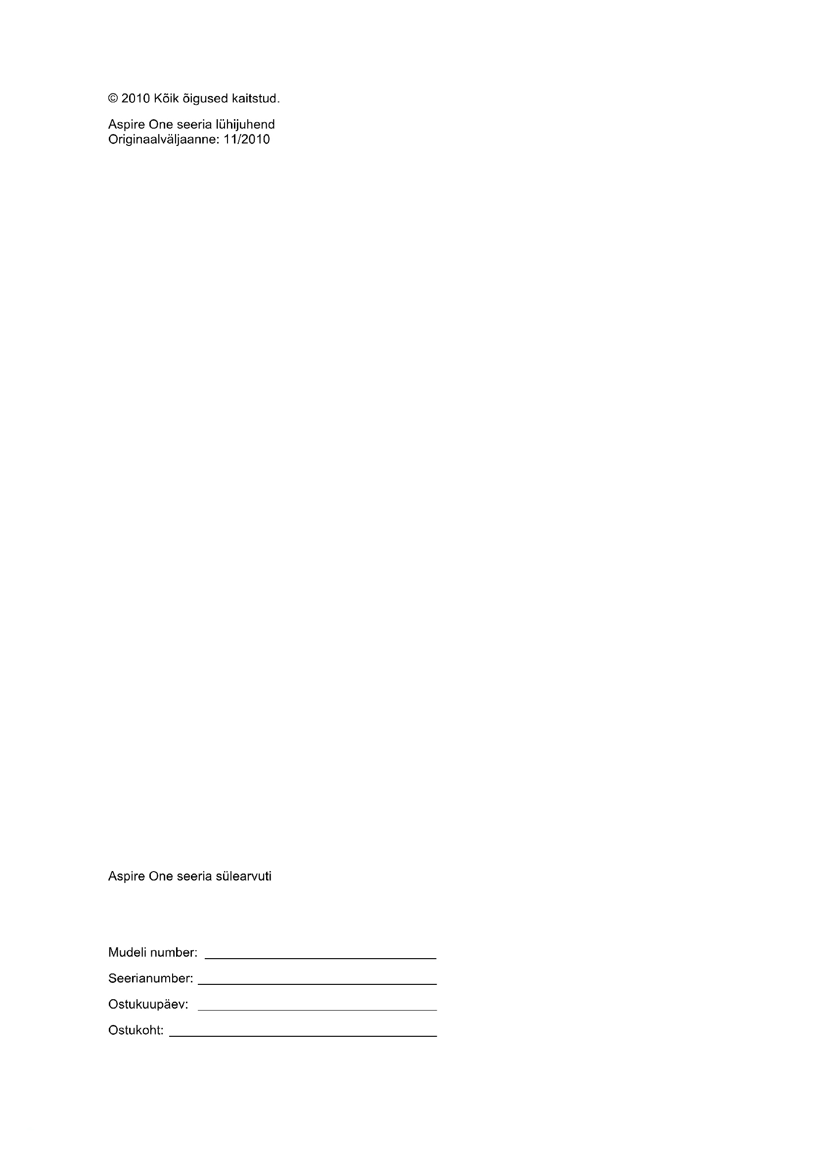 - ъх: 20% 80%Aspire One seeria LühijuhendMudeli number: ________________________________ Seerianumber: _________________________________ Ostukuupäev: _________________________________ Ostukoht: _____________________________________ © 2010 Kõik õigused kaitstud. Aspire One seeria lühijuhend Originaalväljaanne: 11/2010 Aspire One seeria sülearvuti3 Kõigepealt tähtsamad asjad Täname Teid selle eest, et valisite oma kaasaskantavaks arvutiks Acer'i sülearvuti. Teie teejuhid Et aidata Teil kasutada oma Acer'i sülearvutit, oleme loonud komplekti juhiseid: Kõigepealt aitab poster Alustuseks... Teil alustada oma arvuti häälestamist. Aspire One seeria üldkasutusjuhend sisaldab kõigile Aspire One tooteseeria mudelitele kohalduvat kasulikku teavet. See katab põhilisi teemasid nagu klaviatuuri kasutamine, heli jne. Palume mõista, et tulenevalt nende loomusest viitavad nii Üldkasutusjuhend kui ka allpool mainitud AcerSystemi kasutaja teatmik (AcerSystem User Guide) aeg-ajalt funktsioonidele või omadustele, mis on ainult teatud seeria mudelitel, kuid mitte tingimata teie ostetud mudelil. Sellised juhtumid on tekstis märgitud väljenditega nagu „ainult teatud mudelitel”. Lühijuhend tutvustab Teile uue arvuti põhilisi omadusi ja funktsioone. Kui soovite saada rohkem teada sellest, kuidas arvuti Teil aitab produktiivsem olla, vaadake AcerSystemi kasutaja teatmik (AcerSystem User Guide). Teatmik sisaldab täpsemat informatsiooni teemadel nagu süsteemiutiilidid, andmete taastamine, laiendusvõimalused ja probleemide lahendamine. Sellele lisaks sisaldab see garantiiinformatsiooni ning sülearvuti kohta kehtivaid üldiseid regulatsioone ja ohutuseeskirju. See on saadaval PDF-formaadis (Portable Document Format) ning on laetud Teie sülearvutisse. Juhised selle avamiseks: 1 Klõpsake ja avage Start > Kõik programmid > AcerSystem. 2 Klõpsake real AcerSystemi kasutaja teatmik (AcerSystem User Guide). Märkus: Faili vaatamiseks on vaja Adobe Reader'it. Kui Adobe Reader pole arvutisse installeeritud, käivitab AcerSystemi kasutaja teatmik (AcerSystem User Guide) 'ile kõigepealt Adobe Reader'i installeerimisprogrammi. Installeerimise lõpetamiseks järgige ekraanil olevaid juhiseid. Juhiseid Adobe Reader'i kasutamiseks leiate menüüst Spikker ja tugi.4 Eesti Teie Acer’i sülearvuti ülevaade Kui olete oma arvuti häälestanud häälestuse postril kujutatud viisil, lubage meil teile tutvustada teie uut Acer sülearvutit. Pealtvaade # Ikoon Objekt Kirjeldus1 Mikrofon Sisseehitatud mikrofon heli salvestamiseks.2 Kuvariekraan Seda nimetatakse ka vedelkristallekraaniks (LCD) ning see kuvab arvuti pilti (mudelite konfiguratsioon võib olla erinev).3 Voolunupp Arvuti sisse- ja väljalülitamiseks.