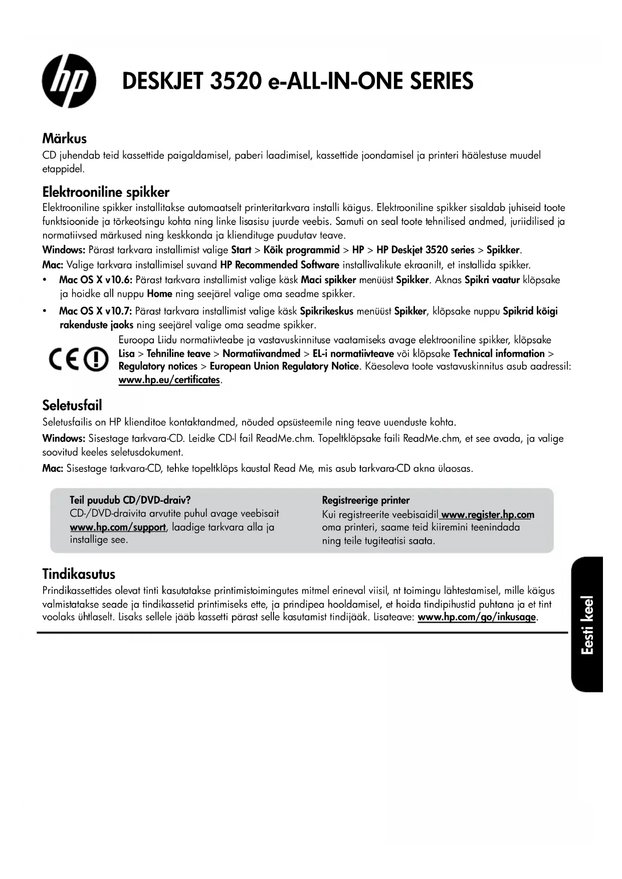 - Mac OS X v10.7: Pärast tarkvara installimist valige käsk Spikrikeskus menüüst Spikker, klõpsake nuppu Spikrid kõigi rakenduste jaoks ning seejärel valige oma seadme spikker. Elektrooniline spikker Elektrooniline spikker installitakse automaatselt printeritarkvara installi käigus. Elektrooniline spikker sisaldab juhiseid toote funktsioonide ja tõrkeotsingu kohta ning linke lisasisu juurde veebis. Samuti on seal toote tehnilised andmed, juriidilised ja normatiivsed märkused ning keskkonda ja kliendituge puudutav teave. Mac: Valige tarkvara installimisel suvand HP Recommended Software installivalikute ekraanilt, et installida spikker. Eesti keel68 Juhtpaneel