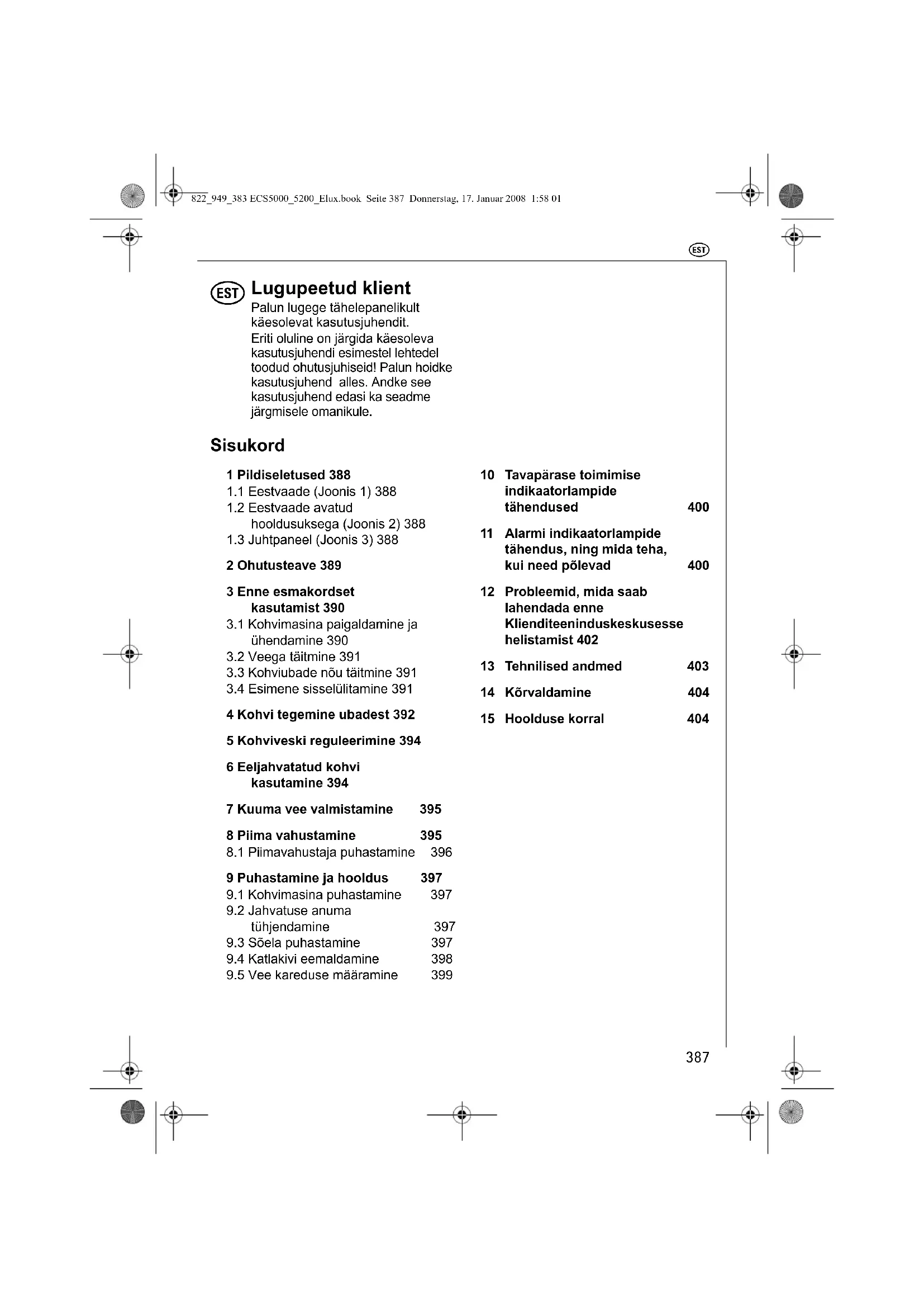Lugupeetud klient Palun lugege tähelepanelikult käesolevat kasutusjuhendit.Eriti oluline on järgida käesoleva kasutusjuhendi esimestel lehtedel toodud ohutusjuhiseid! Palun hoidke kasutusjuhend alles. Andke see kasutusjuhend edasi ka seadme järgmisele omanikule. Sisukord 1 Pildiseletused 3881.1 Eestvaade (Joonis 1) 3881.2 Eestvaade avatud hooldusuksega (Joonis 2) 3881.3 Juhtpaneel (Joonis 3) 3882 Ohutusteave 3893 Enne esmakordset kasutamist 3903.1 Kohvimasina paigaldamine ja ühendamine 3903.2 Veega täitmine 3913.3 Kohviubade nõu täitmine 3913.4 Esimene sisselülitamine 3914 Kohvi tegemine ubadest 3925 Kohviveski reguleerimine 3946 Eeljahvatatud kohvi kasutamine 3947 Kuuma vee valmistamine 3958 Piima vahustamine 3958.1 Piimavahustaja puhastamine 3969 Puhastamine ja hooldus 3979.1 Kohvimasina puhastamine 3979.2 Jahvatuse anuma tühjendamine 3979.3 Sõela puhastamine 3979.4 Katlakivi eemaldamine 3989.5 Vee kareduse määramine 39910 Tavapärase toimimise indikaatorlampide tähendused 40011 Alarmi indikaatorlampide tähendus, ning mida teha, kui need põlevad 40012 Probleemid, mida saab lahendada enne Klienditeeninduskeskusesse helistamist 40213 Tehnilised andmed 40314 Kõrvaldamine 40415 Hoolduse korral 404822_949_383 ECS5000_5200_Elux.book Seite 387 Donnerstag, 17. Januar 2008 1:58 01
