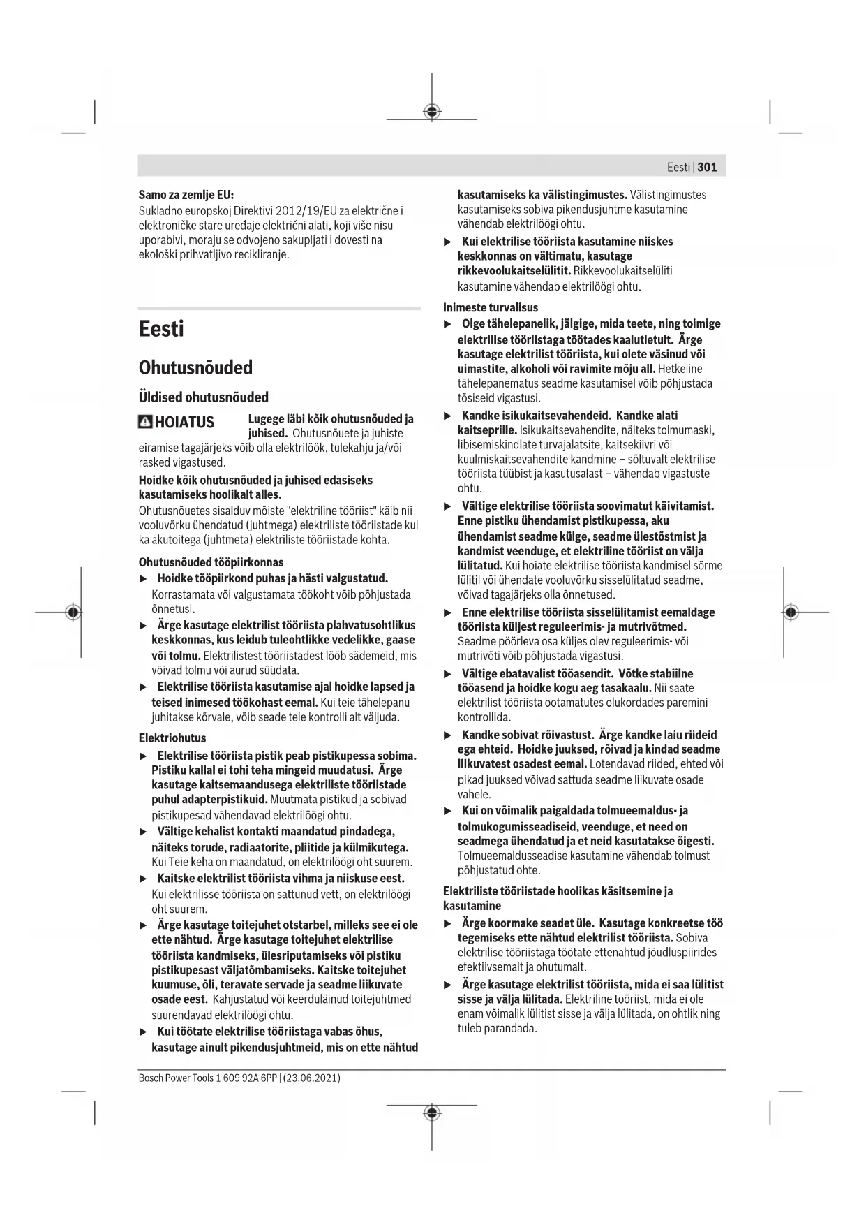 Navedene vrijednosti stupnjeva broja okretaja služe za orijentaciju. u Nazivni broj okretaja pribora mora biti najmanje jednak maksimalnom broju okretaja navedenom na električnom alatu. Pribor koji radi na broju okretaja većem od nazivnog mogao bi se slomiti i oštetiti. Upute za rad u Prije svih radova na električnom alatu izvucite mrežni utikač iz utičnice. u Oprez pri urezivanju u nosivim zidovima, vidjeti odlomak „Napomene za statiku“. u Stegnite izradak ukoliko on ne leži sigurno pod djelovanjem vlastite težine. u Električni alat ne opterećujte toliko jako da se zaustavi pod opterećenjem. u Nakon većeg opterećenja električni alat ostavite još nekoliko minuta da radi u praznom hodu kako bi se nastavak ohladio. u Električni alat ne koristite sa stalkom za rezanje brusnim pločama. u Ne dirajte brusne i rezne ploče dok se ne ohlade. Rezne ploče se jako zagriju tijekom rada. Grubo brušenje u Nikada ne koristite rezne ploče za grubo brušenje. S podesivim kutom od 30° do 40° postići ćete kod grubog brušenja najbolji radni rezultat. Električni alat pomičite uz umjereni pritisak amo-tamo. Na taj način izradak neće postati prevruć, neće promijeniti boju niti će na njemu biti brazda. Bosch Power Tools 1 609 92A 6PP | (23.06.2021)300 | Hrvatski Lepezasta brusna ploča S lepezastom brusnom pločom (pribor) možete obrađivati čak i zaobljene površine i profile. Lepezaste brusne ploče imaju bitno dulji životni vijek, stvaraju manju buku i manje se zagrijavaju kod brušenja u odnosu na uobičajene brusne ploče. Rezanje metala u Kod rezanja s kompozitnim brusnim sredstvima uvijek koristite štitnik za rezanje (9). Kod rezanja radite umjerenim pomakom prilagođenim materijalu koji obrađujete. Ne vršite pritisak na reznu ploču, ne savijajte je i ne oscilirajte. Rezne ploče, koje se inercijski zaustavljaju, ne kočite bočnim pritiskanjem. Električni alat mora se uvijek voditi protuhodno. U suprotnom postoji opasnost da se nekontrolirano istisne iz reza. Kod rezanja profila i četverokutnih cijevi najbolje je da stavite na najmanji presjek. Rezanje kamena u Kod rezanja kamena treba osigurati dovoljno usisavanje prašine. u Nosite zaštitnu masku protiv prašine. u Električni alat smije se koristiti samo za suho rezanje/ suho brušenje. Za rezanje kamena najbolje je koristiti dijamantnu reznu ploču. Pri uporabi usisnog poklopca za rezanje s kliznom vodilicom (19) mora se koristiti odobreni usisavač za usisavanje kamene prašine. Bosch ima u ponudi prikladne usisavače prašine. Uključite električni alat i stavite ga na izradak s prednjim dijelom vodilice. Pomičite električni alat umjerenim pomakom prilagođenim materijalu koji obrađujete. Kod rezanja posebno tvrdih materijala, npr. betona s velikim udjelom šljunka, dijamantna rezna ploča bi se mogla pregrijati i zbog toga oštetiti. Na to ukazuje iskrenje naokolo s dijamantnom reznom pločom. U tom slučaju prekinite rezanje i ostavite dijamantnu reznu ploču da kratko radi u praznom hodu pri maksimalnom broju okretaja kako bi se ohladila. Očigledno usporeni rad i iskrenje naokolo znak je da je dijamantna rezna ploča otupila. Možete je naoštriti kratkim rezovima u abrazivnom materijalu (npr.pješčanik). Napomene za statiku Utori u nosivim zidovima podliježu normi DIN 1053 dio 1 ili važećim propisima dotične zemlje. Obavezno se treba pridržavati tih propisa. Prije početka rada posavjetujte se s odgovornim statičarom, arhitektom ili nadležnim voditeljem gradilišta. Održavanje i servisiranje Održavanje i čišćenje u Prije svih radova na električnom alatu izvucite mrežni utikač iz utičnice. u Električni alat i otvore za hlađenje održavajte čistima kako bi se moglo dobro i sigurno raditi. u Kod ekstremnih uvjeta po mogućnosti uvijek koristite stacionarni uređaj za usisavanje. Često ispuhavajte otvore za hlađenje i predspojite zaštitnu strujnu sklopku (PRCD). Kod obrade metala vodljiva prašina se može nakupiti unutar električnog alata. To može negativno utjecati na zaštitnu izolaciju električnog alata. Pažljivo uskladištite i postupajte s priborom. Ako je potrebna zamjena priključnog kabela, tada je treba provesti u Bosch servisu ili u ovlaštenom servisu za Bosch električne alate kako bi se izbjeglo ugrožavanje sigurnosti. Servisna služba i savjeti o uporabi Naša servisna služba će odgovoriti na vaša pitanja o popravku i održavanju vašeg proizvoda, kao i o rezervnim dijelovima. Crteže u rastavljenom obliku i informacije o rezervnim dijelovima možete naći i na našoj adresi: www.bosch-pt.com Tim Bosch savjetnika o uporabi rado će odgovoriti na vaša pitanja o našim proizvodima i njihovom priboru. U slučaju upita ili naručivanja rezervnih dijelova, molimo vas obavezno navedite 10‑znamenkasti kataloški broj s tipske pločice proizvoda. Hrvatski Robert Bosch d.o.o PT/SHR-BSC Kneza Branimira 22 10040 Zagreb Tel.: +385 12 958 051 Fax: +385 12 958 050 E-Mail: RBKN-bsc@hr.bosch.com www.bosch.hr Ostale adrese servisa možete pronaći na: www.bosch-pt.com/serviceaddresses Zbrinjavanje Električne alate, pribor i ambalažu treba dovesti na ekološki prihvatljivo recikliranje. Električne alate ne bacajte u kućni otpad! 1 609 92A 6PP | (23.06.2021) Bosch Power ToolsEesti | 301 Samo za zemljeEU: Sukladno europskoj Direktivi 2012/19/EU za električne i elektroničke stare uređaje električni alati, koji više nisu uporabivi, moraju se odvojeno sakupljati i dovesti na ekološki prihvatljivo recikliranje. Eesti Ohutusnõuded Üldised ohutusnõuded HOIATUS Lugege läbi kõik ohutusnõuded ja juhised. Ohutusnõuete ja juhiste eiramise tagajärjeks võib olla elektrilöök, tulekahju ja/või rasked vigastused. Hoidke kõik ohutusnõuded ja juhised edasiseks kasutamiseks hoolikalt alles. Ohutusnõuetes sisalduv mõiste "elektriline tööriist" käib nii vooluvõrku ühendatud (juhtmega) elektriliste tööriistade kui ka akutoitega (juhtmeta) elektriliste tö