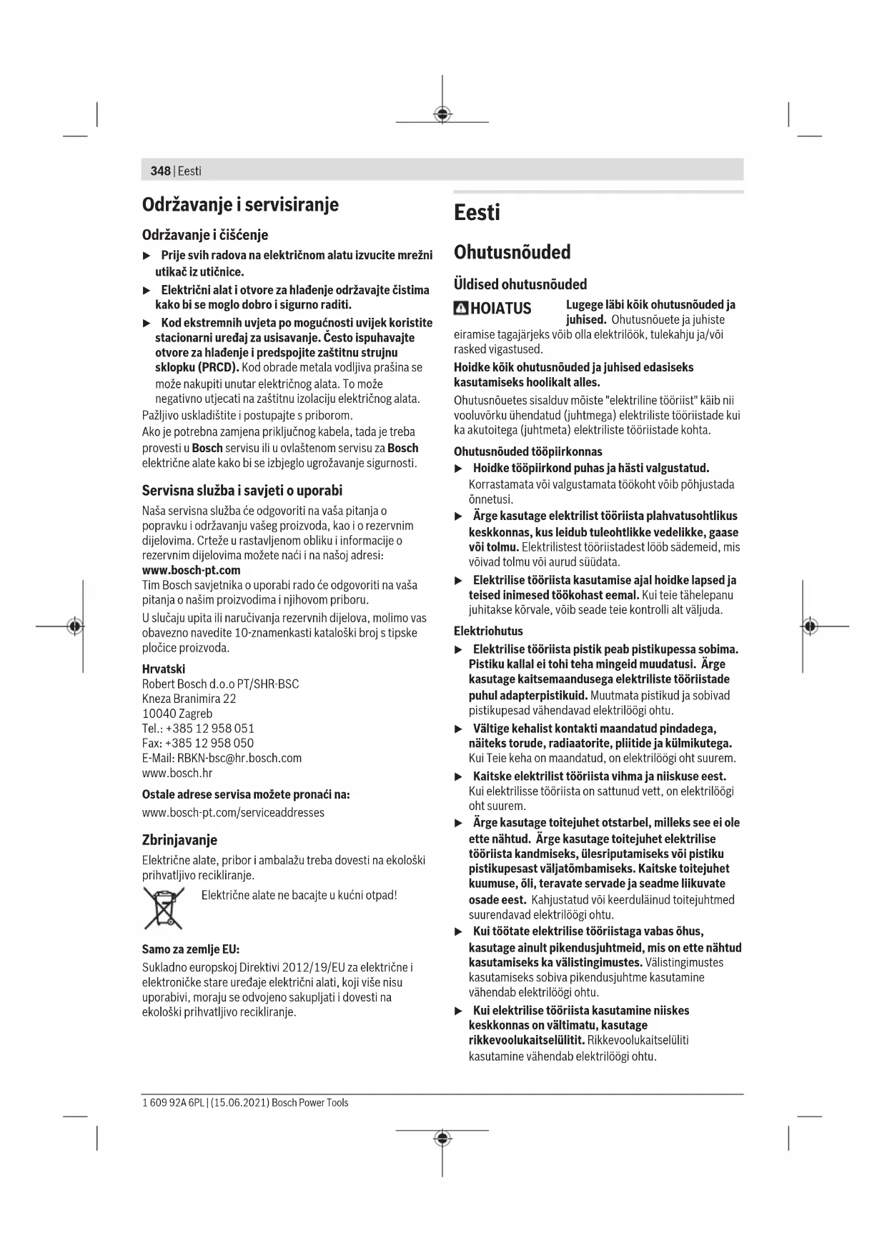 Navedene vrijednosti stupnjeva broja okretaja služe za orijentaciju. u Nazivni broj okretaja pribora mora biti najmanje jednak maksimalnom broju okretaja navedenom na električnom alatu. Pribor koji radi na broju okretaja većem od nazivnog mogao bi se slomiti i oštetiti. Upute za rad u Prije svih radova na električnom alatu izvucite mrežni utikač iz utičnice. u Oprez pri urezivanju u nosivim zidovima, vidjeti odlomak „Napomene za statiku“. u Stegnite izradak ukoliko on ne leži sigurno pod djelovanjem vlastite težine. u Električni alat ne opterećujte toliko jako da se zaustavi pod opterećenjem. u Nakon većeg opterećenja električni alat ostavite još nekoliko minuta da radi u praznom hodu kako bi se nastavak ohladio. u Električni alat ne koristite sa stalkom za rezanje brusnim pločama. u Ne dirajte brusne i rezne ploče dok se ne ohlade. Rezne ploče se jako zagriju tijekom rada. Lepezasta brusna ploča S lepezastom brusnom pločom (pribor) možete obrađivati čak i zaobljene površine i profile. Lepezaste brusne ploče imaju bitno dulji životni vijek, stvaraju manju buku i manje se zagrijavaju kod brušenja u odnosu na uobičajene brusne ploče. Grubo brušenje u Nikada ne koristite rezne ploče za grubo brušenje. S podesivim kutom od 30° do 40° postići ćete kod grubog brušenja najbolji radni rezultat. Električni alat pomičite uz umjereni pritisak amo-tamo. Na taj način izradak neće postati prevruć, neće promijeniti boju niti će na njemu biti brazda. Rezanje metala u Kod rezanja s kompozitnim brusnim sredstvima uvijek koristite štitnik za rezanje (6). Kod rezanja radite umjerenim pomakom prilagođenim materijalu koji obrađujete. Ne vršite pritisak na reznu ploču, ne savijajte je i ne oscilirajte. Rezne ploče, koje se inercijski zaustavljaju, ne kočite bočnim pritiskanjem. Električni alat mora se uvijek voditi protuhodno. U suprotnom postoji opasnost da se nekontrolirano istisne iz reza. Kod rezanja profila i četverokutnih cijevi najbolje je da stavite na najmanji presjek. Rezanje kamena u Kod rezanja kamena treba osigurati dovoljno usisavanje prašine. u Nosite zaštitnu masku protiv prašine. u Električni alat smije se koristiti samo za suho rezanje/ suho brušenje. Za rezanje kamena najbolje je koristiti dijamantnu reznu ploču. Pri uporabi usisnog poklopca za rezanje s kliznom vodilicom (18) mora se koristiti odobreni usisavač za usisavanje kamene prašine. Bosch ima u ponudi prikladne usisavače prašine. Uključite električni alat i stavite ga na izradak s prednjim dijelom vodilice. Pomičite električni alat umjerenim pomakom prilagođenim materijalu koji obrađujete. Kod rezanja posebno tvrdih materijala, npr. betona s velikim udjelom šljunka, dijamantna rezna ploča bi se mogla pregrijati i zbog toga oštetiti. Na to ukazuje iskrenje naokolo s dijamantnom reznom pločom. U tom slučaju prekinite rezanje i ostavite dijamantnu reznu ploču da kratko radi u praznom hodu pri maksimalnom broju okretaja kako bi se ohladila. Očigledno usporeni rad i iskrenje naokolo znak je da je dijamantna rezna ploča otupila. Možete je naoštriti kratkim rezovima u abrazivnom materijalu (npr.pješčanik). Napomene za statiku Utori u nosivim zidovima podliježu normi DIN 1053 dio 1 ili važećim propisima dotične zemlje. Obavezno se treba pridržavati tih propisa. Prije početka rada posavjetujte se s odgovornim statičarom, arhitektom ili nadležnim voditeljem gradilišta. Bosch Power Tools 1 609 92A 6PL | (15.06.2021)348 | Eesti Održavanje i servisiranje Održavanje i čišćenje u Prije svih radova na električnom alatu izvucite mrežni utikač iz utičnice. u Električni alat i otvore za hlađenje održavajte čistima kako bi se moglo dobro i sigurno raditi. u Kod ekstremnih uvjeta po mogućnosti uvijek koristite stacionarni uređaj za usisavanje. Često ispuhavajte otvore za hlađenje i predspojite zaštitnu strujnu sklopku (PRCD). Kod obrade metala vodljiva prašina se može nakupiti unutar električnog alata. To može negativno utjecati na zaštitnu izolaciju električnog alata. Pažljivo uskladištite i postupajte s priborom. Ako je potrebna zamjena priključnog kabela, tada je treba provesti u Bosch servisu ili u ovlaštenom servisu za Bosch električne alate kako bi se izbjeglo ugrožavanje sigurnosti. Servisna služba i savjeti o uporabi Naša servisna služba će odgovoriti na vaša pitanja o popravku i održavanju vašeg proizvoda, kao i o rezervnim dijelovima. Crteže u rastavljenom obliku i informacije o rezervnim dijelovima možete naći i na našoj adresi: www.bosch-pt.com Tim Bosch savjetnika o uporabi rado će odgovoriti na vaša pitanja o našim proizvodima i njihovom priboru. U slučaju upita ili naručivanja rezervnih dijelova, molimo vas obavezno navedite 10‑znamenkasti kataloški broj s tipske pločice proizvoda. Hrvatski Robert Bosch d.o.o PT/SHR-BSC Kneza Branimira 22 10040 Zagreb Tel.: +385 12 958 051 Fax: +385 12 958 050 E-Mail: RBKN-bsc@hr.bosch.com www.bosch.hr Ostale adrese servisa možete pronaći na: www.bosch-pt.com/serviceaddresses Zbrinjavanje Električne alate, pribor i ambalažu treba dovesti na ekološki prihvatljivo recikliranje. Električne alate ne bacajte u kućni otpad! Samo za zemljeEU: Sukladno europskoj Direktivi 2012/19/EU za električne i elektroničke stare uređaje električni alati, koji više nisu uporabivi, moraju se odvojeno sakupljati i dovesti na ekološki prihvatljivo recikliranje. Eesti Ohutusnõuded Üldised ohutusnõuded HOIATUS Lugege läbi kõik ohutusnõuded ja juhised. Ohutusnõuete ja juhiste eiramise tagajärjeks võib olla elektrilöök, tulekahju ja/või rasked vigastused. Hoidke kõik ohutusnõuded ja juhised edasiseks kasutamiseks hoolikalt alles. Ohutusnõuetes sisalduv mõiste "elektriline tööriist" käib nii vooluvõrku ühendatud (juhtmega) elektriliste tööriistade kui ka akutoitega (juhtmeta) elektriliste tööriistade kohta. Ohutusnõuded tööpiirkonnas u Hoidke töö