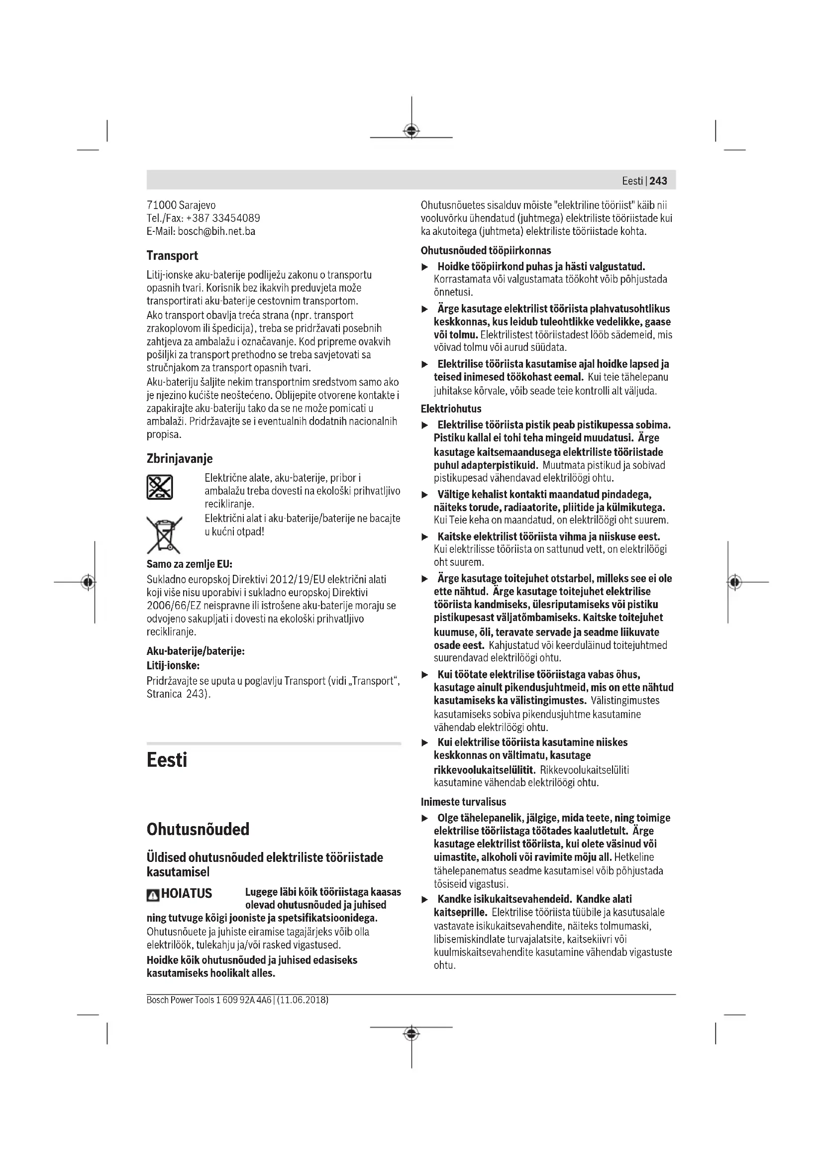dužine vijka. LED Kapacitet Stalno svjetli 3 x zelena ≥ 2/3 Stalno svjetli 2 x zelena ≥1/3 Stalno svjetli 1 x zelena < 1/3 Treperavo svjetlo 1 x zeleno Rezerva OBJ_BUCH-2907-001.book Page 140 Wednesday, July 27, 2016 9:32 AMEesti | 141 Bosch Power Tools 1 609 92A 2P0 | (27.7.16) Održavanje i servisiranje Održavanje i čišćenje Prije svih radova na električnom alatu (npr. održava- nje, zamjena alata, itd.), kao i kod njegovog transporta i spremanja, aku-bateriju treba izvaditi iz električnog alata. Kod nehotičnog aktiviranja prekidača za uključiva- nje/isključivanje postoji opasnost od ozljeda. Električni alat i otvore za hlađenje održavajte čistim ka- ko bi se moglo dobro i sigurno raditi. Ako aku-baterija nije više radno sposobna, molimo obratite se ovlaštenom servisu za Bosch električne alate. Servisiranje i savjetovanje o primjeni Ovlašteni servis će odgovoriti na vaša pitanja o popravcima i održavanju vašeg proizvoda te o rezervnim dijelovima. Pove- ćane crteže i informacije o rezervnim dijelovima možete naći na adresi: www.bosch-pt.com Bosch tim za savjetovanje o primjeni rado će vam pomoći od- govorom na pitanja o našim proizvodima i priboru. Za slučaj povratnih upita ili naručivanja rezervnih dijelova, molimo vas neizostavno navedite 10-znamenkasti kataloški broj sa tipske pločice proizvoda. Hrvatski Robert Bosch d.o.o Kneza Branimira 22 10040 Zagreb Tel.: (01) 2958051 Fax: (01) 2958050 Transport Li-ionske aku-baterije ugrađene u električnom alatu podliježu zakonu o transportu opasnih tvari. Aku-baterije korisnik može bez ikakvih preduvjeta transportirati cestovnim transportom. Ako transport obavlja treća strana (npr. transport zrakoplo- vom ili špedicijom), treba se pridržavati posebnih zahtjeva obzirom na ambalažu i označavanje. Kod pripreme ovakvih pošiljki za transport prethodno se treba savjetovati sa struč- njakom za transport opasnih tvari. Aku-bateriju šaljite nekim transportnim sredstvom samo ako je njeno kućište neoštećeno. Oblijepite otvorene kontakte i zapakirajte aku-bateriju tako da se ne može pomicati u amba- laži. Molimo pridržavajte se i eventualnih dodatnih nacionalnih propisa. Zbrinjavanje Električne alate, aku-baterije, pribor i ambalažu treba dovesti na ekološki prihvatljivo recikliranje. Električni alat i aku-bateriju ne bacajte u kućni otpad! Samo za zemlje EU: Prema Europskim smjernicama 2012/19/EU, neuporabivi električni alati i prema Smjernicama 2006/66/EZ ne- ispravne ili istrošene aku-baterije moraju se odvojeno sakupljati i dovesti na ekološki prihvatljivo recikliranje. Aku-baterije/baterije: Li-ion: Molimo pridržavajte se uputa u poglav- lju »Transport« na stranici 141. Zadržavamo pravo na promjene. Eesti Ohutusnõuded Üldised ohutusjuhised Kõik ohutusnõuded ja juhised tuleb läbi lugeda. Ohutusnõuete ja juhiste eiramise tagajärjeks võib olla elektrilöök, tulekahju ja/või rasked vigastused. Hoidke kõik ohutusnõuded ja juhised edasiseks kasutami- seks hoolikalt alles. Allpool kasutatud mõiste „Elektriline tööriist“ käib võrgutoi- tega (toitejuhtmega) elektriliste tööriistade ja akutoitega (ilma toitejuhtmeta) elektriliste tööriistade kohta. Ohutusnõuded tööpiirkonnas Töökoht peab olema puhas ja hästi valgustatud. Tööko- has valitsev segadus ja hämarus võib põhjustada õnnetusi. Ärge kasutage elektrilist tööriista plahvatusohtlikus keskkonnas, kus leidub tuleohtlikke vedelikke, gaase või tolmu. Elektrilistest tööriistadest lööb sädemeid, mis võivad tolmu või aurud süüdata. Elektrilise tööriista kasutamise ajal hoidke lapsed ja teised isikud töökohast eema. Kui Teie tähelepanu kõr- vale juhitakse, võib seade Teie kontrolli alt väljuda. Elektriohutus Elektrilise tööriista pistik peab pistikupessa sobima. Pistiku kallal ei tohi teha mingeid muudatusi. Ärge ka- sutage kaitsemaandusega elektriliste tööriistade pu- hul adapterpistikuid. Muutmata pistikud ja sobivad pisti- kupesad vähendavad elektrilöögi saamise riski. Vältige kehakontakti maandatud pindadega, nagu to- rud, radiaatorid, pliidid ja külmikud. Kui Teie keha on maandatud, on elektrilöögi oht suurem. TÄHELEPANU OBJ_BUCH-2907-001.book Page 141 Wednesday, July 27, 2016 9:32 AM142 | Eesti 1 609 92A 2P0 | (27.7.16) Bosch Power Tools Hoidke seadet vihma ja niiskuse eest. Kui elektrilisse tööriista on sattunud vett, on elektrilöögi oht suurem. Ärge kasutage toitejuhet otstarvetel, milleks see ei ole ette nähtud, näiteks elektrilise tööriista kandmiseks, ülesriputamiseks või pistiku pistikupesast väljatõmba- miseks. Hoidke toitejuhet kuumuse, õli, teravate ser- vade ja seadme liikuvate osade eest. Kahjustatud või keerduläinud toitejuhtmed suurendavad elektrilöögi ohtu. Kui töötate elektrilise tööriistaga vabas õhus, kasutage ainult selliseid pikendusjuhtmeid, mida on lubatud ka- sutada ka välistingimustes. Välistingimustes kasuta- miseks sobiva pikendusjuhtme kasutamine vähendab elektrilöögi ohtu. Kui elektrilise tööriista kasutamine niiskes keskkon- nas on vältimatu, kasutage rikkevoolukaitselülitit. Rikkevoolukaitselüliti kasutamine vähendab elektrilöögi ohtu. Inimeste turvalisus Olge tähelepanelik, jälgige, mida Te teete, ning toimige elektrilise tööriistaga töötades kaalutletult. Ärge kasu- tage elektrilist tööriista, kui olete väsinud või uimasti- te, alkoholi või ravimite mõju all. Hetkeline tähelepane- matus seadme kasutamisel võib põhjustada tõsiseid vigas- tusi. Kandke isikukaitsevahendeid ja alati kaitseprille. Isiku- kaitsevahendite, näiteks tolmumaski, libisemiskindlate turvajalatsite, kaitsekiivri või kuulmiskaitsevahendite kandmine – sõltuvalt elektrilise tööriista tüübist ja kasutusalast – vähendab vigastuste ohtu. Vältige seadme tahtmatut käivitamist. Enne pistiku ühendamist pistikupessa, aku ühendamist seadme kül- ge, seadme ülestõstmist ja kandmist veenduge, et elektriline tööri