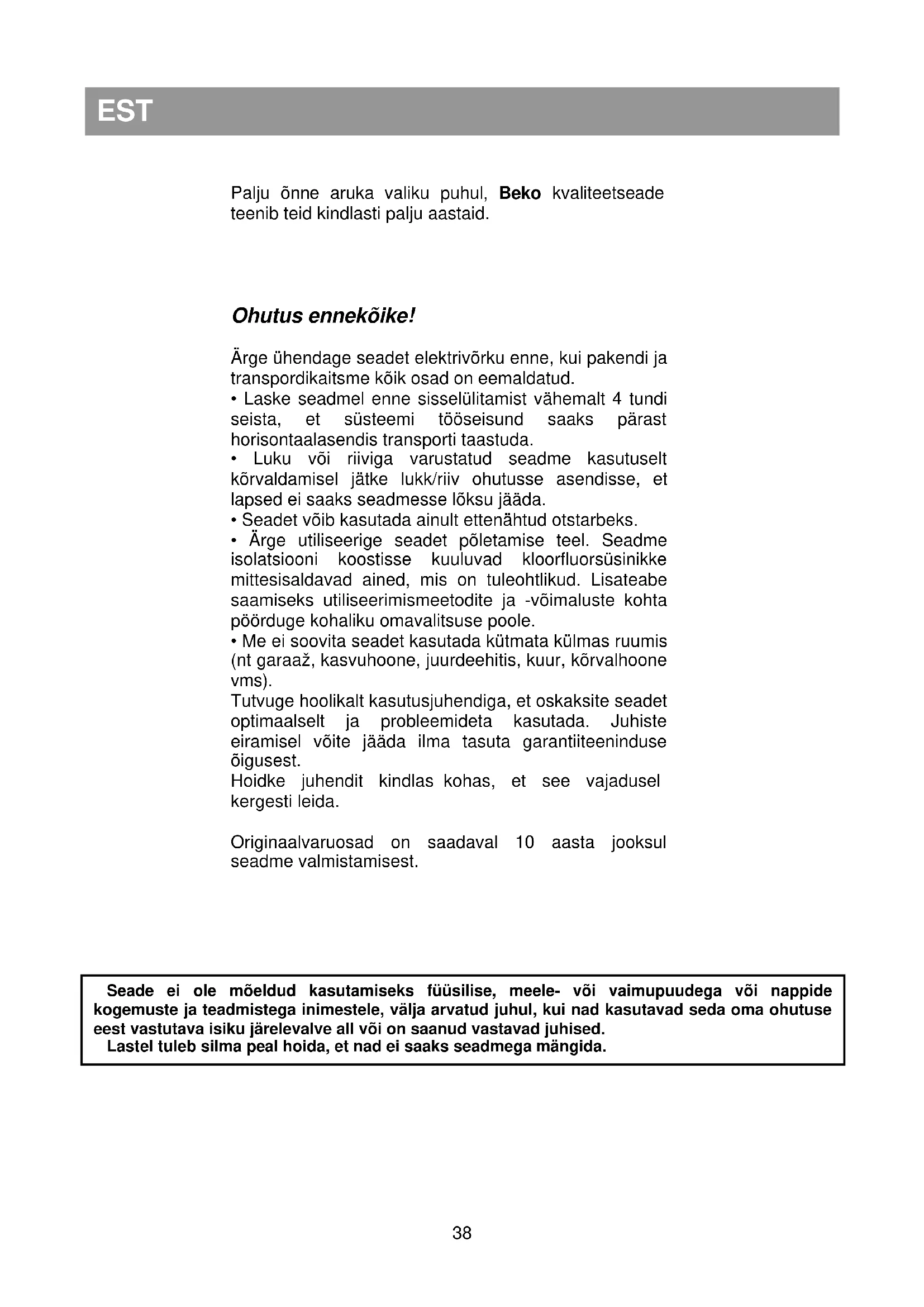 - Luku või riiviga varustatud seadme kasutuselt kõrvaldamisel jätke lukk/riiv ohutusse asendisse, et lapsed ei saaks seadmesse lõksu jääda.
