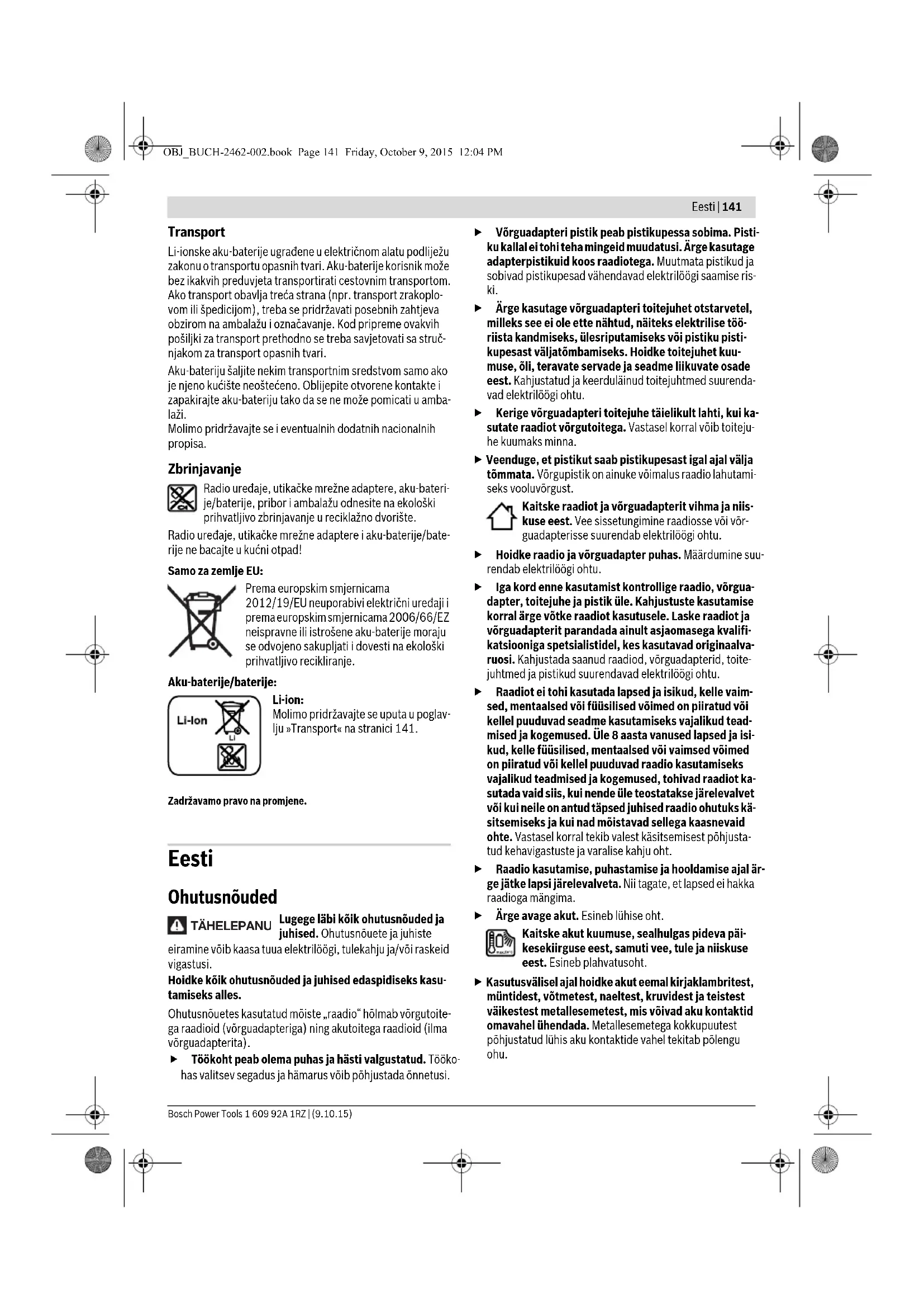 Puhverpatareide paigaldamine/vahetamine Selleks et salvestada raadiol kellaaega, peavad puhverpata- reid olema sisse pandud. Soovitav on kasutada leelisman- gaanpatareisid. Patareikorpuse avamiseks keerake lahti kruvi 18 ja võtke pa- tareikorpuse kaas 19 maha. Paigaldage puhverpatareid. Jäl- gige seejuures patareide õiget polaarsust vastavalt patarei- korpuse kaane välisküljel toodud sümbolitele. Asetage patareikorpuse kaas 19 tagasi kohale ja keerake kru- viga 18 kinni. Vahetage puhverpatareid välja, kui näit e muutub tuhmimaks ja raadiol ei saa enam salvestada kellaaega. Vahetage alati välja kõik patareid ühekorraga. Kasutage üks- nes ühe tootja ja ühesuguse mahtuvusega patareisid. Võtke puhverpatareid välja, kui te ei kasuta raadiot pi- kemat aega. Puhverpatareid, mis jäävad pikemaks ajaks raadiosse, võivad korrodeeruda või iseeneslikult tühjene- da. Kasutamine Kaitske raadiot niiskuse ja otsese päikesekiirguse eest. Raadio on ette nähtud kasutamiseks üksnes kuiva- des siseruumides. Audiorežiim Sisse-/väljalülitus Raadio sisselülitamiseks vajutage lülitile (sisse/välja) 3. Ek- raan 8 muutub aktiivseks ja kuvab raadio viimasel väljalülita- misel väljareguleeritud heliallikat. Märkus: Kui raadiot kasutatakse esmakordselt akuga või kui raadiot ei ole pikemat aega kasutatud, võib osutuda vajalikuks vajutada nupule (sisse/välja) 3 korduvalt või pikemat aega. Iga kord, kui vajutate nupule, süttib mõneks sekundiks ekraa- ni 8 valgustus. Raadio väljalülitamiseks vajutage lülitile (sisse/välja) 3. He- liallika seadistus salvestatakse. Energia säästmiseks lülitage raadio sisse ainult siis, kui seda kasutate. Helitugevuse reguleerimine Pärast raadio sisselülitamist on alati välja reguleeritud kesk- mine helitugevus (10 aste). Helitugevuse suurendamiseks vajutage nupule „Vol +“ 6, he- litugevuse vähendamiseks nupule „Vol –“ 5. Helitugevuse seadistus „VL“ ilmub vahemikus 0 kuni 20 mõneks sekundiks näidikule e ekraanil. Võrguadapter Tootenumber 1 600 A00 0.. Sisendpinge V~ 100–240 Sagedus Hz 50/60 Sisendvool mA 500 Väljundpinge V= 12 Väljundvool mA 1500 Kaal EPTA-Procedure 01:2014 järgi kg 0,2 Kaitseaste /II Näit Mahtuvus ≥2/3 ≥1/3 <1/3 Reserv Aku on tühi OBJ_BUCH-2462-002.book Page 143 Friday, October 9, 2015 12:04 PM144 | Eesti 1 609 92A 1RZ | (9.10.15) Bosch Power Tools Enne raadiojaama valimist või vahetamist reguleerige helitu- gevus madalaks, enne välise heliallika käivitamist reguleerige helitugevus keskmiseks. Heli väljalülitamiseks võite vajutada nupule „Mute“ 13. Heli tagasitoomiseks vajutage uuesti nupule „Mute“ 13 või ühele helitugevuse nuppudest „Vol +“ 6 või „Vol –“ 5. Kõla häälestamine Parima kõla tagamiseks on raadiosse integreeritud ekvalai- ser. Madalate toonide käsitsi muutmiseks vajutage nupule „Equa- lizer“ 4 üks kord. Ekraanile ilmub „BA“ ning madalate toonide salvestatud taset kuvatakse näidikul e. Kõrgete toonide tase- me muutmiseks vajutage nupule „Equalizer“ 4 uuesti, näidi- kule e ilmub „TR“ ja kõrgete toonide salvestatud tase. Kõrgete ja madalate toonide taset saab muuta vahemikus –5 kuni +5. Kuvatud taseme suurendamiseks vajutage vastavalt nupule „Vol +“ 6, vähendamiseks nupule „Vol –“ 5. Muuda- tused salvestatakse automaatselt, kui näit e lülitub mõni se- kund pärast viimast nupulevajutamist uuesti kellaaja näidule. Heliallika valimine Heliallika valimiseks vajutage nupule „Source“ 14 seni, kuni ekraanile ilmub näit f, mis tähistab soovitud sisemist helialli- kat (vt „Raadiojaama seadistamine/salvestamine“, lk 144) või välist heliallikat (vt „Väliste heliallikate ühendamine“, lk 144): – „FM“: ultralühilaineala, – „AM“: kesklaineala, – „AUX“: välised heliallikad (nt CD-mängija), kasutades 3,5 mm sisendit 22. Antenni reguleerimine Raadio väljastatakse monteeritud antenniga 7. Raadio kasu- tamise ajal keerake antenn suunda, mis tagab parima vastuvõ- tu. Kui vastuvõtt ei ole rahuldav, asetage raadio teise kohta, kus vastuvõtt on parem. Märkus: Raadio kasutamisel mobiiliseadmete või teiste elekt- rooniliste seadmete vahetus läheduses võib vastuvõtt olla häiritud. Raadiojaama seadistamine/salvestamine Vajutage heliallika valiku nupule „Source“ 14 seni, kuni näidi- kule ilmub f „FM“ ultraühilaineala (UKW) tähisena või „AM“ kesklaineala (MW) tähisena. Selleks et reguleerida välja teatavat raadiosagedust, vaju- tage otsingu nupule 12, et sagedust suurendada, või ot- singu nupule 11, et sagedust vähendada. Väljareguleeri- tud sagedust kuvatakse ekraanil näiduna a. Selleks et otsida suure signaalitugevusega raadiojaamu, vajutage otsingu nupule 12 või otsingu nupule 11 ja hoidke seda veidi aega sissevajutatuna. Leitud raadiojaama sagedus ilmub näidikule a ekraanil. Kui signaali vastuvõtt on piisavalt hea, lülitub raadio auto- maatselt stereovastuvõtule. Ekraanile ilmub stereovastuvõtu näit c. Selleks et väljareguleeritud jaama salvestada, hoidke ühte programmi salvestamise nuppu 9 3 sekundit all. Kui näidikule e „PR“ ning valitud programmi salvestamise nupu number il- muvad, on jaam salvestatud. Salvestada on võimalik 5 ultralühilainejaama ja 5 kesklaine- jaama. Pidage meeles, et uue jaama väljavalimise korral kirju- tatakse salvestuskoha salvestus üle. Selleks et salvestatud jaama edastada, vajutage korraks vastavale programmi salvestamise nupule 9. Näidikule e ilmu- vad mõneks sekundiks „PR“ ja programmi salvestamise num- ber. Väliste heliallikate ühendamine Lisaks integreeritud raadiole saab edastada erinevaid väliseid heliallikaid. Võtke maha „AUX IN“-sisendi 22 kaitsekate. Ühendage AUX- kaabli 26 3,5-mm-pistik sisendisse (vt jooniste leheküljel ole- vat joonist). Ühendage AUX-kaabli teine pistik sobiva helialli- kaga. Ühendatud heliallika edastamiseks vajutage heliallika otsingu nupule „Source“ 14 seni, kuni näidikule