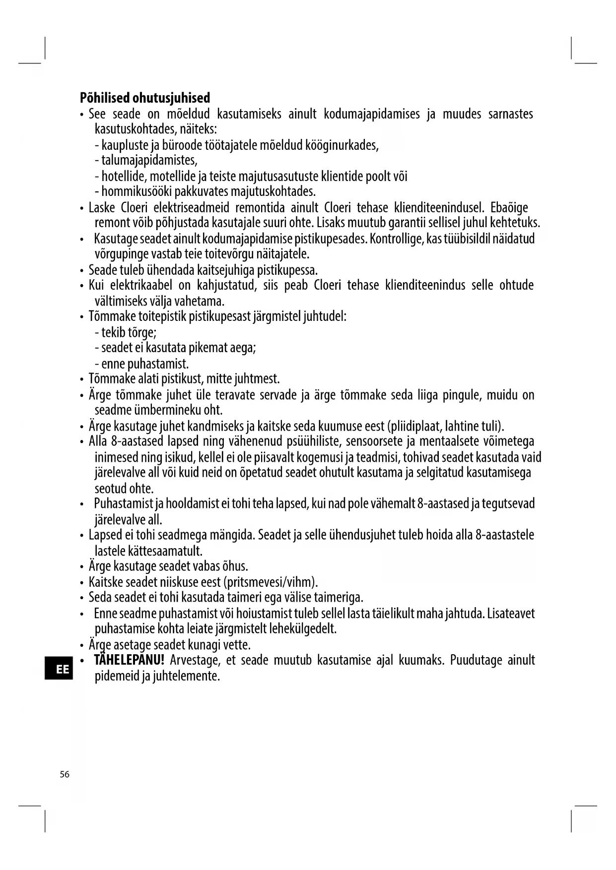 - Kui elektrikaabel on kahjustatud, siis peab Cloeri tehase klienditeenindus selle ohtude vältimiseks välja vahetama.