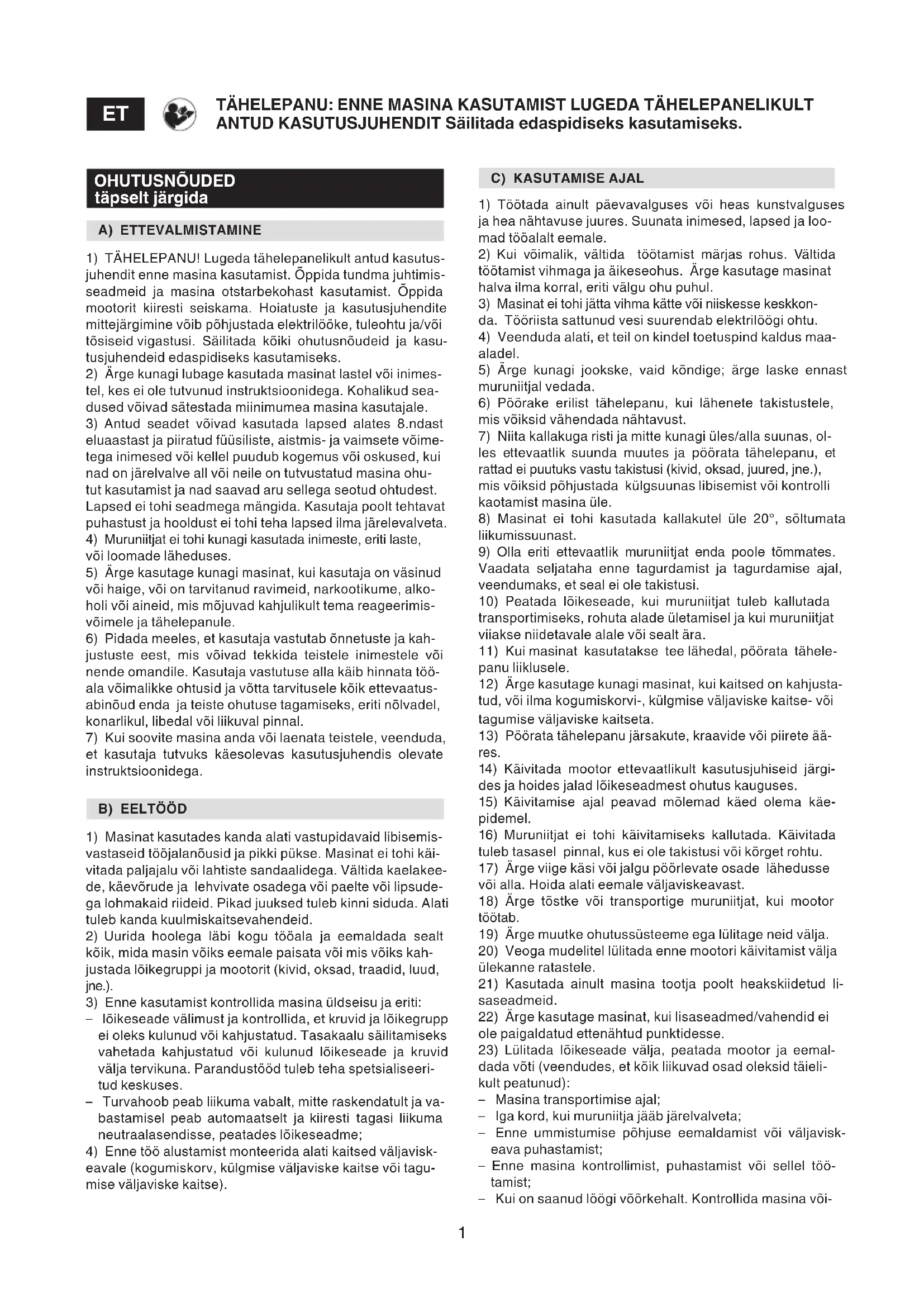 ETTEVAATUST: enne masina kasutamist lugeda tähelepanelikultkäesolevat kasutusjuhendit.