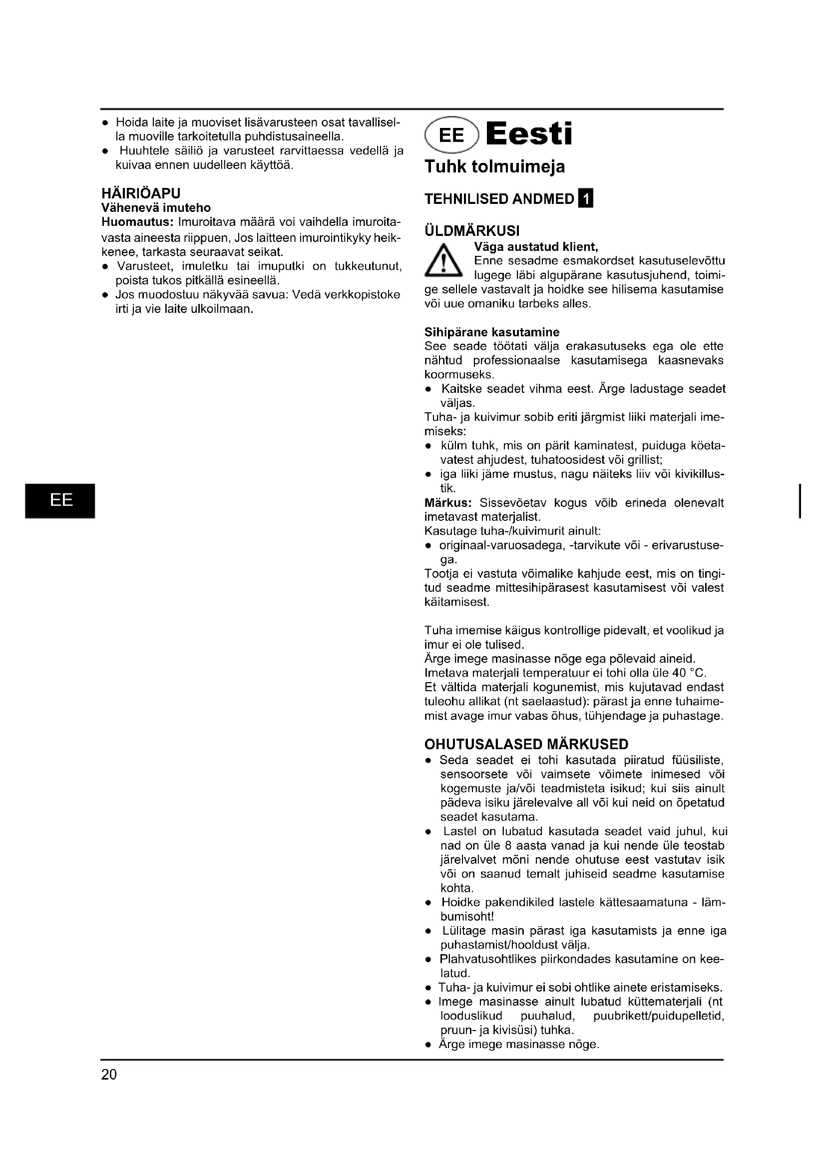 ● Seda seadet ei tohi kasutada piiratud füüsiliste, sensoorsete või vaimsete võimete inimesed või kogemuste ja/või teadmisteta isikud; kui siis ainult pädeva isiku järelevalve all või kui neid on õpetatud seadet kasutama.● Lastel on lubatud kasutada seadet vaid juhul, kui nad on üle 8 aasta vanad ja kui nende üle teostab järelvalvet mõni nende ohutuse eest vastutav isik või on saanud temalt juhiseid seadme kasutamise kohta.● Hoidke pakendikiled lastele kättesaamatuna - läm-bumisoht!● Lülitage masin pärast iga kasutamists ja enne iga puhastamist/hooldust välja.● Plahvatusohtlikes piirkondades kasutamine on kee-latud.● Tuha- ja kuivimur ei sobi ohtlike ainete eristamiseks.● Imege masinasse ainult lubatud küttematerjali (nt looduslikud puuhalud, puubrikett/puidupelletid, pruun- ja kivisüsi) tuhka.● Ärge imege masinasse nõge.● Hoida laite ja muoviset lisävarusteen osat tavallisel-la muoville tarkoitetulla puhdistusaineella.● Huuhtele säiliö ja varusteet rarvittaessa vedellä ja kuivaa ennen uudelleen käyttöä.