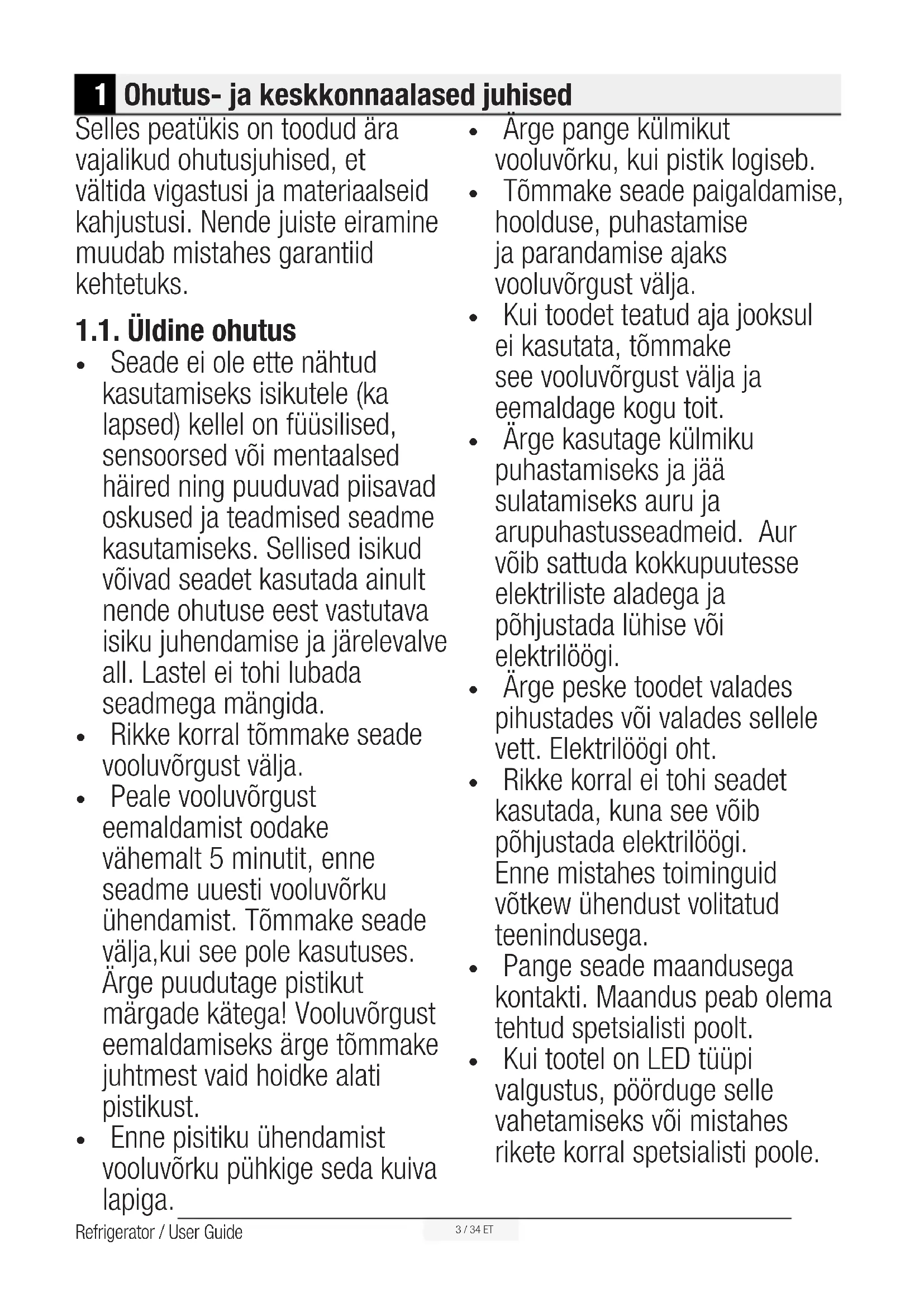 Elektrilöögi oht. Vastavalt rahvusvahelistele keskkon- nakaitse õigusaktidele on Toote pa- kend valmistatud taaskasutatavatest materjalidest.2 / 34 ET Refrigerator / User Guide 1 Ohutus- ja keskkonnaalased juhised 3 1.1. Üldine ohutus . . . . . . . . . . . . . . . . . . . . . . . 3