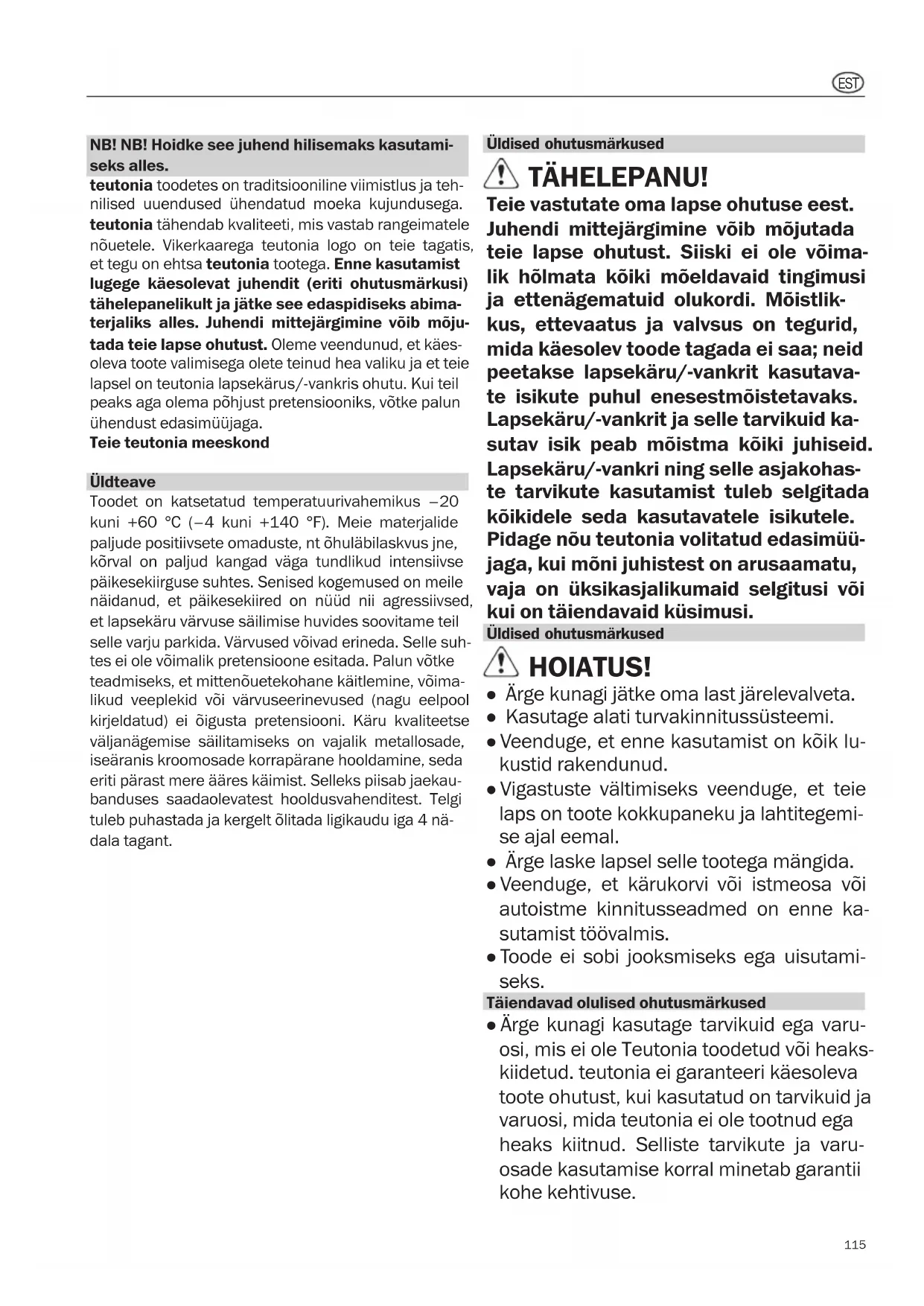 DĖMESIO: tvirtindami sėdynės uždangalą, atgal per- kiškite 5 padėčių saugos diržą per atitinkamas angas, taip, kad jis nesusisuktų. Nuimkite ir pritvirtinkite rankos atramos gaubtą Atlikite veiksmus priešinga tvarka norėdami pritvirtinti rankos atramos gaubtą. Kaip valyti dalis iš tekstilės Mažas dėmes šalinkite švariame vandenyje sudrėkintu audeklu. Kruopščiai patrinkite dėmę. Smarkiai netrinki- te (ypač tamsių medžiagų). Paprastai, visas nuimamas medžiagines dalis galima skalbti skalbyklėje ploniems audiniams skirta priemone (be baliklių) 30 °C/85 °F temperatūroje (tausojančia programa). Patikrinkite ats- kiras medžiaginių dalių priežiūros etiketes. Nuimkite ir išplaukite gaubtą Nuimkite strypus nuo gaubto: atlaisvinkite įspaudžia- mus stiebus ir ištraukite dangos skersinius iš jungties ir iš gaubto. Kai išplausite, sumontuokite atvirkštine tvar- ka. Atsuktuvu atlaisvinkite varžtą ir nuimkite laikiklį. Dabar ištraukite uždangalo grifą iš lanksto ir iš stogelio danga- lo. Išplovę sumontuokite atvirkštine tvarka. Pasitikrinkite, kad kiekvienas stogelio grifas būtų ki- šamas į sudygsniuotus takelius. Negalima supainioti priekinio grifo su užpakaliniu. Nuimkite ir pritvirtinkite galvos atlošo gaubtą Atlikite veiksmus priešinga tvarka norėdami pritvirtinti galvos atlošo gaubtą.NB! NB! Hoidke see juhend hilisemaks kasutami- seks alles. teutonia toodetes on traditsiooniline viimistlus ja teh- nilised uuendused ühendatud moeka kujundusega. teutonia tähendab kvaliteeti, mis vastab rangeimatele nõuetele. Vikerkaarega teutonia logo on teie tagatis, et tegu on ehtsa teutonia tootega. Enne kasutamist lugege käesolevat juhendit (eriti ohutusmärkusi) tähelepanelikult ja jätke see edaspidiseks abima- terjaliks alles. Juhendi mittejärgimine võib mõju- tada teie lapse ohutust. Oleme veendunud, et käes- oleva toote valimisega olete teinud hea valiku ja et teie lapsel on teutonia lapsekärus/-vankris ohutu. Kui teil peaks aga olema põhjust pretensiooniks, võtke palun ühendust edasimüüjaga. Teie teutonia meeskond Üldteave Toodet on katsetatud temperatuurivahemikus –20 kuni +60 °C (–4 kuni +140 °F). Meie materjalide paljude positiivsete omaduste, nt õhuläbilaskvus jne, kõrval on paljud kangad väga tundlikud intensiivse päikesekiirguse suhtes. Senised kogemused on meile näidanud, et päikesekiired on nüüd nii agressiivsed, et lapsekäru värvuse säilimise huvides soovitame teil selle varju parkida. Värvused võivad erineda. Selle suh- tes ei ole võimalik pretensioone esitada. Palun võtke teadmiseks, et mittenõuetekohane käitlemine, võima- likud veeplekid või värvuseerinevused (nagu eelpool kirjeldatud) ei õigusta pretensiooni. Käru kvaliteetse väljanägemise säilitamiseks on vajalik metallosade, iseäranis kroomosade korrapärane hooldamine, seda eriti pärast mere ääres käimist. Selleks piisab jaekau- banduses saadaolevatest hooldusvahenditest. Telgi tuleb puhastada ja kergelt õlitada ligikaudu iga 4 nä- dala tagant. Üldised ohutusmärkused TÄHELEPANU! Teie vastutate oma lapse ohutuse eest. Juhendi mittejärgimine võib mõjutada teie lapse ohutust. Siiski ei ole võima- lik hõlmata kõiki mõeldavaid tingimusi ja ettenägematuid olukordi. Mõistlik- kus, ettevaatus ja valvsus on tegurid, mida käesolev toode tagada ei saa; neid peetakse lapsekäru/-vankrit kasutava- te isikute puhul enesestmõistetavaks. Lapsekäru/-vankrit ja selle tarvikuid ka- sutav isik peab mõistma kõiki juhiseid. Lapsekäru/-vankri ning selle asjakohas- te tarvikute kasutamist tuleb selgitada kõikidele seda kasutavatele isikutele. Pidage nõu teutonia volitatud edasimüü- jaga, kui mõni juhistest on arusaamatu, vaja on üksikasjalikumaid selgitusi või kui on täiendavaid küsimusi. Üldised ohutusmärkused HOIATUS! ● Ärge kunagi jätke oma last järelevalveta. ● Kasutage alati turvakinnitussüsteemi. ● Veenduge, et enne kasutamist on kõik lu- kustid rakendunud. ● Vigastuste vältimiseks veenduge, et teie laps on toote kokkupaneku ja lahtitegemi- se ajal eemal. ● Ärge laske lapsel selle tootega mängida. ● Veenduge, et kärukorvi või istmeosa või autoistme kinnitusseadmed on enne ka- sutamist töövalmis. ● Toode ei sobi jooksmiseks ega uisutami- seks. Täiendavad olulised ohutusmärkused ● Ärge kunagi kasutage tarvikuid ega varu- osi, mis ei ole Teutonia toodetud või heaks- kiidetud. teutonia ei garanteeri käesoleva toote ohutust, kui kasutatud on tarvikuid ja varuosi, mida teutonia ei ole tootnud ega heaks kiitnud. Selliste tarvikute ja varu- osade kasutamise korral minetab garantii kohe kehtivuse.