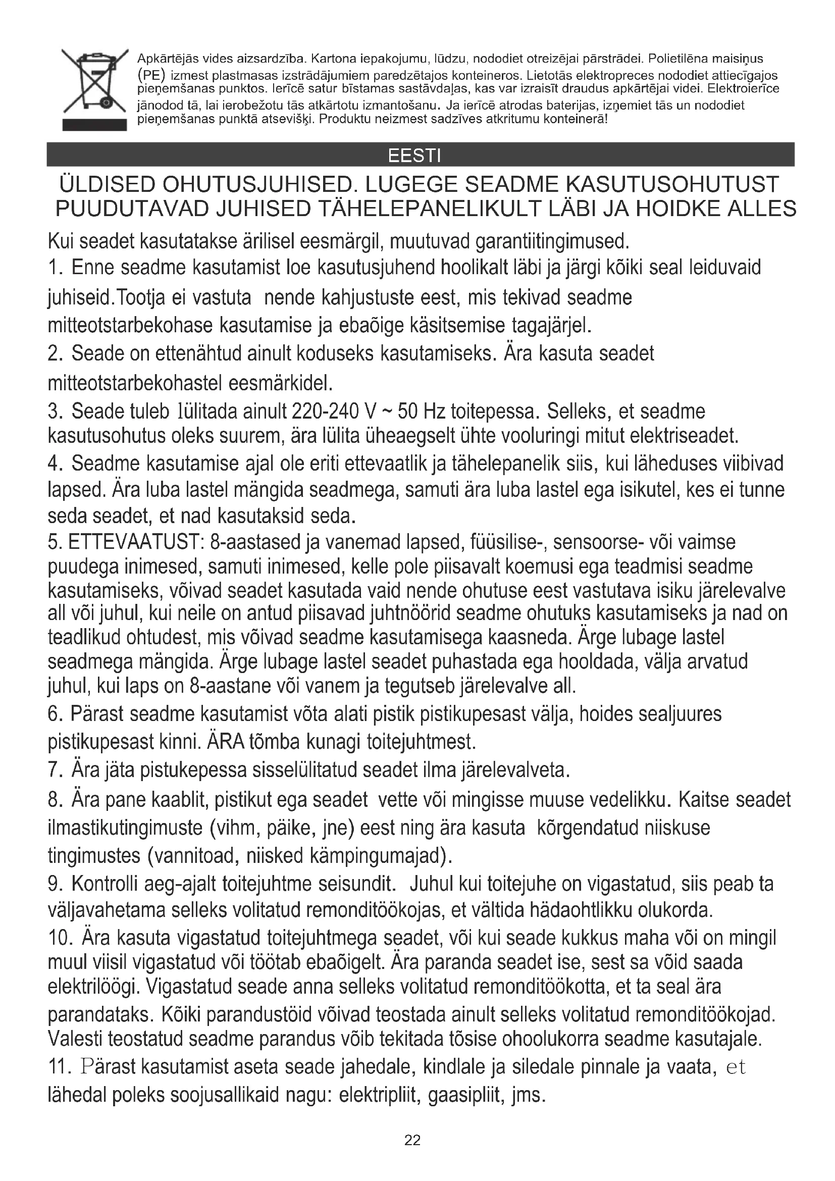 puudega inimesed, samuti inimesed, kelle pole piisavalt koemusi ega teadmisi seadme kasutamiseks, võivad seadet kasutada vaid nende ohutuse eest vastutava isiku järelevalve all või juhul, kui neile on antud piisavad juhtnöörid seadme ohutuks kasutamiseks ja nad on teadlikud ohtudest, mis võivad seadme kasutamisega kaasneda. Ärge lubage lastel seadmega mängida. Ärge lubage lastel seadet puhastada ega hooldada, välja arvatud juhul, kui laps on 8-aastane või vanem ja tegutseb järelevalve all.