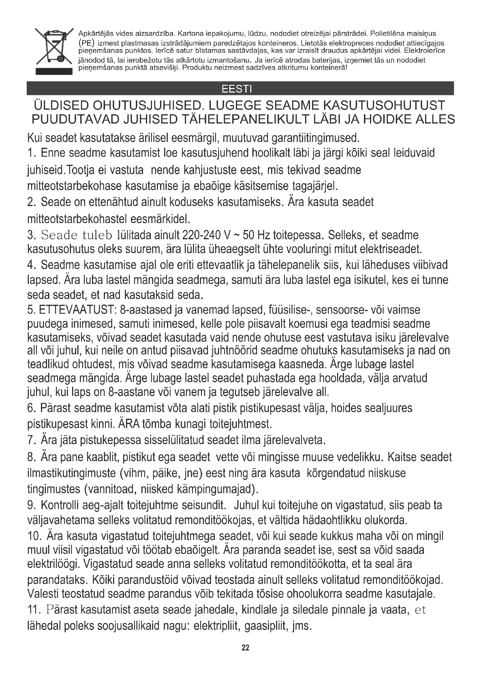 - ETTEVAATUST: 8-aastased ja vanemad lapsed, füusilise-, sensoorse- vöi vaimse puudega inimesed, samuti inimesed, kelle pole piisavalt koemusi ega teadmisi seadme kasutamiseks, vöivad seadet kasutada vaid nende ohutuse eest vastutava isiku järevalve all vöi juhul, kui neile on antud piisavad juhtnöörid seadme ohutuks kasutamiseks ja nad on teadlikud ohtudest, mis vöivad seadme kasutamisega kaasneda. Arge lubage lastel seadmega mängida. Arge lubage lastel seadet puhastada ega hooldada, valja arvatud juhul, kui laps on 8-aastane vöi vanem ja tegutseb järevalve all.