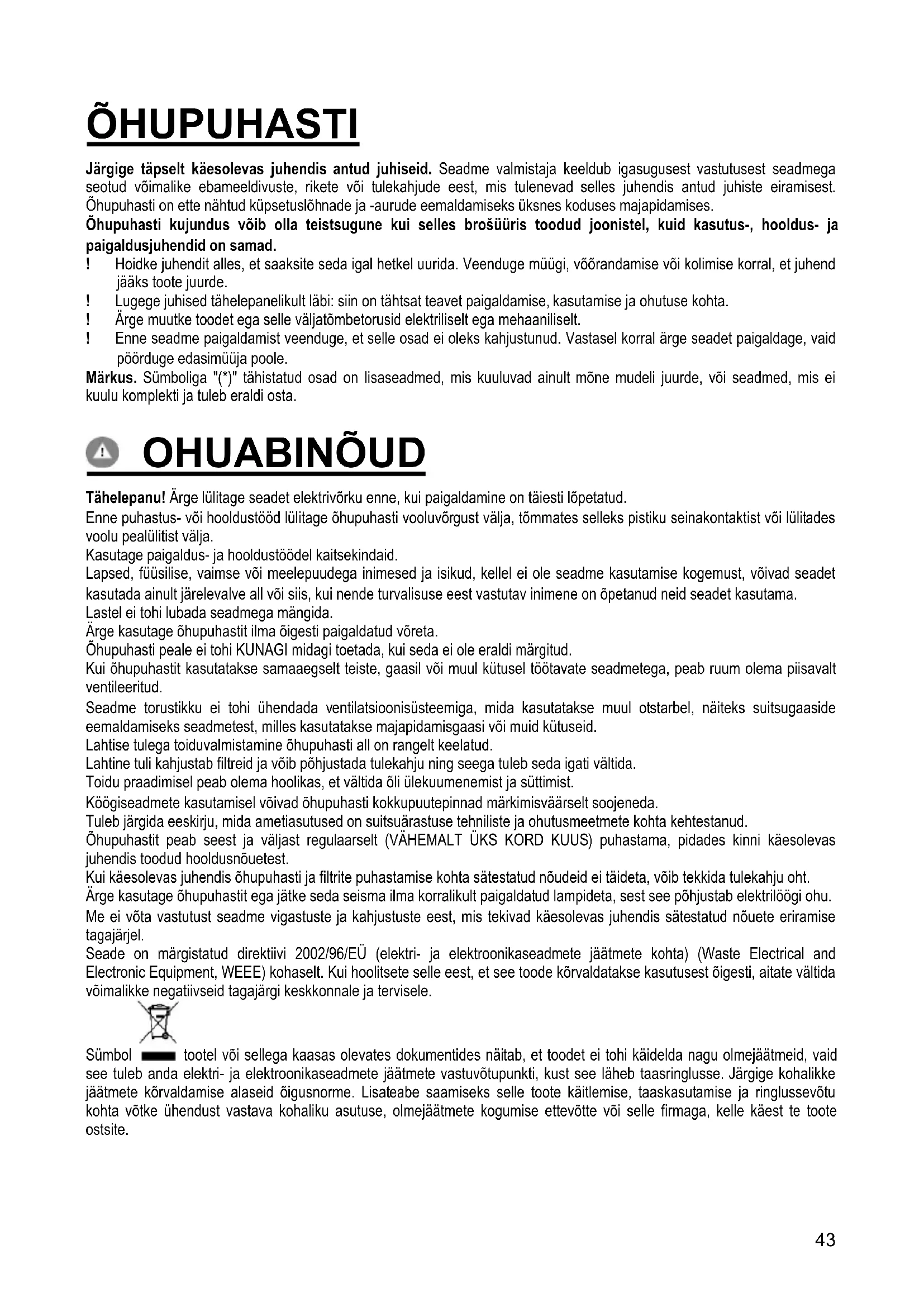 - Elektromagnetiline ühilduvus: EN 55014-1; CISPR 14-1; EN 55014-2; CISPR 14-2; EN/IEC 61000-3-2; EN/IEC 61000-3-3. Soovitused keskondlike mõjude vähendamiseks kasutamise ajal: Lülita tõmbekapp minimaalkiirusel sisse kohe kui oled hakanud sööki valmistama ning lase sel töötada paar minutit pärast toidu valmimist. Suurenda töökiirust vaid suure suitsu või auru korral ning kasuta intensiivrežiimi ainult hädavajaduse korral. Vaheta vajaduse tekkides välja söefiltrid, et tagada piisav lõhnaeemaldus. Puhasta vajaduse tekkides rasvafiltrid, et tagada piisav rasvaeemaldus. Kasutada juhendis näidatud maksimaalset ärajuhtimisava, et optimeerida tõhusus ja vähendada müra. ETTEVAATUST! Käesolevaid juhiseid täpselt järgimata ja seetõttu valesti paigaldatud kruvid ja kinnitusseadmed võivad põhjustada elektriohtu. KASUTAMINE Õhupuhasti on valmistatud nii, et seda saaks kasutada nii väljatõmberežiimis kui ka õhku filtreeriva toasisese tsirkulatsiooniga režiimis. Väljatõmberežiim Aur viiakse välja ühendusääriku külge kinnitatud väljatõmbetoru abil. Väljatõmbetoru diameeter peab olema sama suur kui ühendusvõru oma. Tähelepanu! Väljatõmbetoru ei kuulu komplekti ja tuleb ise osta. Toru horisontaalne lõik peab olema kergelt ülespoole kaldu (umbes 10°), et õhku kergemini väliskeskkonda viia. Kui õhupuhastil on söefiltrid, tuleb need eemaldada. Ühendage õhupuhasti väljatõmbetorude ja seinal asuvate väljalaskeavadega, mille diameeter on võrdne õhupuhasti väljalaskeava (ühendusäärikuga) omaga. Peenemate torude ja väiksemate seinal asuvate väljalaskeavade kasutamisel väheneb tõmme ja suureneb oluliselt müra. Seetõttu ei võta meie sellisel juhul endale mingit vastutust. ! Kasutage minimaalse vajaliku pikkusega toru. ! Kasutage võimalikult väheste põlvedega toru (torupõlve maksimaalne nurk: 90°). ! Vältige toru ristlõike olulist muutumist. ! Kasutage võimalikult sileda sisepinnaga toru. ! Toru materjal peab olema standarditega heaks kiidetud. Filtreeriv versioon Välja tõmmatud õhk puhastatakse rasvast ja lõhnatustatakse, enne kui see tagasi siseruumidesse juhitakse. Sellel režiimil kasutamiseks tuleb paigaldada täiendav aktiivsöega filtreerimissüsteem.45 PAIGALDAMINE Minimaalne vahekaugus pliidi pinna ja köögi õhupuhasti alumise ääre vahel ei tohi elektripliidi puhul olla väiksem kui 45cm ning gaasi- või kombineeritud pliidi puhul väiksem kui 50cm. Kui gaasipliidi paigaldusjuhendis nõutakse suuremat vahekaugust, tuleb seda arvesse võtta. Elektriühendus Võrgupinge peab vastama õhupuhasti sees asuval andmesildil toodud pingele. Kui õhupuhastil on pistik, ühendage see kehtivatele eeskirjadele vastavasse pistikupessa, mis asub ka pärast õhupuhasti paigaldamist ligipääsetavas kohas. Kui õhupuhastil pistikut ei ole (puhasti on otse võrku ühendatud) või kui pistik ei asu kohas, mis jääks ka pärast õhupuhasti paigaldamist ligipääsetavaks, paigaldage nõuetekohane kahepooluseline lüliti, mis kindlustaks vastavalt paigalduseeskirjadele III kategooria liigpinge korral täieliku eraldamise vooluvõrgust. Tähelepanu! Enne kui lülitate õhupuhasti uuesti elektrivõrku ja kontrollite, kas see töötab korralikult, kontrollige alati, kas võrgukaabel on korralikult monteeritud. Õhupuhastil on spetsiaalne toitekaabel; kui kaabel on kannatada saanud, pöörduge tehnoabi poole. Paigaldamine Kuna õhupuhasti on väga raske, siis peavad seda liigutama ja paigaldama vähemalt kaks inimest. Enne paigaldamise algust: