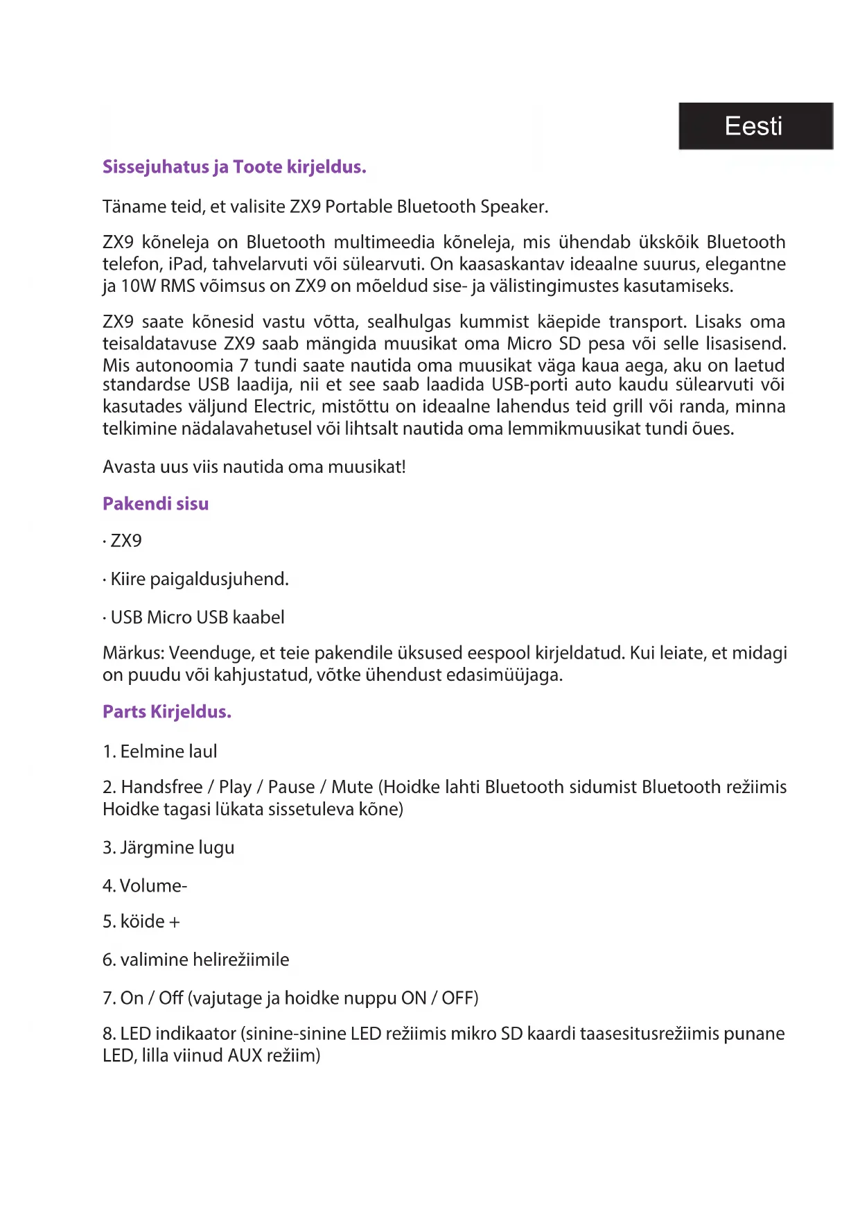 la batería, realice cargas periódicas. Soporte técnico: Por favor para más información sobre la instalación y conguración de este producto diríjase a nuestra web www.billowtechnology.comEesti Sissejuhatus ja Toote kirjeldus. Täname teid, et valisite ZX9 Portable Bluetooth Speaker. ZX9 kõneleja on Bluetooth multimeedia kõneleja, mis ühendab ükskõik Bluetooth telefon, iPad, tahvelarvuti või sülearvuti. On kaasaskantav ideaalne suurus, elegantne ja 10W RMS võimsus on ZX9 on mõeldud sise- ja välistingimustes kasutamiseks. ZX9 saate kõnesid vastu võtta, sealhulgas kummist käepide transport. Lisaks oma teisaldatavuse ZX9 saab mängida muusikat oma Micro SD pesa või selle lisasisend. Mis autonoomia 7 tundi saate nautida oma muusikat väga kaua aega, aku on laetud standardse USB laadija, nii et see saab laadida USB-porti auto kaudu sülearvuti või kasutades väljund Electric, mistõttu on ideaalne lahendus teid grill või randa, minna telkimine nädalavahetusel või lihtsalt nautida oma lemmikmuusikat tundi õues. Avasta uus viis nautida oma muusikat! Pakendi sisu