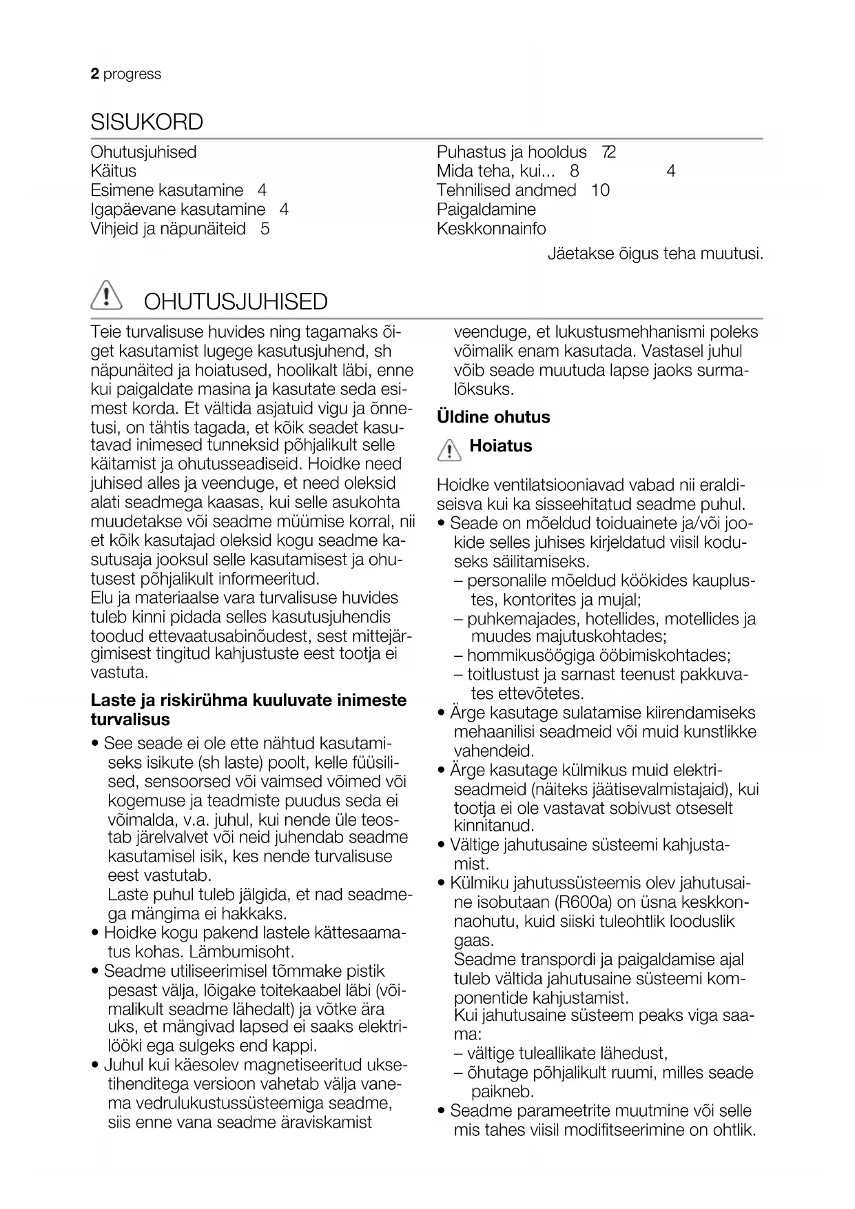 - Seadme parameetrite muutmine või selle mis tahes viisil modifitseerimine on ohtlik. 2 progressToitejuhtme kahjustamine võib põhjusta- da lühiühenduse, tulekahju ja/või elektri- löögi. Hoiatus Elektriliste komponentide (toi- tejuhe, pistik, kompressor) asendus- tööd tuleb ohu vältimiseks tellida kvali- fitseeritud tehnikult või teenusepakku- jalt.