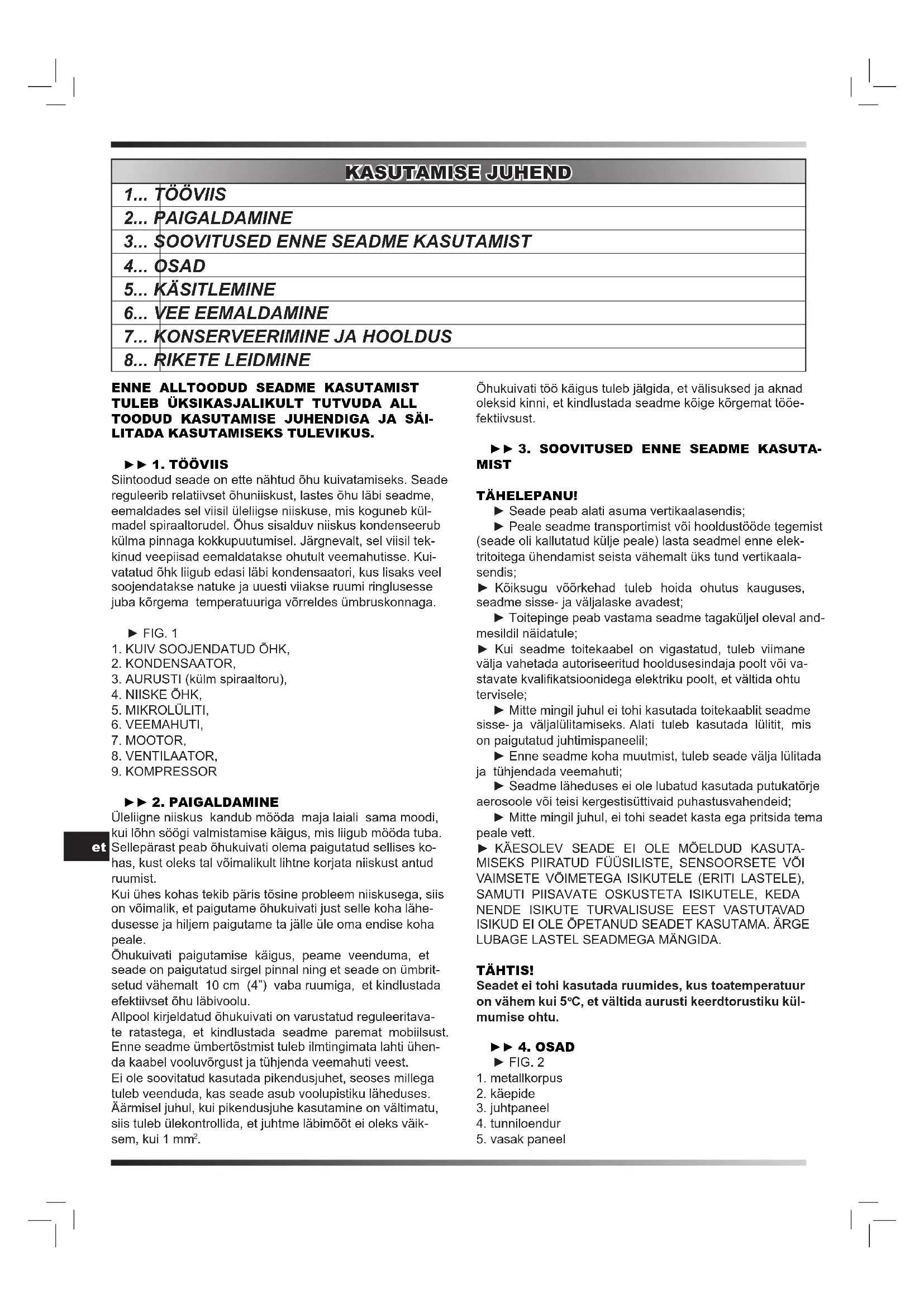 LITADA KASUTAMISEKS TULEVIKUS. ► 1. TÖÖVIIS Siintoodud seade on ette nähtud õhu kuivatamiseks. Seade reguleerib relatiivset õhuniiskust, lastes õhu läbi seadme, eemaldades sel viisil üleliigse niiskuse, mis koguneb kül- madel spiraaltorudel. Õhus sisalduv niiskus kondenseerub külma pinnaga kokkupuutumisel. Järgnevalt, sel viisil tek- kinud veepiisad eemaldatakse ohutult veemahutisse. Kui- vatatud õhk liigub edasi läbi kondensaatori, kus lisaks veel soojendatakse natuke ja uuesti viiakse ruumi ringlusesse juba kõrgema temperatuuriga võrreldes ümbruskonnaga. ► FIG. 1