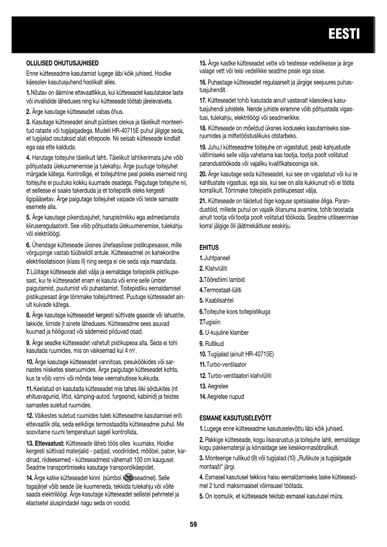 nagu „Kasutusjuhendis“ kirjeldatud. Soojust annab nüüd ainult turbo- ventilaator. Mudel aste I aste II aste I + II HR-40715E 600 900 1500 HR-40920E 800 1200 2000 HR-40920TE 800 1200 2000 HR-40920FE 800 1200 2000 + 500 W turbo HR-41120E 800 1200 2000 HR-41125E 1000 1500 250061 EESTI Kütteseade ja turbo-ventilaator