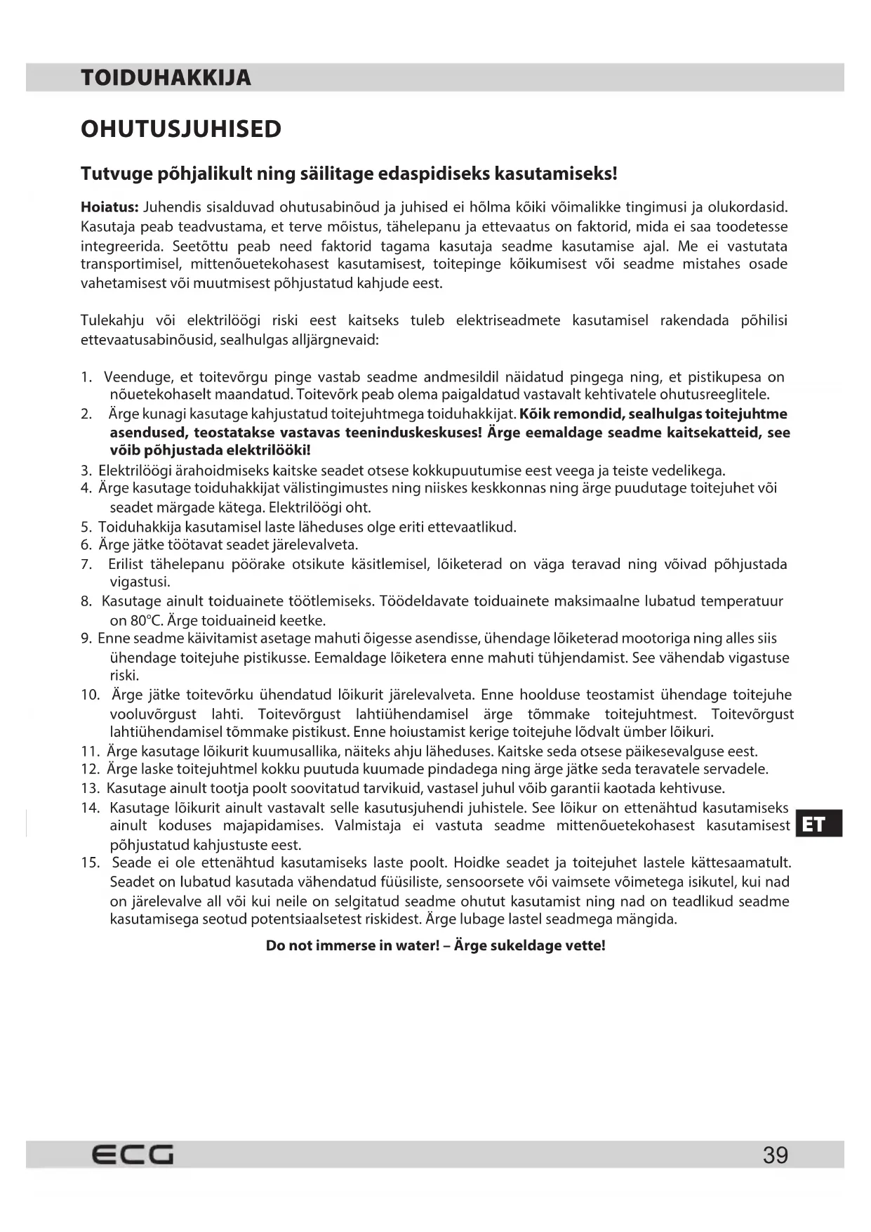 - Kasutage ainult toiduainete tootlemiseks. Tddeldavate toiduainete maksimaalne lubatud temperatuur on 80^ . Arge toiduaineid keetke.