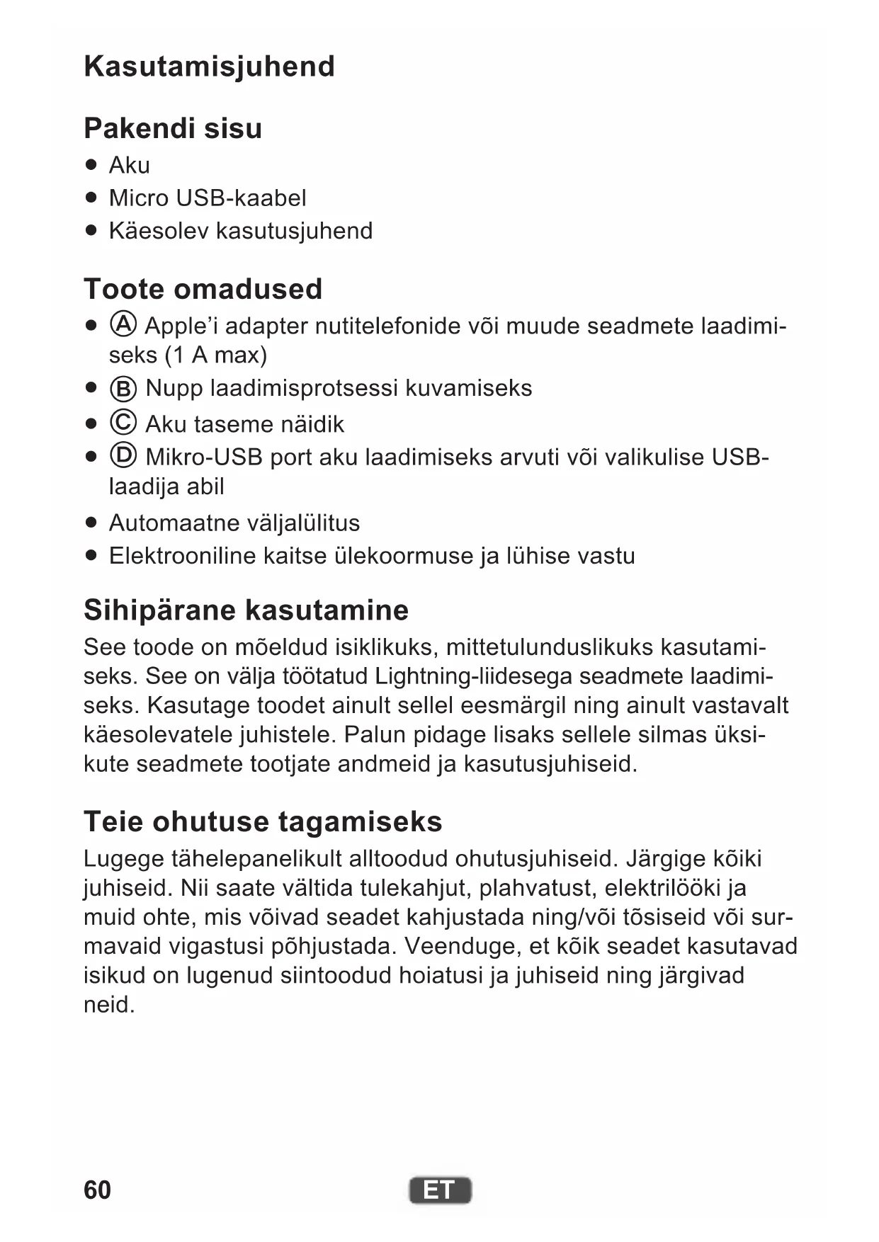 Elektrooniline kaitse ülekoormuse ja lühise vastu Sihipärane kasutamine See toode on mõeldud isiklikuks, mittetulunduslikuks kasutami- seks. See on välja töötatud Lightning-liidesega seadmete laadimi- seks. Kasutage toodet ainult sellel eesmärgil ning ainult vastavalt käesolevatele juhistele. Palun pidage lisaks sellele silmas üksi- kute seadmete tootjate andmeid ja kasutusjuhiseid. Teie ohutuse tagamiseks Lugege tähelepanelikult alltoodud ohutusjuhiseid. Järgige kõiki juhiseid. Nii saate vältida tulekahjut, plahvatust, elektrilööki ja muid ohte, mis võivad seadet kahjustada ning/või tõsiseid või sur- mavaid vigastusi põhjustada. Veenduge, et kõik seadet kasutavad isikud on lugenud siintoodud hoiatusi ja juhiseid ning järgivad neid.61