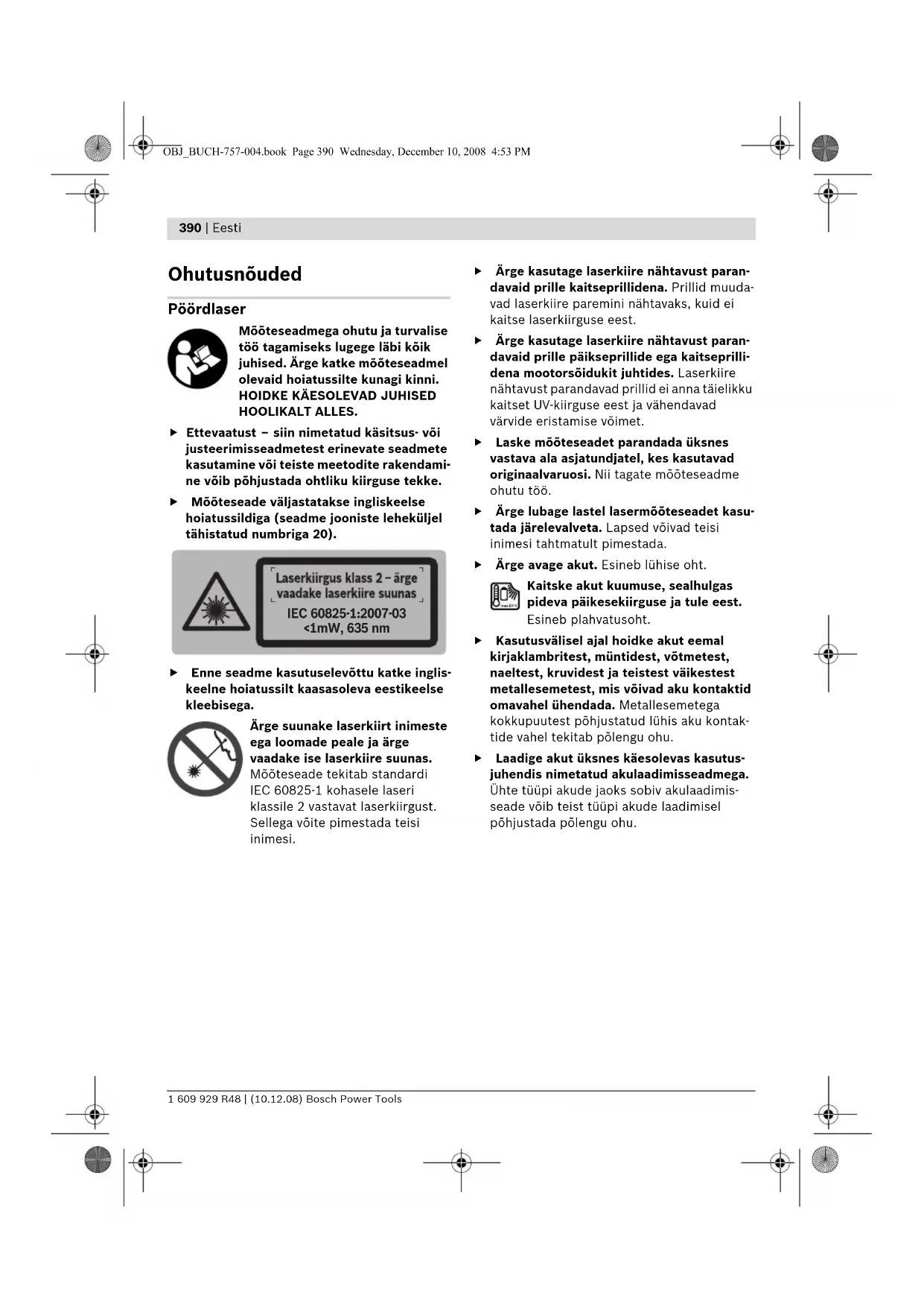 <1mW, 635 nm OBJ_BUCH-757-004.book Page 390 Wednesday, December 10, 2008 4:53 PMEesti | 391 Bosch Power Tools 1 609 929 R48 | (10.12.08) Akulaadija Kõik ohutusnõuded ja juhised tuleb läbi lugeda. Ohutusnõuete ja juhiste eiramise tagajärjeks võib olla elektrilöök, tulekahju ja/või rasked vigastused. Ärge jätke akulaadijat vihma ega niiskuse kätte. Vee sissetungimine elektrilisse tööriista suurendab elektrilöögi ohtu. f Ärge laadige akulaadimisseadmega teiste seadmete akusid. Akulaadimisseade on ette nähtud üksnes pöördlaseris kasutatava Boschi akukomplekti laadimiseks. Teiste seadmete akude laadimisel tekib süttimise ja plahvatuse oht. f Hoidke akulaadija puhas. Mustus tekitab elektrilöögi ohu. f Iga kord enne kasutamist kontrollige üle laa- dija, toitejuhe ja pistik. Vigastuste tuvasta- misel ärge akulaadijat kasutage. Ärge avage akulaadijat ise ja laske seda parandada vaid vastava ala spetsialistidel, kes kasutavad originaalvaruosi. Vigastatud akulaadija, toite- juhe ja pistik suurendavad elektrilöögi ohtu. f Ärge kasutage akulaadijat kergestisüttival pinnal (nt paberil, tekstiilidel jmt) ja süttimisohtlikus keskkonnas. Akulaadija kuumeneb laadimisel, mistõttu tekkib tulekahjuoht. f Väärkasutuse korral võib akuvedelik välja voolata. Vältige sellega kokkupuudet. Juhusliku kokkupuute korral loputage kahjustatud kohta veega. Kui vedelik satub silma, pöörduge lisaks arsti poole. Väljavoolav akuvedelik võib põhjustada nahaärritusi või põletusi. Laserkiire vastuvõtja Efektiivne töö mõõteseadmega on võimalik vaid juhul, kui olete eelnevalt põhjalikult läbi lugenud käesolevad kasutusjuhised ja ohu- tusnõuded ning peate neist täp- selt kinni. HOIDKE KÄESOLEVAD JUHISED HOOLIKALT ALLES. Ärge asetage mõõteseadet süda- mestimulaatorite lähedusse. Magnetplaat 29 tekitab välja, mis võib südamestimulaatorite tööd negatiivselt mõjutada. f Hoidke mõõteseadet eemal magnetilistest andmekandjatest ja magnetiliselt tundli- kest seadmetest. Magnetplaadi toime 29 võib andmed pöördumatult hävitada. Tööpõhimõtte kirjeldus Voltige kasutusjuhendi ümbris pöördlaseri, laadimisseadme ja laserkiire vastuvõtja joonis- tega lahti ning jätke see kasutusjuhendi luge- mise ajaks avatuks. Nõuetekohane kasutus Pöördlaser Mõõteseade on ette nähtud täpsete horisontaa- lide, vertikaalide, rihtjoonte ja loodipunktide kindlaksmääramiseks ja kontrollimiseks. Akulaadija Kasutage akulaadijat üksnes siis, kui Teil on täielik ülevaade selle kõikidest funktsioonidest ning suudate seda kasutada piiranguteta või kui olete saanud asjaomase väljaõppe. Laserkiire vastuvõtja Mõõteseade on ette nähtud pöörlevate laser- kiirte kiireks leidmiseks. OBJ_BUCH-757-004.book Page 391 Wednesday, December 10, 2008 4:53 PM392 | Eesti 1 609 929 R48 | (10.12.08) Bosch Power Tools Seadme osad Detailide numeratsiooni aluseks on pöördlaseri, akulaadimisseadme ja laserkiire vastuvõtja jooniste lehekülgedel toodud numbrid. Pöördlaser/akulaadimisseade 1 Hoiatussignaali näit 2 Hoiatussignaali nupp 3 Automaatse nivelleerumise näit 4 Pöördlaseri lüliti (sisse/välja) 5 Pöördliikumise ja pöörlemiskiiruse valiku nupp 6 Muutuv laserkiir 7 Kaugjuhtimispuldi signaali vastuvõtuväli 8 Laserkiire väljumisava 9 Loodikiir 10 Pöörlev pea 11 Joonliikumise ja joone pikkuse valiku nupp 12 Laetuse astme näit 13 Aku* 14 Patareipesa 15 Patareikorpuse lukustusnupp 16 Aku lukustusnupp* 17 Laadija pistiku pesa* 18 5/8"-keermega statiivi ava 19 Pöördlaseri seerianumber 20 Laseri hoiatussilt 21 Akulaadimisseade* 22 Akulaadimisseadme võrgupistik* 23 Laadimispistik* Laserkiire vastuvõtja* 24 Patareikorpuse kaane lukustus 25 Laserkiire vastuvõtja libell 26 Laserkiire vastuvõtja lüliti (sisse/välja) 27 Mõõtetäpsuse reguleerimise nupp 28 Helisignaali nupp 29 Magnetplaat 30 Keskpunkti märgistus 31 Laserkiire vastuvõtuväli 32 Ekraan 33 Hoidiku kinnitusava 34 Patareikorpuse kaas 35 Laserkiire vastuvõtja seerianumber 36 Kanduri kinnituskruvi 37 Hoidiku ülaserv 39 Kanduri kinnituskruvi 40 Kandur 41 Kanduri libell Laserkiire vastuvõtja näidikud a Seadistuse „keskmine“ näit b Patarei madala pinge sümbol c Ülemine suunanäit d Helisignaali näit e Keskpunkti näit f „Täpse“ seadistuse näit