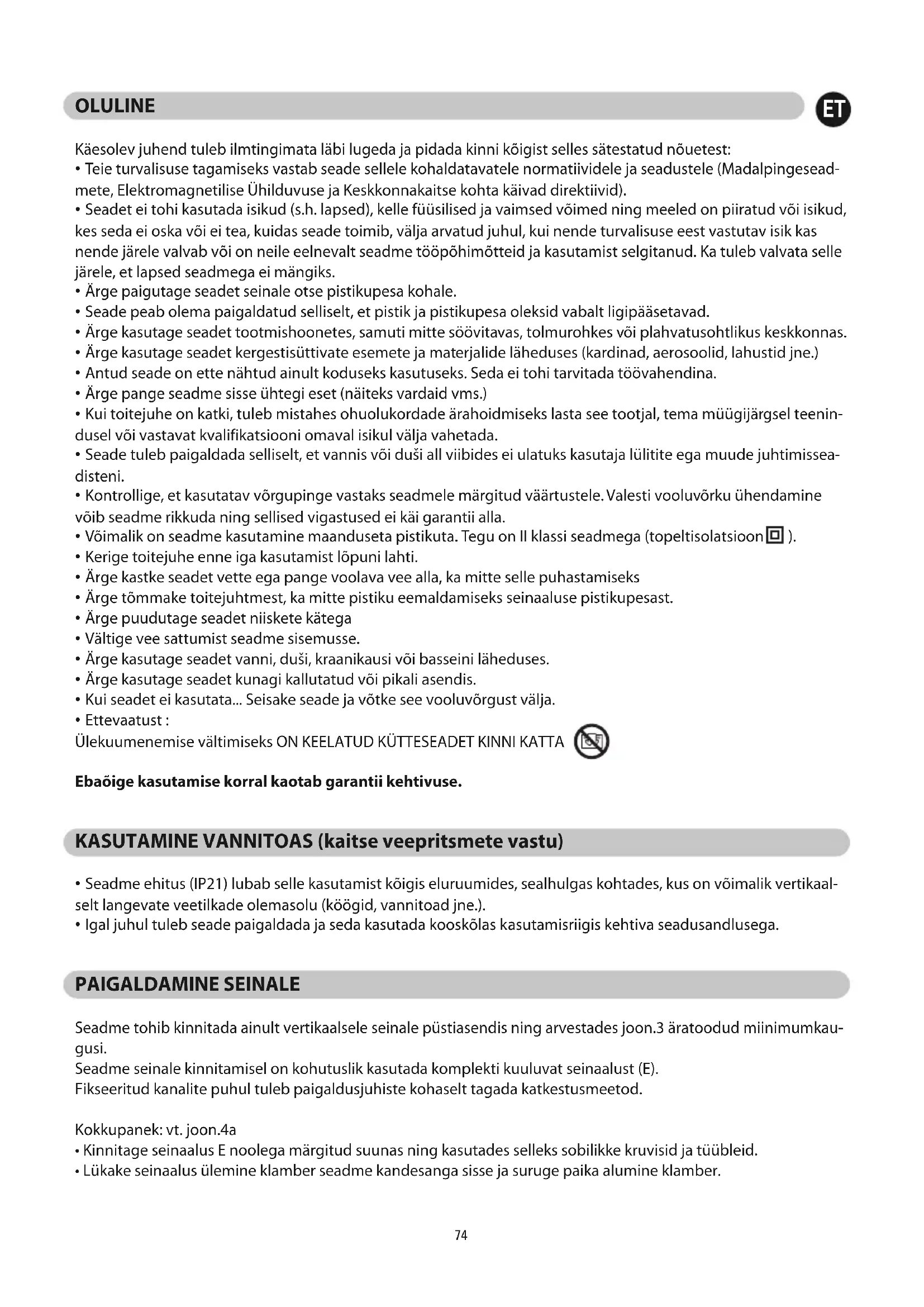 - Seadme ehitus (IP21) lubab selle kasutamist kõigis eluruumides, sealhulgas kohtades, kus on võimalik vertikaal- selt langevate veetilkade olemasolu (köögid, vannitoad jne.).