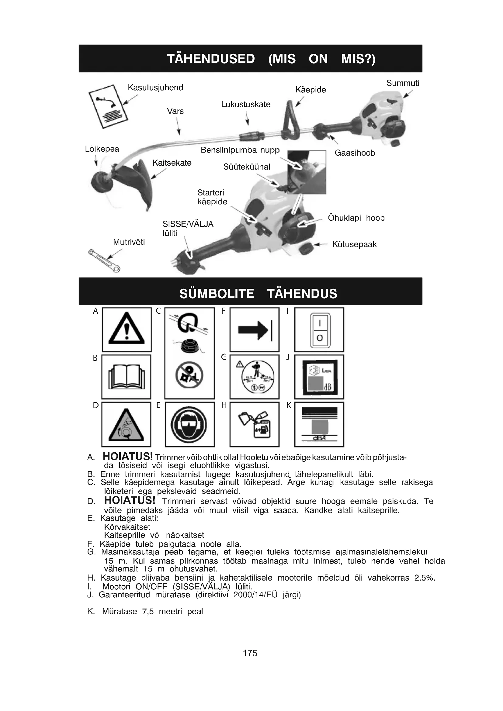 A. HOIATUS!Trimmer võibohtlik olla!Hooletu või ebaõige kasutamine võibpõhjusta- da tõsiseid või isegi eluohtlikke vigastusi. B. Enne trimmeri kasutamist lugege kasutusjuhend tähelepanelikult läbi. C. Selle käepidemega kasutage ainult lõikepead. Ärge kunagi kasutage selle rakisega lõiketeri ega pekslevaid seadmeid.