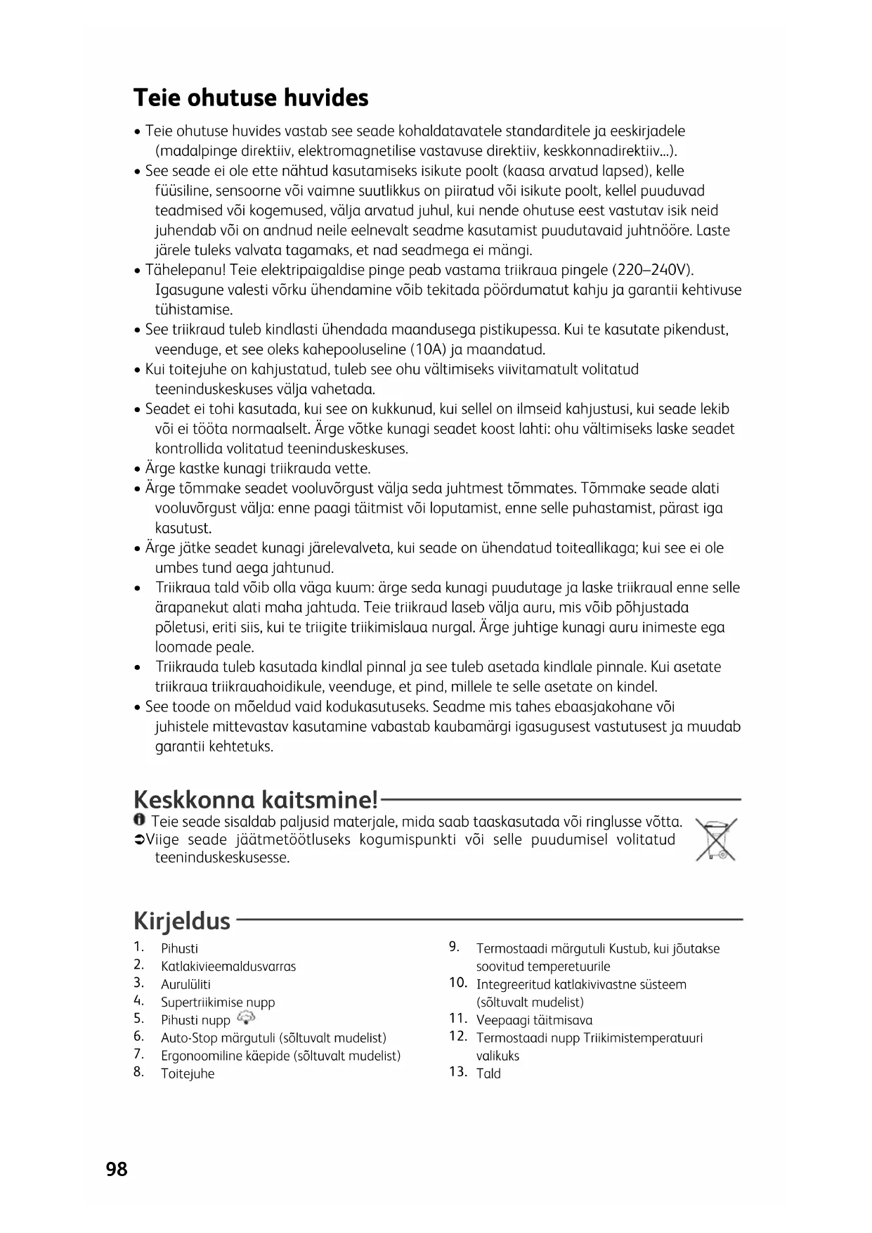 - Teie ohutuse huvides vastab see seade kohaldatavatele standarditele ja eeskirjadele (madalpinge direktiiv, elektromagnetilise vastavuse direktiiv, keskkonnadirektiiv...).