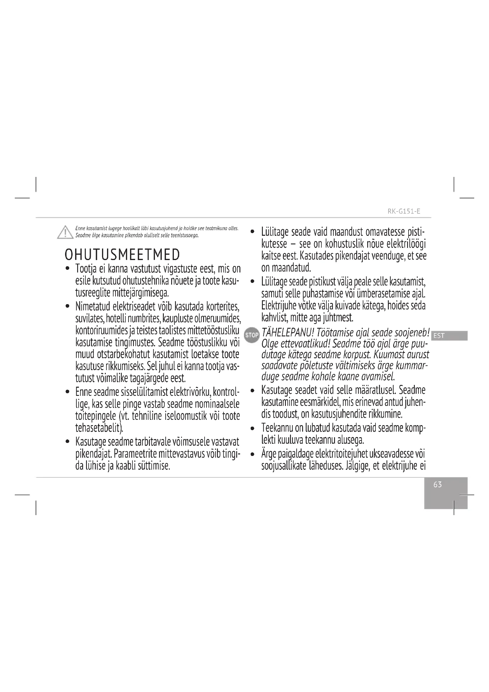 Antud seadmele antakse 2 aastat garantii alates selle soetamisest. Garantiiaja jook- sul kohustub valmistaja remondi, detailide asendamise või kogu seadme asendami- se teel kõrvaldama mistahes tehasedefektid, esile kutsutud materjalide ebapiisava kvaliteedi või kokkupanekuga. Garantii jõustub vaid sel juhul, kui ostukuupäev on kinnitatud kaupluse pitsatiga ja müüja allkirjaga originaalsel garantiitalongil. Käes- olevat garantiid tunnistatakse vaid juhul, kui seadet kasutati vastavalt juhendile, seda ei remonditud, ei võetud lahti ja ei olnud vigastatud selle ebaõigel kasutamisel, samuti juhul, kui on säilinud seadme täielik Komplektaktsioon. Nimetatud garantii ei laiene seadme loomulikule kulumisele ja kulumaterjalidele (ltrid, lambid, kõrbe- misvastased katted, tihendid jne.). Toote teenistusaega ja garantiikohustuste kehtivusaega arvestatakse selle ostupäevast või toote valmistamise päevast (juhul, kui müügi kuupäeva ei ole võimalik tuvastada). Seadme valmistamise kuupäeva võib leida seerianumbris, mis paikneb toote korpusel oleval identitseerimise sildil. Seerianumber koosneb 13 märgist. 6 ja 7 märk tähistavad kuud, 8 märk — seadme väljalaske aastat. Tootja poolt kehtestatud teenistusaeg — 3 aastat selle soetamise hetkest alates. Täht- aeg kehtib juhul, et toodet kasutatakse vastavalt juhendile ja rakendatavatele tehni- listele standarditele. Nimetatud garantiiaeg on kehtiv tingimusel, et seadme kasutus toimub ranges vastavuses käesoleva instruktsiooniga ja esitatud tehniliste nõuetega. Keskkonnasõbralik jäätmekäitlus (elektri- ja elektroonikaseadmete romude käitlemine) Pakend, kasutusjuhend ja seade tuleb kõrvaldada kohalike jäätmekäitlu- seeskirjade järgi. Hoidke keskkonda: ärge visake selliseid seadmeid olme- jäätmete hulka. Kasutusest kõrvaldatavaid (vanu) seadmeid ei tohi visata olmeprügi hulka, vaid neid tuleb käidelda eraldi. Vanade seadmete omanikud peavad viima need seadmed vasta- vatesse kogumispunktidesse. Sellega aitate kaasa väärtuslike toorainete ümbertöötle- misele ja väldite saasteainete sattumist keskkonda. Käesolev seade on märgistatud vastavalt Euroopa direktiivile 2012/19/EL, mis regu- leerib elektri- ja elektroonikaseadmete jäätmete käitlemist. See direktiiv määratleb elektri- ja elektroonikaseadmete jäätmete kõrvaldamise ja taaskasutamise põhinõuded, mis kehtivad kogu Euroopa Liidus.RK-G151-E