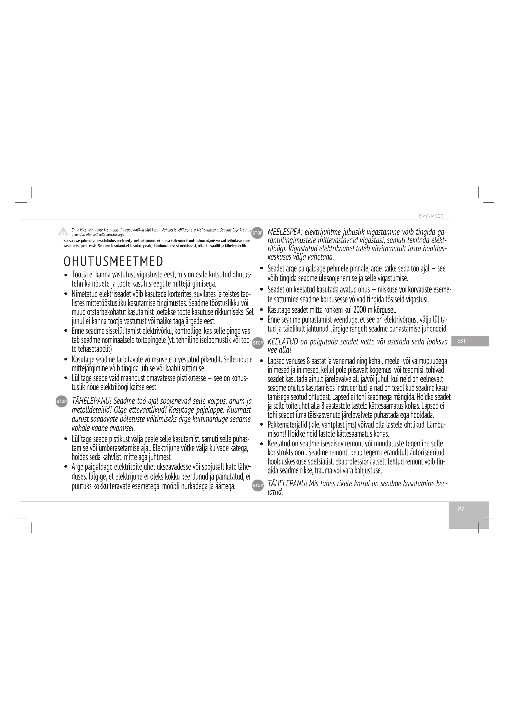 (LK 8). Tähelepanu! Klapikummist tihendi deformeerumise vältimiseks ärge seda eemaldamisel, puhastamisel ja paigaldamisel väänake ega tõmmake välja. Kondensaadi eemaldamine Selle mudeli kondensaat koguneb spetsiaalne süvend keha seadme ümber kausi ja voolab spetsiaalne konteiner asub seadme tagaosas. Mahuti puhastamiseks loputage seda voolava vee all, järgides eespool toodud reegleid. Eemalda ülejää- nud kondensatsiooni õõnes ümber kausi koos köök lapiga. Töökambri puhastamine Rangelt juhiseid käesoleva manuaal, tõenäosus, vedel -, toidu osakesi või mustust sisenevad töö koda seade on minimaalne. Olulise saastumise korral tuleb töökambri pinnad puhastada, et vältida seadme ebaõiget töötamist või kahjustamist. Enne puhastamist töötab koda seade veenduge, et seade on lahti ühendatud ja täielikult jahtunud! Külgseinte töö koda, pinna kütte-ketas ja korpus on kesk temperatuuri andur (asub keset kütte-ketas) võib puhastada niiske (mitte märja!) käsn või riie. Kui te kasutate pesuvahendit, siis tuleb hoolikalt eemaldada jääk, et vältida välimuse soovimatu lõhn ajal järgnevate toiduvalmistamiseks. Kui välisobjektid sattuda vaheaja ümber Kesk temperatuuriandur, hoolikalt eemaldada pintsetid, ilma vajutades anduri korpus. Kui kütteketta pind on määrdunud, on lubatud kasutada niisutatud keskmise kõvadusega käsna või sünteetilist pintslit. Mis regulaarne kasutamine seadme aja jooksul, Värvi kütteketta saab täielikult või osaliselt muuta. See ei ole märk rikkest ega mõjuta seadme õiget tööd.103 RMC-M90E FIN LT U LVA EST Veondus ja Laondus Enne hoiulepanemist ja uuesti kasutamist puhastage ja kuivatage hoolikalt kõik seadme osad. Hoidke seadet kuivas ja hea ventilatsiooniga kohas eemal küttekehadest ja otsesest päikesevalgusest. Transportimise ja hoidmise ajal ei tohi seade olla mehaanilise koormuse all, mis võiks seadmele kahjustusi põhjustada ja/ või selle pakendi terviklikkuse rikkuda. Hoidke seadme pakendit vee või vedelike sissetungi eest. V I I . ENNE HOOLDUSKESKUSESSE PÖÖRDUMIST Rike Võimalik põhjus Abinõu Ekraanile ilmus veateade: Е1–Е4 Süsteemi viga, võimalik juhtplaadi või kuumutusele- mendi rike. Lülitage seade vooluvõrgust välja ja laske sellel maha jahtuda. Sulgege tihedalt kaas ja ühendage seade uuesti vooluvõrku. Ekraanile ilmus veateade: Е5–Е7 Automaatne ülekuumenemise kaitse on aktiveeritud Ära lülita seadet sisse, kui kauss tühi on! Eemalda seade vooluvõrgust, ava kaas ning lase 10–15 minutit jahtuda, seejärel jätka küpsetamist. Ära lisa kaussi vett, kui programmid MULTI COOK (kui temperatuur on sätestatud üle 100°C) ja FRY on sisselülitatud. Kui temperatuur on FRY programmis sätestatud üle 120°C ja MULTI COOK programmis üle 130°C, siis küpseta lahtise kaanega. Seade ei lülitu sisse. Toitejuhe ei ole seadmega ja (või) elektrikontakti ühen- datud. Veenduge, et eemaldatav toitejuhe on ühendatud seadmega ja elektrikontakti. Vale elektrikontakt. Ühendage seade õigesse elektrikontakti. Toitevõrgus pole voolu. Kontrollige elektrivõrgu pinget. Kui seda pole, pöörduge elektrivõrgu teenusepakkuja poole. Toiduvalmistamiseks ku- lub liiga palju aega. Elektritoite katkestus (pinge ei ole stabiilne või on alla normi). Kontrollige elektrivõrgu pinge stabiilsust. Kui pinge kõigub, pöörduge elektrivõrgu teenusepa- kkuja poole. Sisepoti ja kuumutuselemendi vahel on võõrkeha või toidujäätmed (purud, tangud, toidutükid). Lülitage seade vooluvõrgust välja ja laske sellel maha jahtuda. Eemaldage võõrkeha või toiduo- sakesed. Sisepott on seadmes viltu. Paigutage sisepott otse. Kuumutusplaat on tugevalt määrdunud. Lülitage seade vooluvõrgust välja ja laske sellel maha jahtuda. Puhastage kuumutusplaat. Toiduvalmistamise ajal tuleb kaane vahelt auru. Sisepoti ja sisekaane vaheline ühendus ei ole hermeetiline. Sisepott on korpuses viltu. Paigutage sisepott otse. Kaas ei ole tihedalt kinni või on kaane vahele sattunud mingi võõrkeha. Veenduge, et kaane ja korpuse vahel ei oleks mingit võõrkeha (puru, tangusid, toidutükke). Eemaldage võõrkeha. Sulgege multikeetja kaas alati nii, et kostaks klõpsatus. Sisekaane tihend on tugevalt määrdunud, deformeerunud või kahjustatud. Kontrollige seadme sisekaane tihendi seisundit. Vajaduse korral vahetage välja. Kui probleemi ei õnnestu lahendada, pöörduge volitatud teeninduskeskuse poole. Keskkonnasõbralik jäätmekäitlus (elektri- ja elektroonikaseadmete romude käitlemine) Pakend, kasutusjuhend ja seade tuleb kõrvaldada kohalike jäätmekäitluseeskirjade järgi. Hoidke keskkonda: ärge visake selliseid seadmeid olmejäätmete hulka. Kasutusest kõrvaldatavaid (vanu) seadmeid ei tohi visata olmeprügi hulka, vaid neid tuleb käidelda eraldi. Va- nade seadmete omanikud peavad viima need seadmed vastavatesse kogumispunktidesse. Sellega aitate kaasa väärtuslike toorainete ümbertöötlemisele ja väldite saasteainete sattumist keskkonda. Käesolev seade on märgistatud vastavalt Euroopa direktiivile 2012/19/EL, mis reguleerib elektri- ja elektroonikaseadmete jäätmete käitlemist. See direktiiv määratleb elektri- ja elektroonikaseadmete jäätmete kõrvaldamise ja taaskasutamise põhinõuded, mis kehti- vad kogu Euroopa Liidus.104 Citiţi cu atenţie toate instrucţiunile înainte de utilizare a acestui produs şi ţineţi aceste instrucţiuni la îndemînă. Utilizarea corectă a aparatului va prelungi în mod esenţial durata lui de exploatare. Măsurile de siguranţă şi instrucţiunile, cuprinse în acest manual,nu acoperă toate situaţiile posibile, care pot apărea în procesul de exploatare a dispozitivului. Atunci când se utilizează dispozitivul utilizatorul trebuie să e ghidat de bunul simţ, să e atent și grijuliu.