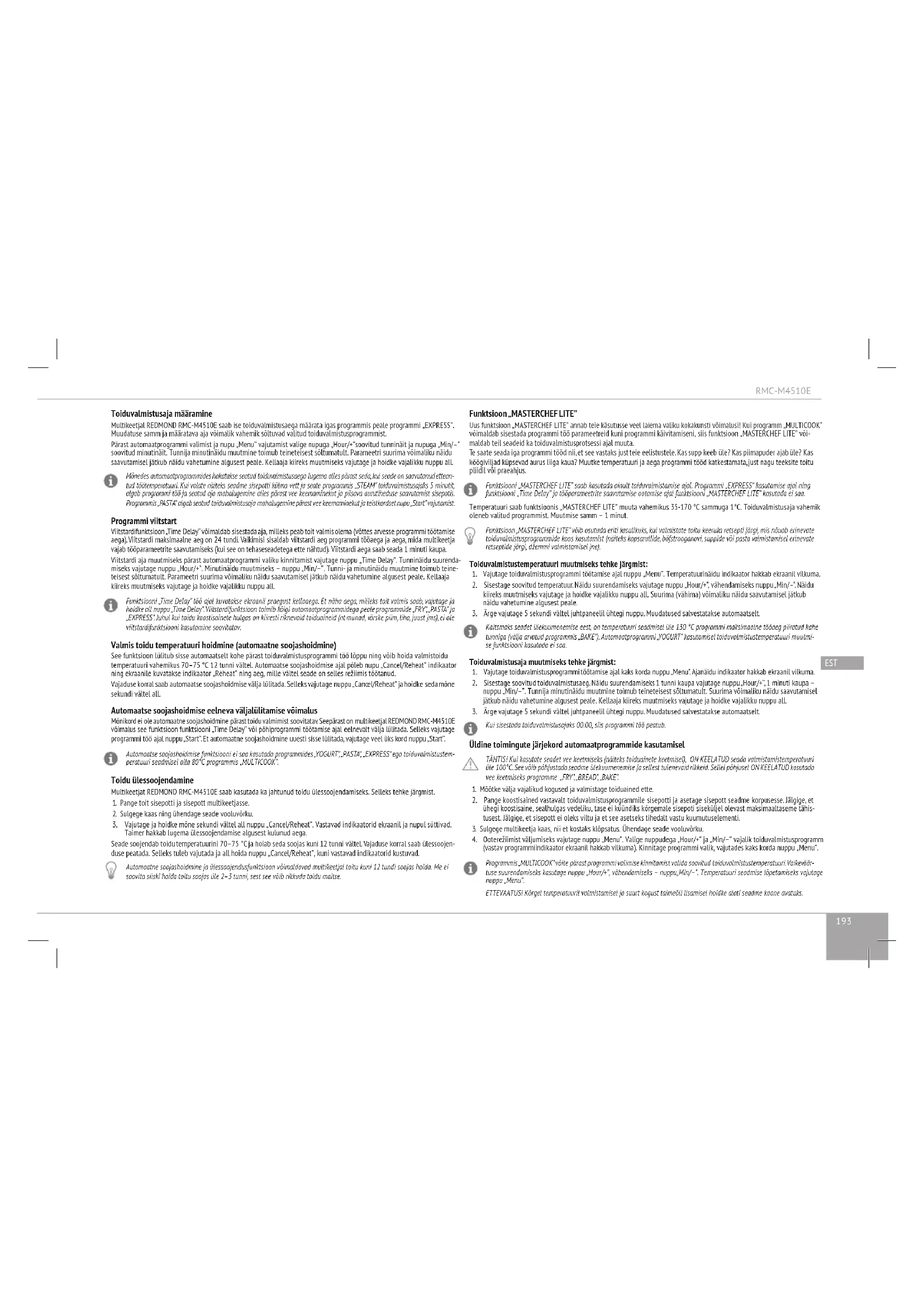 tage ja hoidke mõni sekund all nuppu „Cancel/Reheat”. Kvaliteetse tulemuse saamiseks soovitame kasutada spetsiaalselt selle mudeli jaoks välja töötatud toiduretsepte REDMOND RMC-М4510E juurde kuuluvast kokaraamatust. Need retseptid leiate ka veebilehelt www.redmond.company. Kui teie arvates ei ole tavaliste automaatprogrammide abil võimalik soovitud tulemust saavutada, kasutage universaalset programmi „MULTICOOK”, mis annab teie käsutusse rohkelt võimalusi kulinaarseteks katsetusteks. Programm „MULTICOOK” See programm on ette nähtud toitude valmistamiseks kasutaja määratud toiduvalmistamistemperatuuri ja -aja parameetri- te järgi. Programm „MULTICOOK” võimaldab multikeetjaga REDMOND RMC-М4510E asendada tervet rida köögiseadmeid ja valmistada toitu vanades kokaraamatutes või Internetis leiduvate mitmesuguste retseptide järgi. Kui toiduvalmistustemperatuur ei ületa 80°С, on automaatse soojashoidmise funktsioon välja lülitatud ja seda ei saa käsitsi sisse lülitada. Vaikimisi on toiduvalmistusaeg programmis „MULTICOOK” 30 minutit, ja toiduvalmistustemperatuur 100°С. Temperatuuri käsitsi seadmise vahemik on programmis 35–170°С, muuta saab 5°С kaupa. Aja käsitsi seadmise vahemik on 2 minutit kuni 15 tundi, muuta saab 1 minuti kaupa. TÄHELEPANU! Ohutuse eesmärgil on toiduvalmistusaeg kõrgema kui 130°С temperatuuriseade korral piiratud kahe tunniga. Programmis „MULTICOOK” saab valmistada väga mitmesuguseid toitusid. Kasutage kaasasolevat kokaraamatut retseptidega meie professionaalsetelt kokkadelt või spetsiaalset tabelit eri toitude ja toiduainete jaoks soovitatud temperatuuridega. Vaja- likud retseptid leiate ka veebisaidilt www.redmond.company. Programmis «MULTICOOK» on võimalik valmistada hulgaliselt erinevaid toite. Kasutage raamatut «100 retsepti» meie profes- sionaalsetelt kokkadelt või spetsiaalset temperatuuritabelit erinevate toitude ja toiduainete valmistamiseks. Programm „PILAF” Programm on mõeldud mitmesuguste pilafde valmistamiseks. Vaikimisi on toiduvalmistusajaks selles programmis määratud 35 minutit. Toiduvalmistusaega saab käsitsi muuta vahemikus 10 minutit kuni 2 tundi, seada saab 5 minuti kaupa. Programm „STEAM” Programm on mõeldud liha, linnuliha, kala, köögiviljade ja kombineeritud toitude aurus küpsetamiseks. Vaikimisi on toidu- valmistusajaks programmis määratud 30 minutit. Toiduvalmistusaega saab käsitsi muuta vahemikus 10 minutit kuni 2 tundi, seada saab 5 minuti kaupa. Selles programmis toidu valmistamiseks kasutage spetsiaalset nõud (kuulub komplekti):