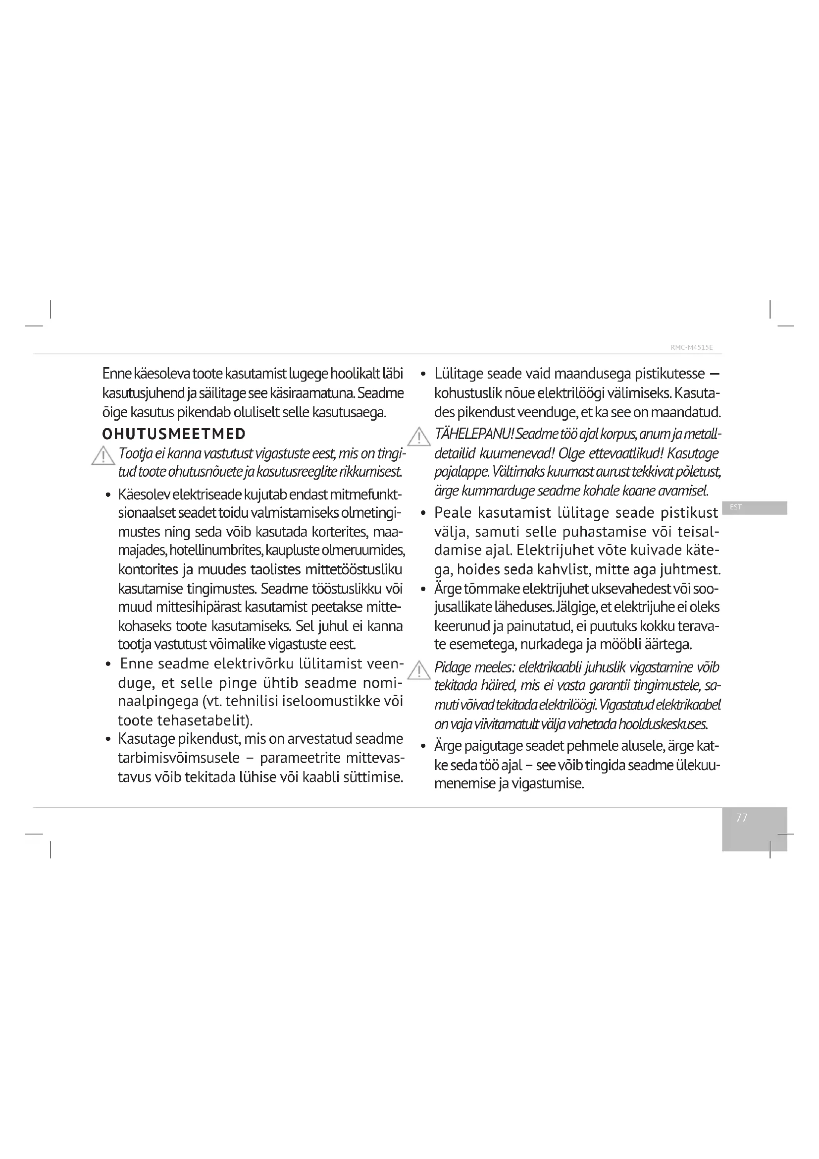 Peale kasutamist lülitage seade pistikust välja, samuti selle puhastamise või teisal- damise ajal. Elektrijuhet võte kuivade käte- ga, hoides seda kahvlist, mitte aga juhtmest.