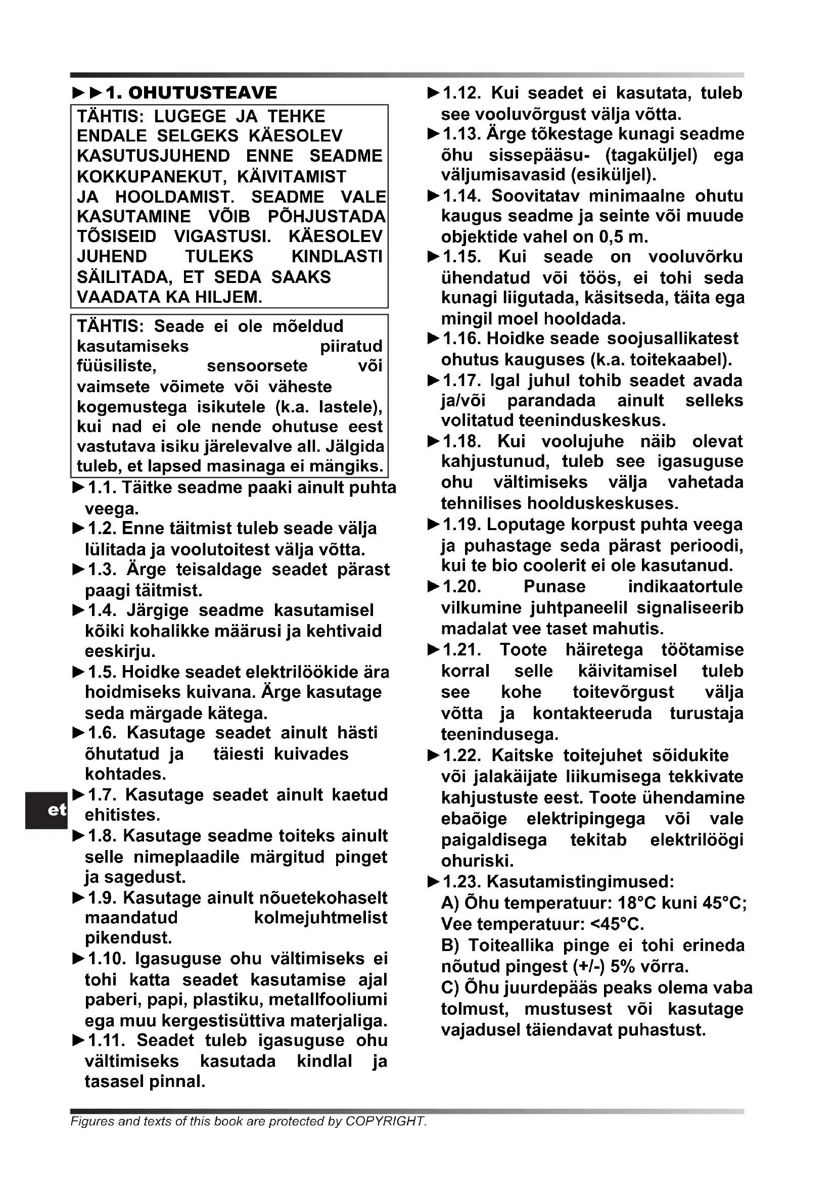 VAADATA KA HILJEM. TÄHTIS: Seade ei ole mõeldud kasutamiseks piiratud füüsiliste, sensoorsete või vaimsete võimete või väheste kogemustega isikutele (k.a. lastele), kui nad ei ole nende ohutuse eest vastutava isiku järelevalve all. Jälgida tuleb, et lapsed masinaga ei mängiks. ►1.1. Täitke seadme paaki ainult puhta veega. ►1.2. Enne täitmist tuleb seade välja lülitada ja voolutoitest välja võtta. ►1.3. Ärge teisaldage seadet pärast paagi täitmist. ►1.4. Järgige seadme kasutamisel kõiki kohalikke määrusi ja kehtivaid eeskirju. ►1.5. Hoidke seadet elektrilöökide ära hoidmiseks kuivana. Ärge kasutage seda märgade kätega. ►1.6. Kasutage seadet ainult hästi õhutatud ja täiesti kuivades kohtades. ►1.7. Kasutage seadet ainult kaetud ehitistes. ►1.8. Kasutage seadme toiteks ainult selle nimeplaadile märgitud pinget ja sagedust. ►1.9. Kasutage ainult nõuetekohaselt maandatud kolmejuhtmelist pikendust. ►1.10. Igasuguse ohu vältimiseks ei tohi katta seadet kasutamise ajal paberi, papi, plastiku, metallfooliumi ega muu kergestisüttiva materjaliga. ►1.11. Seadet tuleb igasuguse ohu vältimiseks kasutada kindlal ja tasasel pinnal. ►1.12. Kui seadet ei kasutata, tuleb see vooluvõrgust välja võtta. ►1.13. Ärge tõkestage kunagi seadme õhu sissepääsu- (tagaküljel) ega väljumisavasid (esiküljel). ►1.14. Soovitatav minimaalne ohutu kaugus seadme ja seinte või muude objektide vahel on 0,5 m. ►1.15. Kui seade on vooluvõrku ühendatud või töös, ei tohi seda kunagi liigutada, käsitseda, täita ega mingil moel hooldada. ►1.16. Hoidke seade soojusallikatest ohutus kauguses (k.a. toitekaabel). ►1.17. Igal juhul tohib seadet avada ja/või parandada ainult selleks volitatud teeninduskeskus. ►1.18. Kui voolujuhe näib olevat kahjustunud, tuleb see igasuguse ohu vältimiseks välja vahetada tehnilises hoolduskeskuses. ►1.19. Loputage korpust puhta veega ja puhastage seda pärast perioodi, kui te bio coolerit ei ole kasutanud. ►1.20. Punase indikaatortule vilkumine juhtpaneelil signaliseerib madalat vee taset mahutis. ►1.21. Toote häiretega töötamise korral selle käivitamisel tuleb see kohe toitevõrgust välja võtta ja kontakteeruda turustaja teenindusega. ►1.22. Kaitske toitejuhet sõidukite või jalakäijate liikumisega tekkivate kahjustuste eest. Toote ühendamine ebaõige elektripingega või vale paigaldisega tekitab elektrilöögi ohuriski. ►1.23. Kasutamistingimused: A) Õhu temperatuur: 18°C kuni 45°C; Vee temperatuur: <45°C. B) Toiteallika pinge ei tohi erineda nõutud pingest (+/-) 5% võrra. C) Õhu juurdepääs peaks olema vaba tolmust, mustusest või kasutage vajadusel täiendavat puhastust. Figures and texts of this book are protected by COPYRIGHT.et ►►2. LAHTIPAKKIMINE ►2.1. Eemaldage kõik seadme pakkimiseks ja saatmiseks kasutatud pakkematerjalid ja hävitage need vastavalt kehtivatele standarditele. ►2.2. Võtke kõik osad pakendist välja. ►2.3. Kontrollige, kas transpordi ajal on tekkinud kahjustusi. Kui seade näib olevat kahjustunud, teatage sellest kohe edasimüüjale, kellelt see on ostetud. ►►3. KOKKUPANEK Seade on teisaldamise hõlbustamiseks varustatud ratastega. Sõltuvalt mudelist, võivad rattad olla juba paigaldatud või need tuleb paigaldada. Seadme osad koos vastavate paigalduspoltidega on kõik pakendi sees (Joon. 1). ►►4. TÖÖ HOIATUS: Lugege palun hoolikalt enne seadme käivitamist peatükki „OHUTUSTEAVE”. HOIATUS: Kasutage rikete või muude hälvete vältimiseks ainult puhast vett. HOIATUS: Veenduge, kas juhtmestik on korralikult maandatud. Elektriühendus tuleb teha vastavalt kehtivatele riiklikele standarditele. Kasutage seadme toiteks ainult selle nimeplaadile märgitud pinget ja sagedust. MÄRKUS: Antud mudelid tuleb ühendada veevarustusega, ühendades toru liiteelemendiga (Joon. 10). ►►4.1. KÄIVITAMINE: ►4.1.1. Avage paagi luuk (Joon. 2). ►4.1.2. Täitke paak veega (Joon. 3). Vee nivoo peab kõigi ohtude vältimiseks jääma seadme küljel oleva astmelise skaala MIN ja MAX tähiste vahele (Joon. 4). ►4.1.3. Avage paagi luuk (Joon. 5). ►4.1.4. Ühendage toitepistik vooluvõrku (Joon. 6). ►4.1.5. Vajutage seadme käivitamiseks nupule ON/OFF (Joon. 9). ►►4.2. MUDELI BC 60