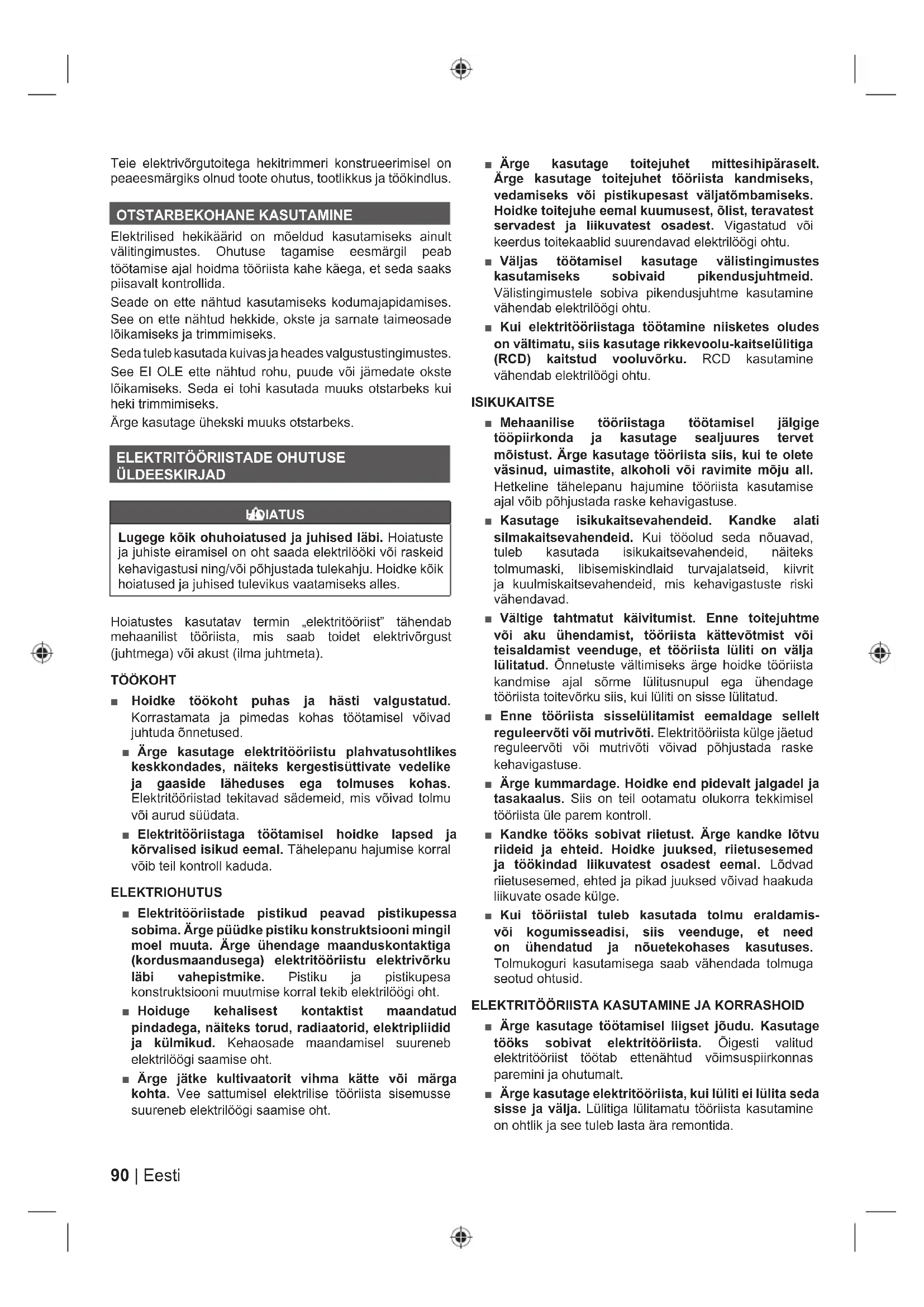 ■ Enne tööriista reguleerimist, tarvikute vahetamist või hoiustamist võtke toitejuhe pistikupesast välja või eemaldage aku. Need ennetavad ohutusmeetmed vähendavad tööriista tahtmatu käivitumise riski. ■ Hoidke kasutuses mitteolevaid elektritööriistu lastele kättesaamatus kohas ja ärge lubage elektritööriista mitte tundvaid või kasutusjuhendiga mitte tutvunud isikuid elektritööriista kasutada. Oskamatu kasutaja käes olev elektritööriist on ohtlik. ■ Mehaaniliste elektritööriistade hooldus. Kontrollige liikuvate osade mittetsentreeritust ja kinnitumist, osade vigastusi ning tehke kindlaks muud seisundid, mis võivad mõjustada elektritööriista tööd. Kui mõni osa on vigastatud, siis laske elektritööriist enne kasutamist ära parandada. Halvasti hooldatud elektritööriistad põhjustavad palju õnnetusi. ■ Hoidke lõiketerad teravad ja puhtad. Teravate lõiketeradega ja nõuetekohaselt hooldatud lõikeriistad jäävad harvemini kinni ning neid on kergem kontrolli all hoida. ■ Tööriistade, tarvikute, otsakute ja muude lisaseadmete kasutamisel juhinduge nende kasutusjuhenditest, võttes arvesse tehtavat tööd ja tööolusid. Tööoperatsiooniks mitte ettenähtud tööriista kasutamine võib tekitada ohtliku olukorra. TEENINDAMINE ■ Laske oma elektrilist tööriista hooldada väljaõppinud teenindustöötajal; remontimisel tohib kasutada ainult originaalvaruosi. See tagab elektriseadme ohutuse. HEKITRIMMERI OHUTUSEESKIRJAD ■ Hoidke kõik kehaosad lõiketerast eemal. Ärge üritage eemaldada ega hoida lõigatavat materjali sel ajal kui lõiketerad liiguvad. Kui oks jääb terade vahele kinni, siis lülitage trimmer välja. Hetkeline tähelepanu hajumine seadme kasutamise ajal võib põhjustada raske kehavigastuse. ■ Teisaldamise ajaks lülitage hekitrimmer välja ja kandke seda käepidemest. Hekitrimmeri teisaldamisel või hoiulepanekul paigaldage latile alati kaitsekate. Hekitrimmeri õige käsitsemine vähendab lõiketeradega seotud kehavigastusi. ■ Hoidke tööriista kinni ainult isoleeritud haardepindadest, sest lõiketera võib sattuda kokkupuutesse varjatud juhtmega või tööriista enda toitejuhtmega. Kui tööriist satub kontakti pinge all olevate juhtmetega, jäävad tööriista isoleerimata metallosad pinge alla ja kasutaja võib saada elektrilöögi. ■ Hoidke toitejuhe lõikamispiirkonnast eemal. Töötamise ajal võib toitejuhe olla põõsaste varjus ja seetõttu võite sellesse juhuslikult sisse lõigata.